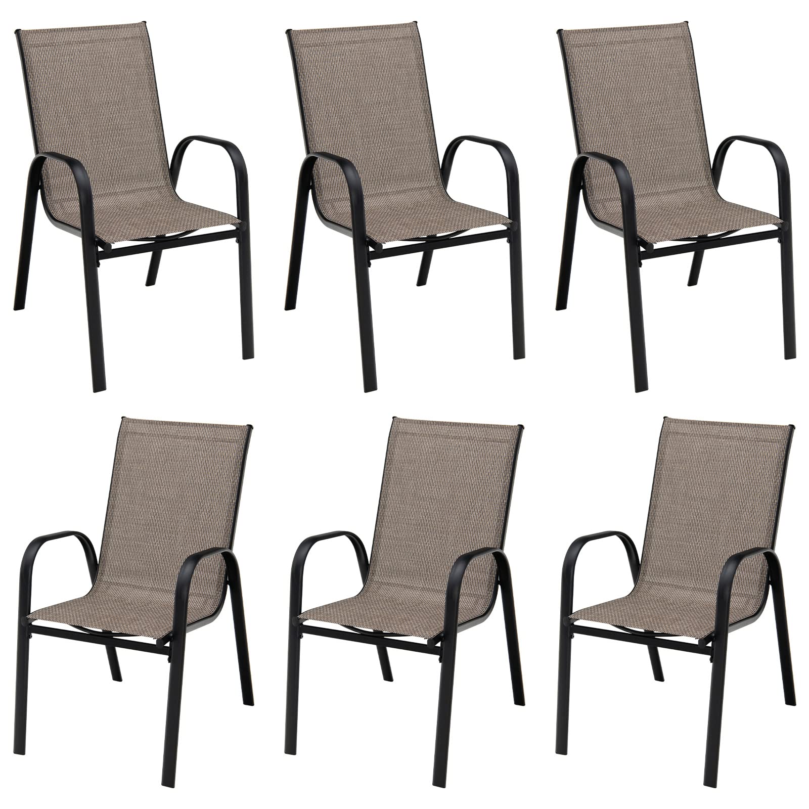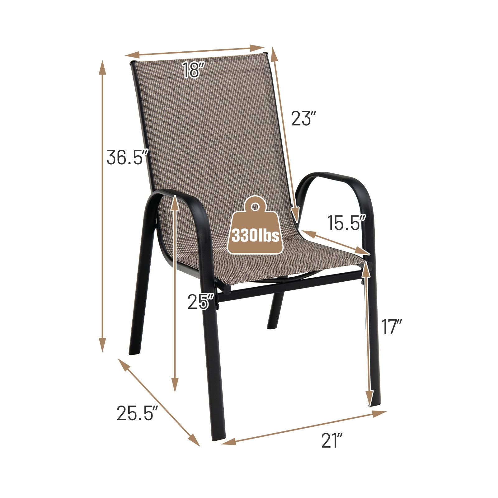 With a 17"seat height from the ground, these patio chairs match your dining table (not included) perfectly. In addition, the breathable fabric, wide backrests, and curved armrests endow the maximum coziness to these patio bistro chairs. When you sit on these armchairs, the sturdy and rustproof steel frame will support you safely and steadily. If you want to create more outdoor space for your kids to run, just stack these patio dining chairs into a compact size.