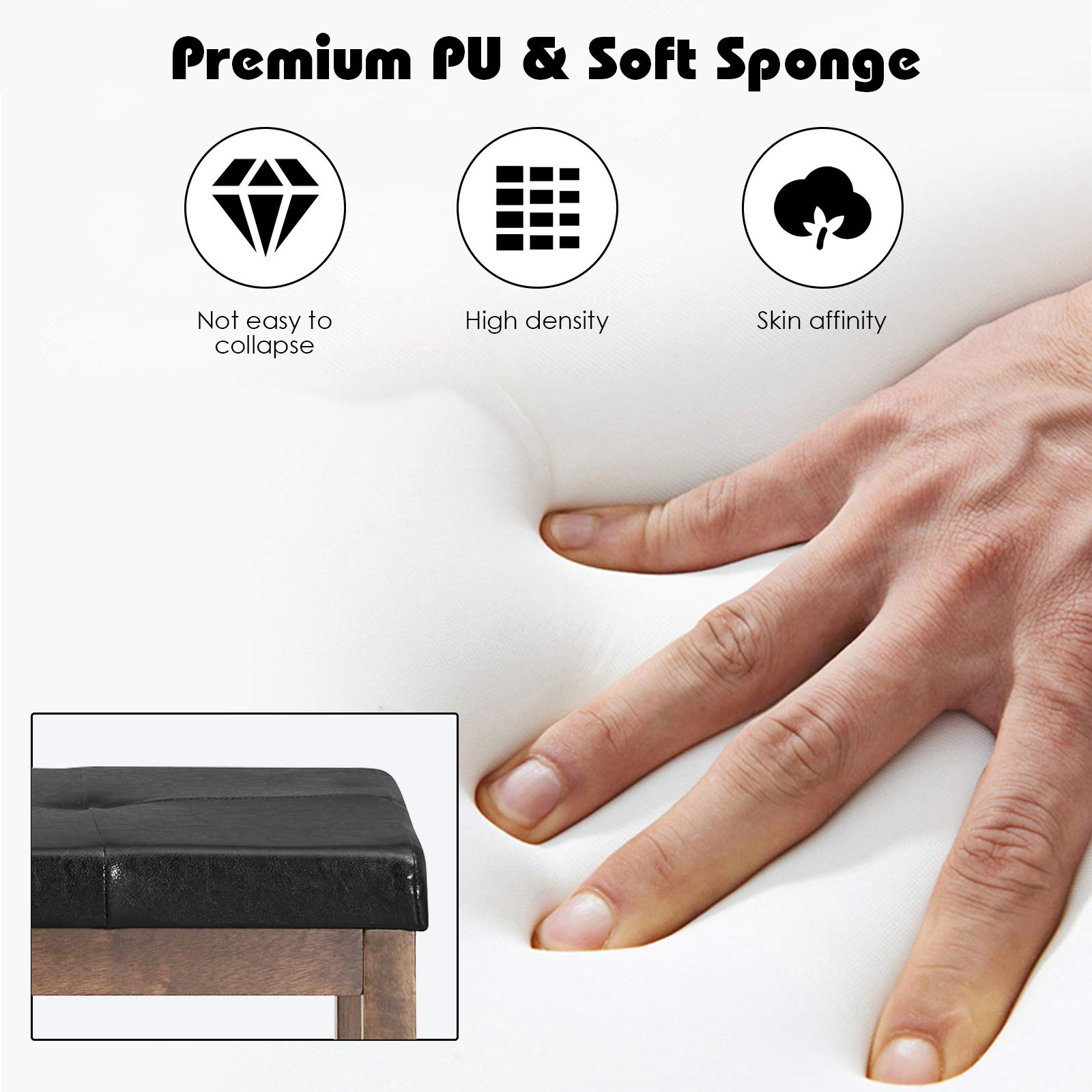 - Comfy PU Seating: This heavy duty shoe bench also packs a soft PU leather seat, which is stuffed with a high-density and superior-resilient sponge. Thick padding allows you to sit comfortably while changing or adjusting your shoes.