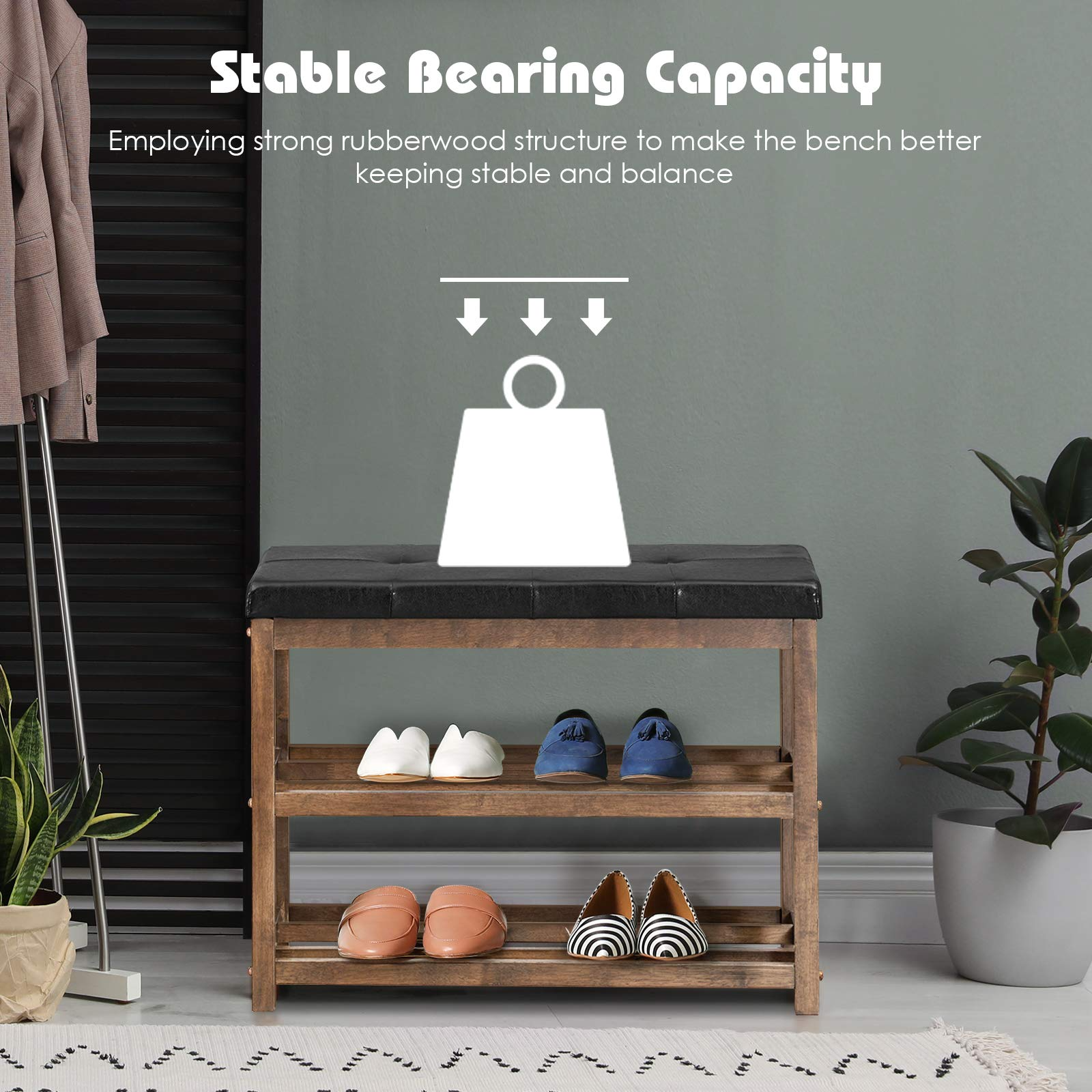 - 3-Tier Entryway Bench : A multifunctional shoe rack bench maximizes shoe storage with vertical arrangements and declutters your shoe piles for a neat and tidy entryway. And the hollow shelves deliver a shoes-friendly accommodating environment.