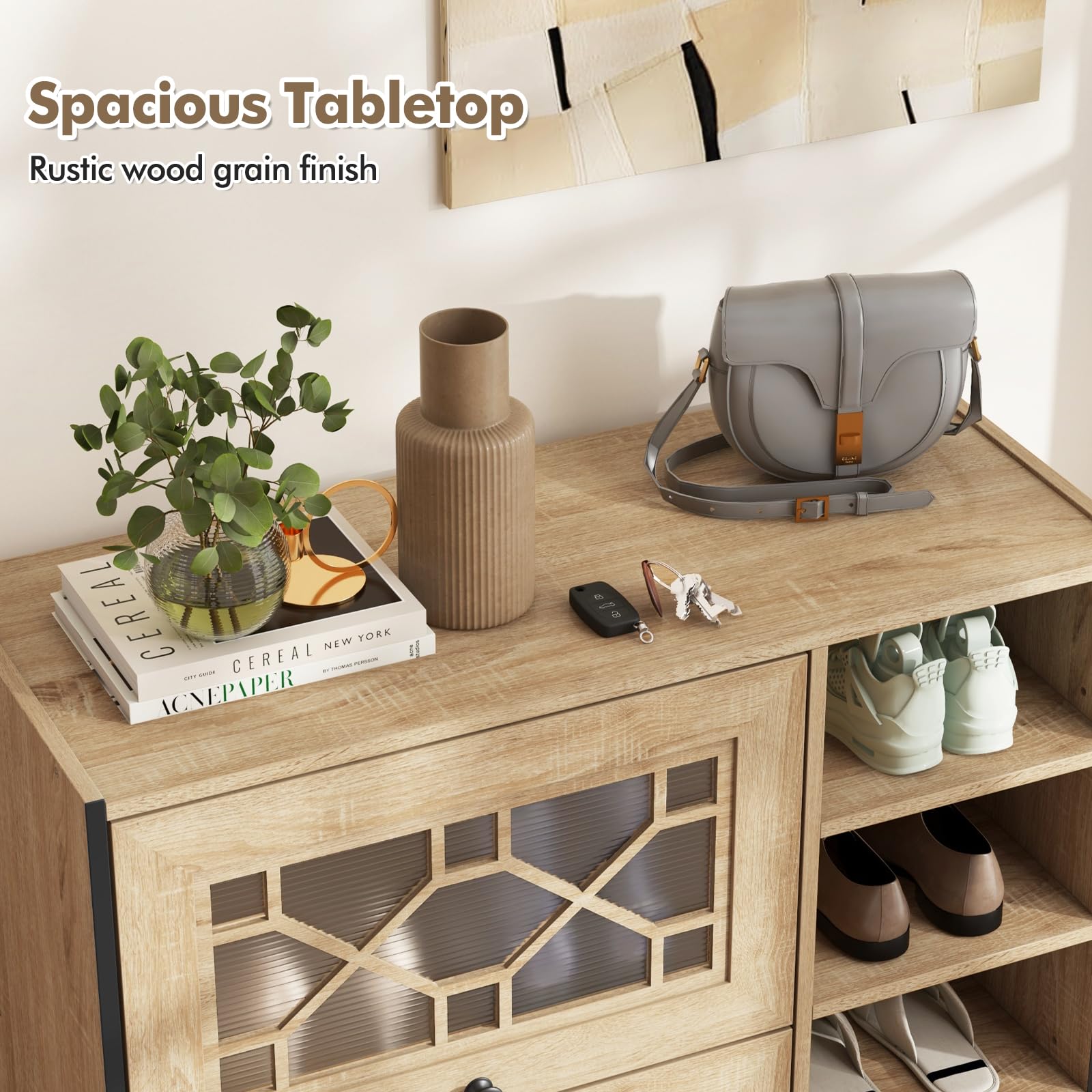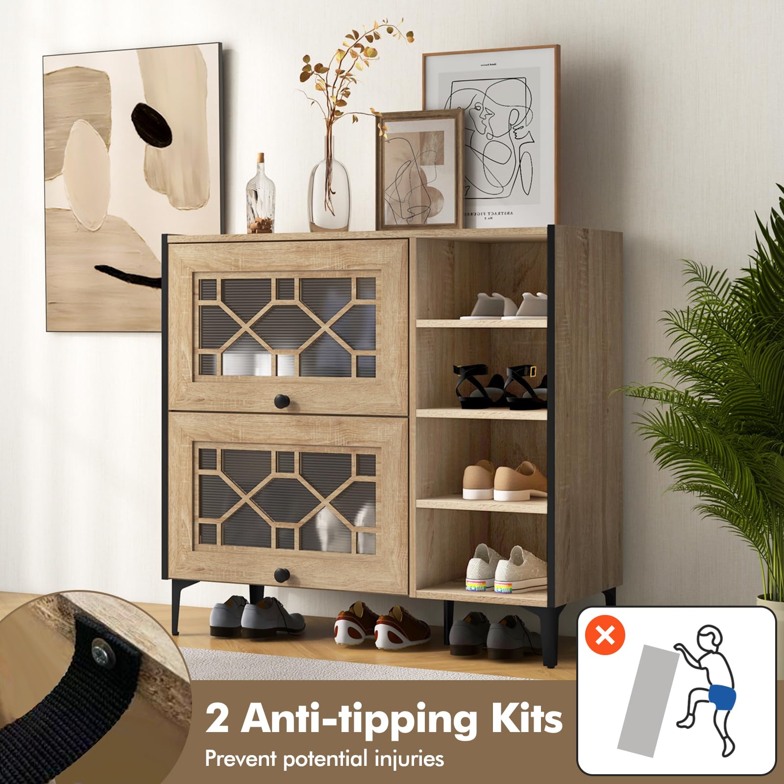 Discover the magic of clutter-free living with this stunning mid-century modern shoe cabinet. Boasting ample storage spaces, two 3-position adjustable shelves, and chic see-through doors, this piece isn’t just furniture but a lifestyle upgrade. From stylishly stashing your shoes to enhancing your home with its rustic allure, here’s your chance to redefine convenience. Worried about safety? We’ve got you covered with essential anti-tipping kits to protect your loved ones. Elevate your entryway and protect your floors with its sturdy design and floor-friendly pads. Not just for shoes - perfect for books and nick-nacks too! Transform your storage into a statement today!