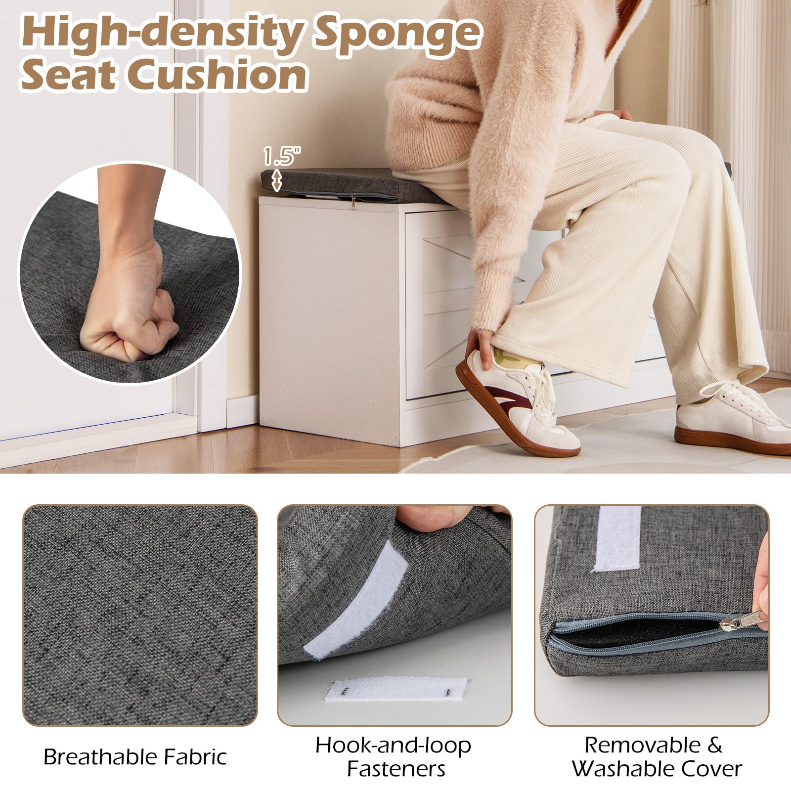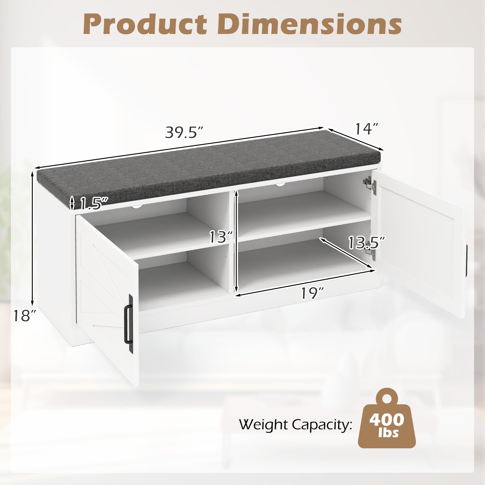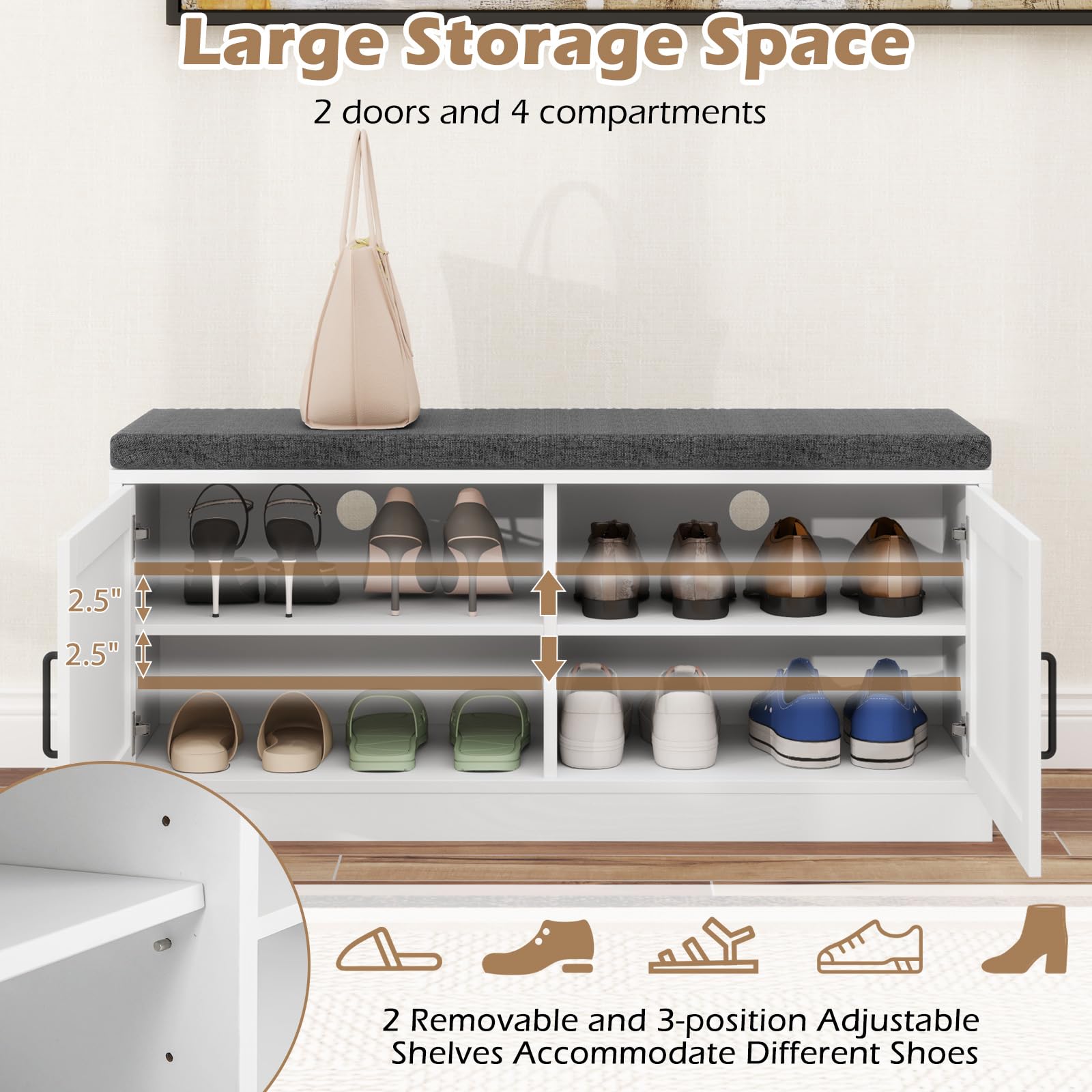 With its farmhouse charm and practical design, this shoe storage bench not only solves storage problems but also enhances the look of any room. The soft sponge cushioned top provides a comfortable seating area, transforming everyday shoe-wearing into a luxurious experience. The entryway bench includes 2 rustic barn doors that seamlessly conceal 4 compartments, ensuring your entryway or bedroom stays clutter-free and elegant. Besides, the removable and adjustable shelves inside allow you to customize the space according to the sizes of your shoes or storage needs.