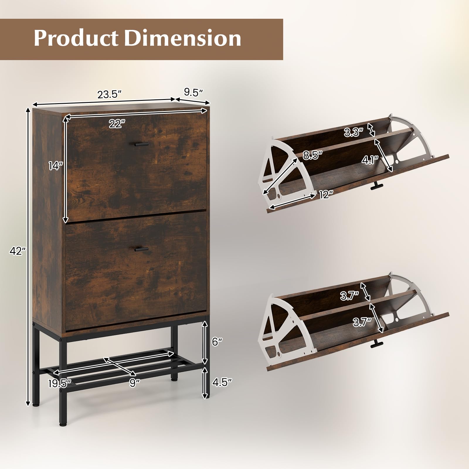 Boasting a flexible and space-efficient design, this freestanding shoe cabinet is the perfect solution for organizing your footwear in small living spaces. The shoe organizer includes 2 flip drawers with shelves featuring adjustable and removable design, allowing you to easily store shoes of different heights. Additionally, the top and bottom shelves provide extra storage space for other items. With an anti-toppling device and adjustable foot pads for stability, this shoe rack cabinet offers both functionality and security. Its versatile appearance makes it a stylish addition to any room, enhancing the overall look of your home whether placed in the entryway, living room, or bedroom.