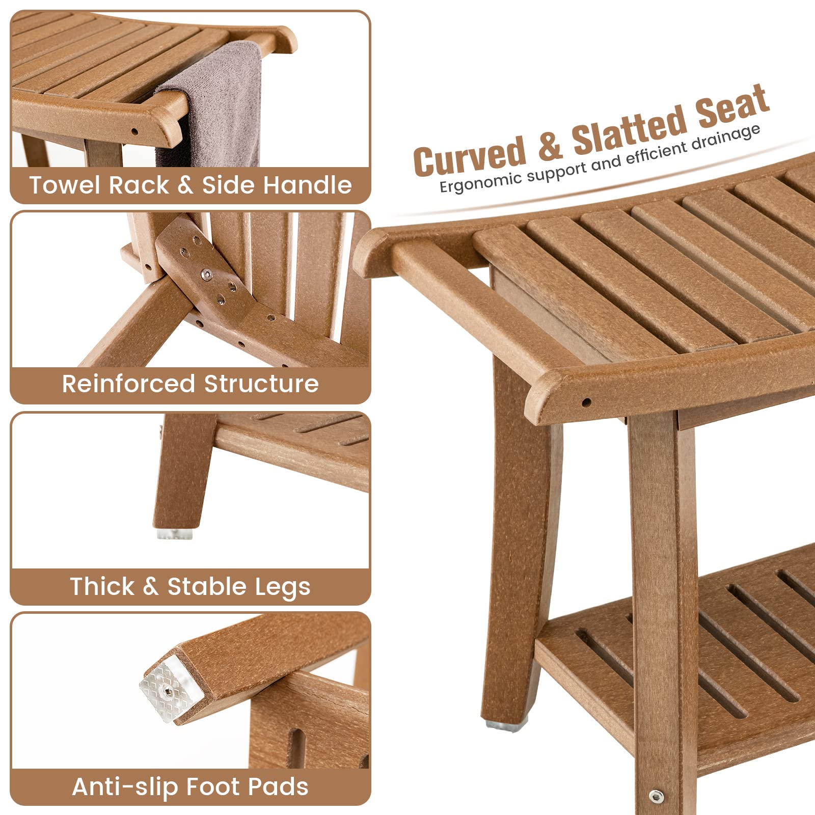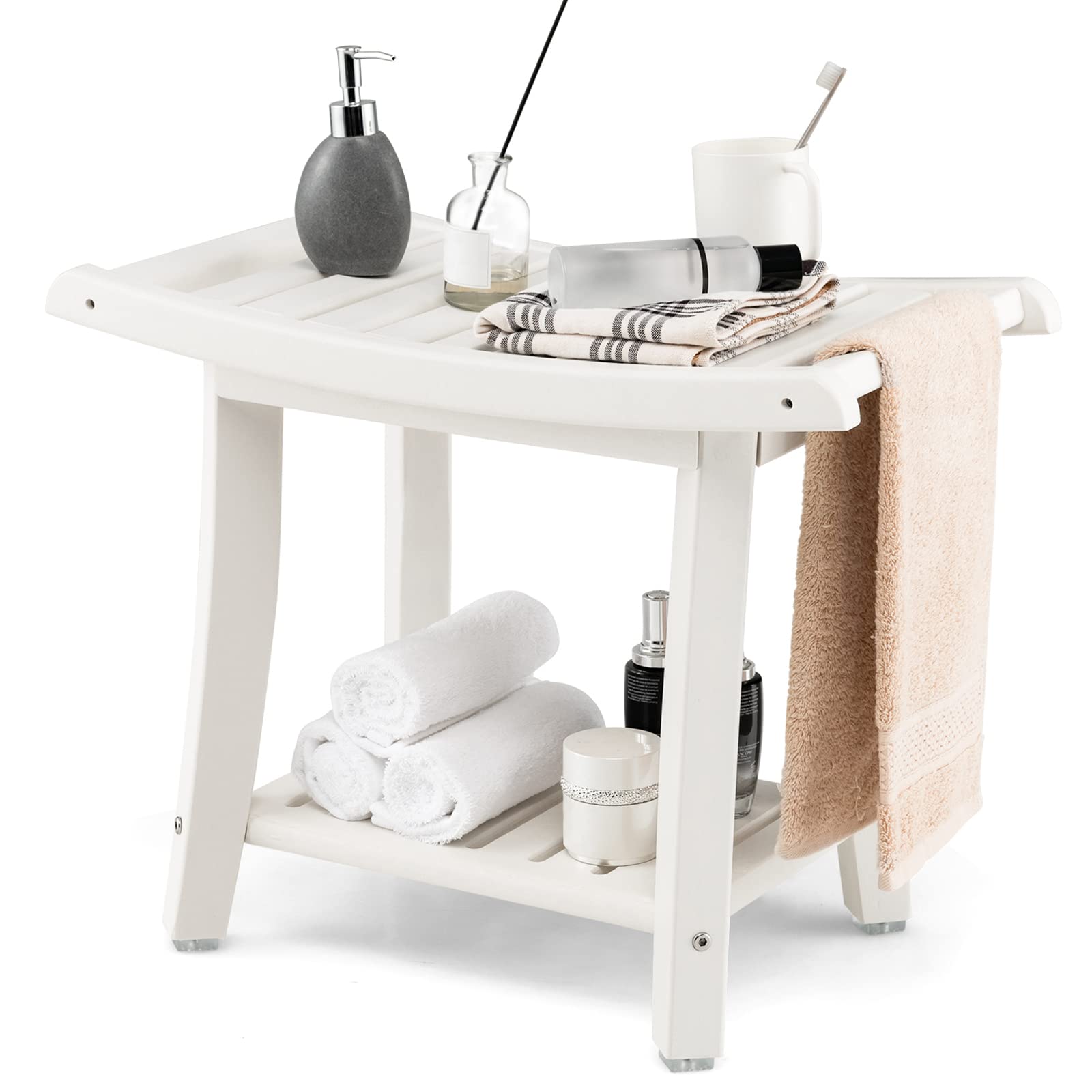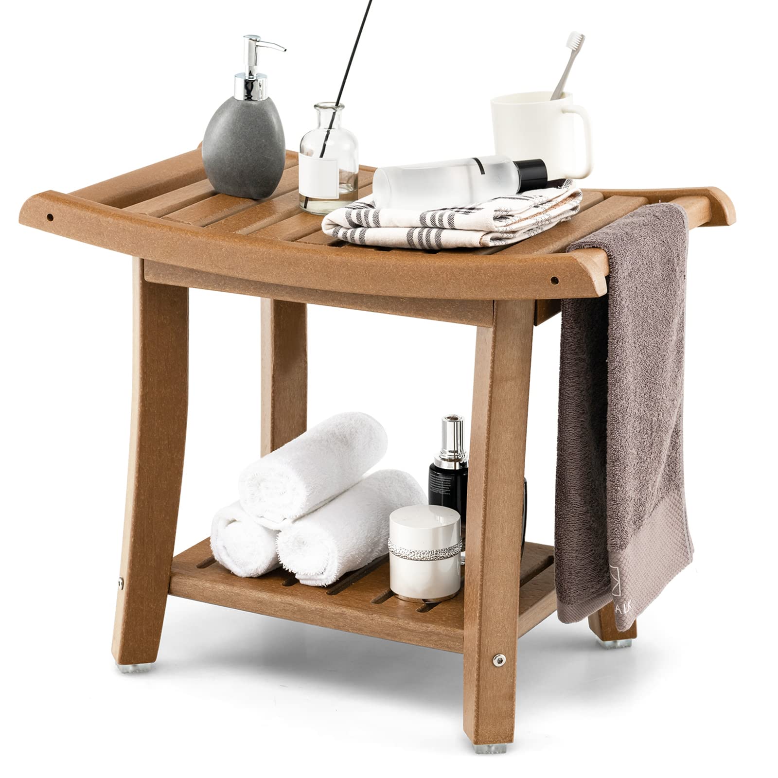Made of high-quality HDPE material with strong bonding, this shower stool ensures high deformation resistance, which can serve you for a long time. The curved legs make the shower stool more stable, and the bottom anti-slip foot pads prevent it from slipping away for high safety. Besides, the curved seat with rounded corners and burr-free edges make the shower bench safer to use. This 2-tier bath stool with a shelf provides ample storage space for bath products or other items. It is perfect to be used by the pool, sauna, or hot tub, or in the shower room, entryway, bedroom, living room, etc.