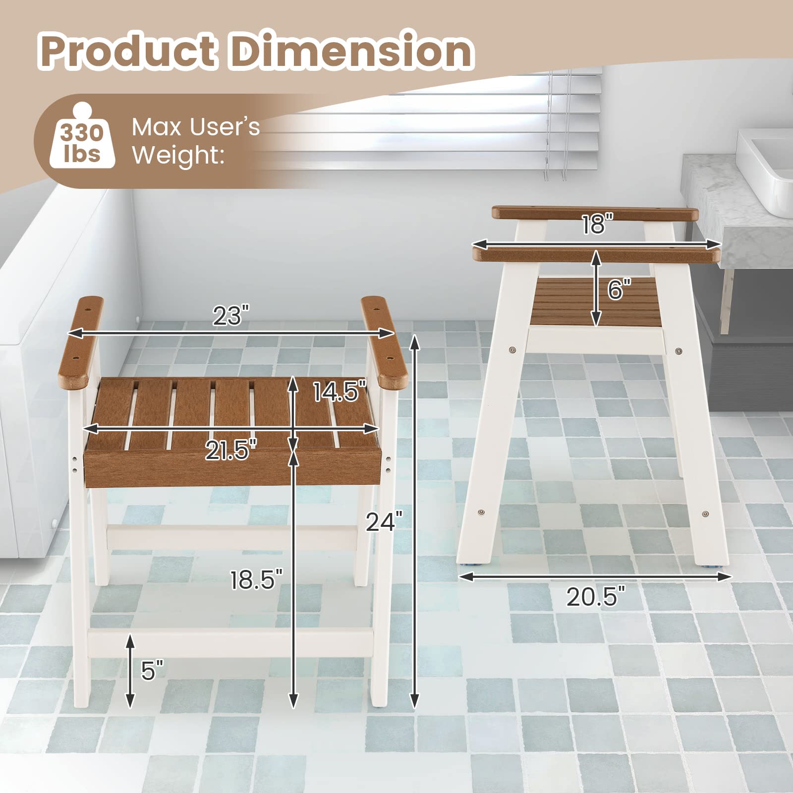 - Easy to Use & Maintain: The slatted design is able to avoid water accumulation, making it easier to use the bath chair with arms. This HDPE shower bench won't need any hassle maintenance compared to wooden or bamboo shower benches. Overall dimensions: 23" x 20.5" x 24" (L x W x H). Net Weight: 20 lbs.