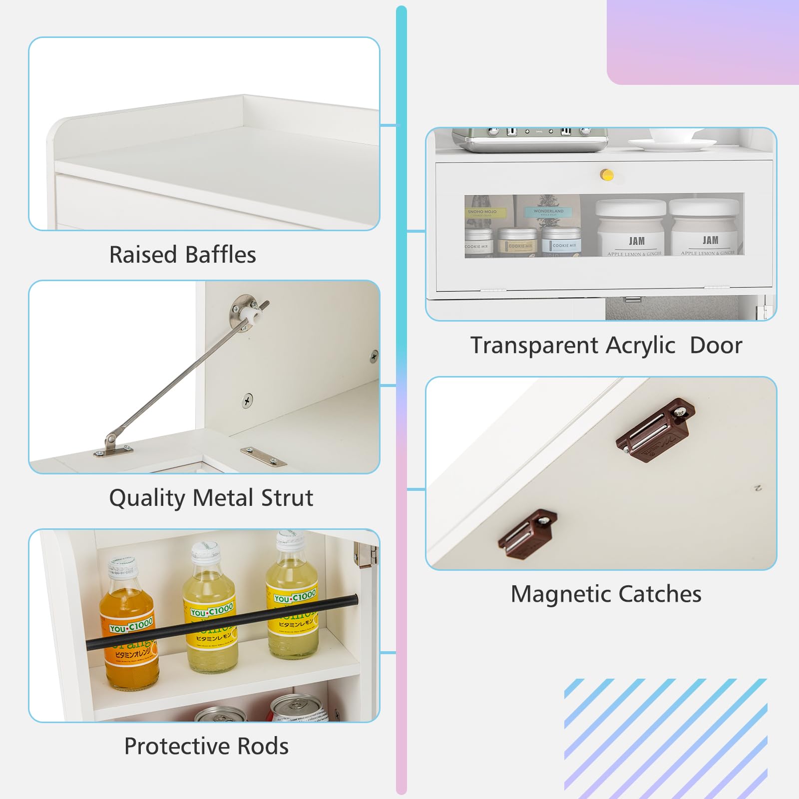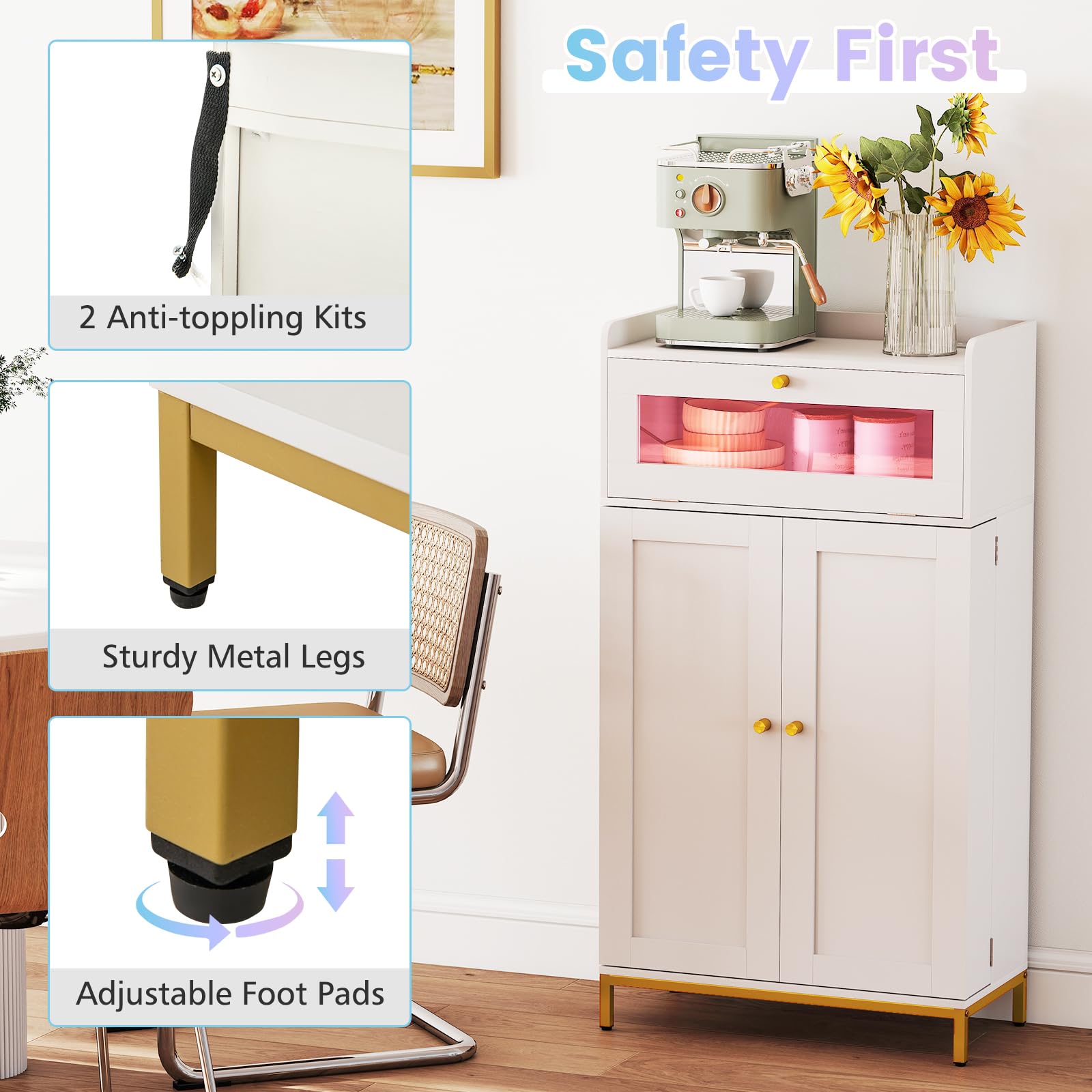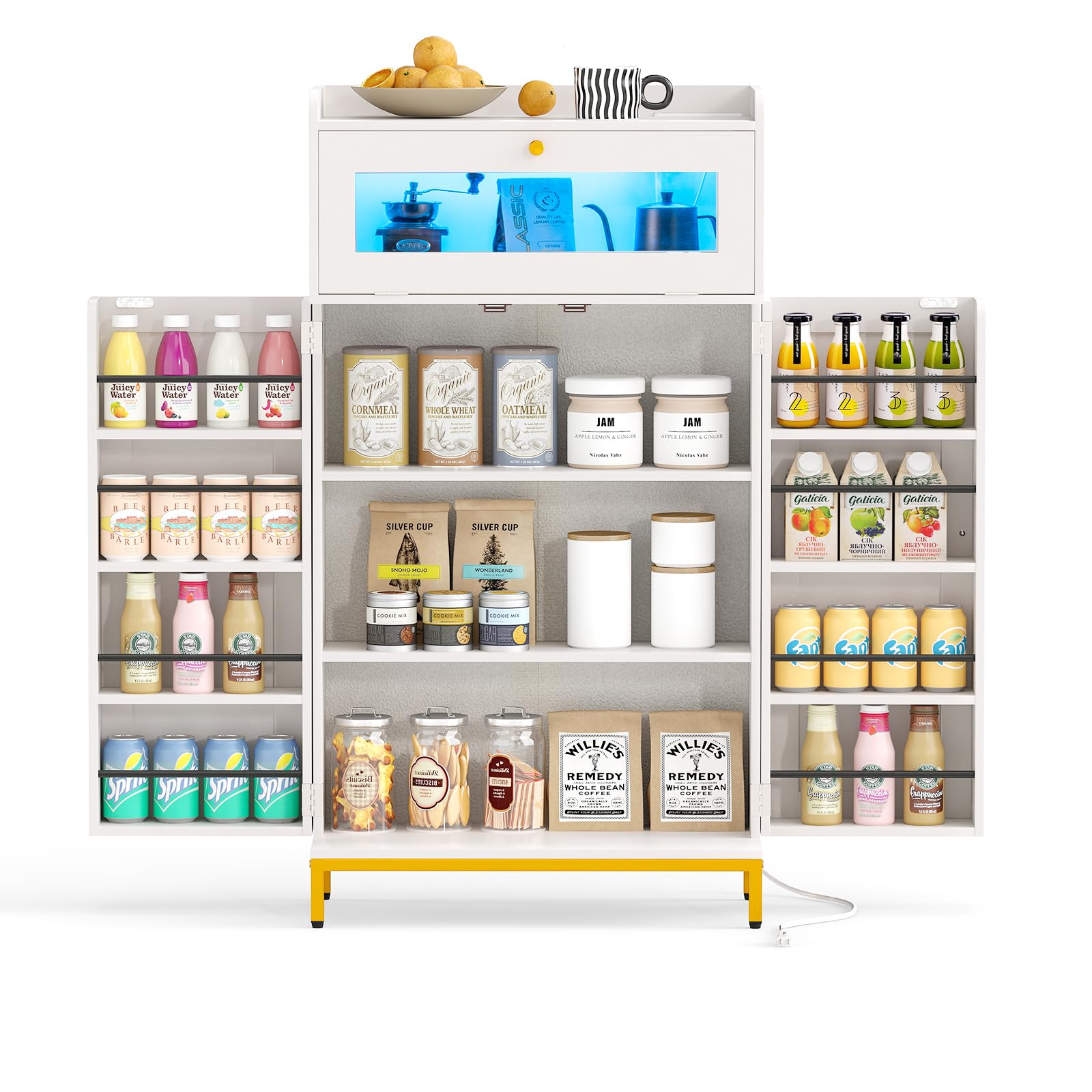 With an adjustable multi-color LED light strip, you can change the ambiance to suit occasions. What’s more, the built-in charging station is cleverly integrated to keep your devices powered with ease, featuring both USB and Type-C ports alongside traditional AC outlets. The kitchen buffet transcends ordinary storage solutions by offering a well-designed space with a spacious top, a drop-down door cabinet, and multiple shelves that provide extensive room. Safety and stability are paramount, delivered through robust metal legs and anti-toppling kits, ensuring peace of mind in household setup. The food cabinet complements various interior decorations with its sleek and contemporary design, and is ideal for those who appreciate a tidy environment and modern conveniences.