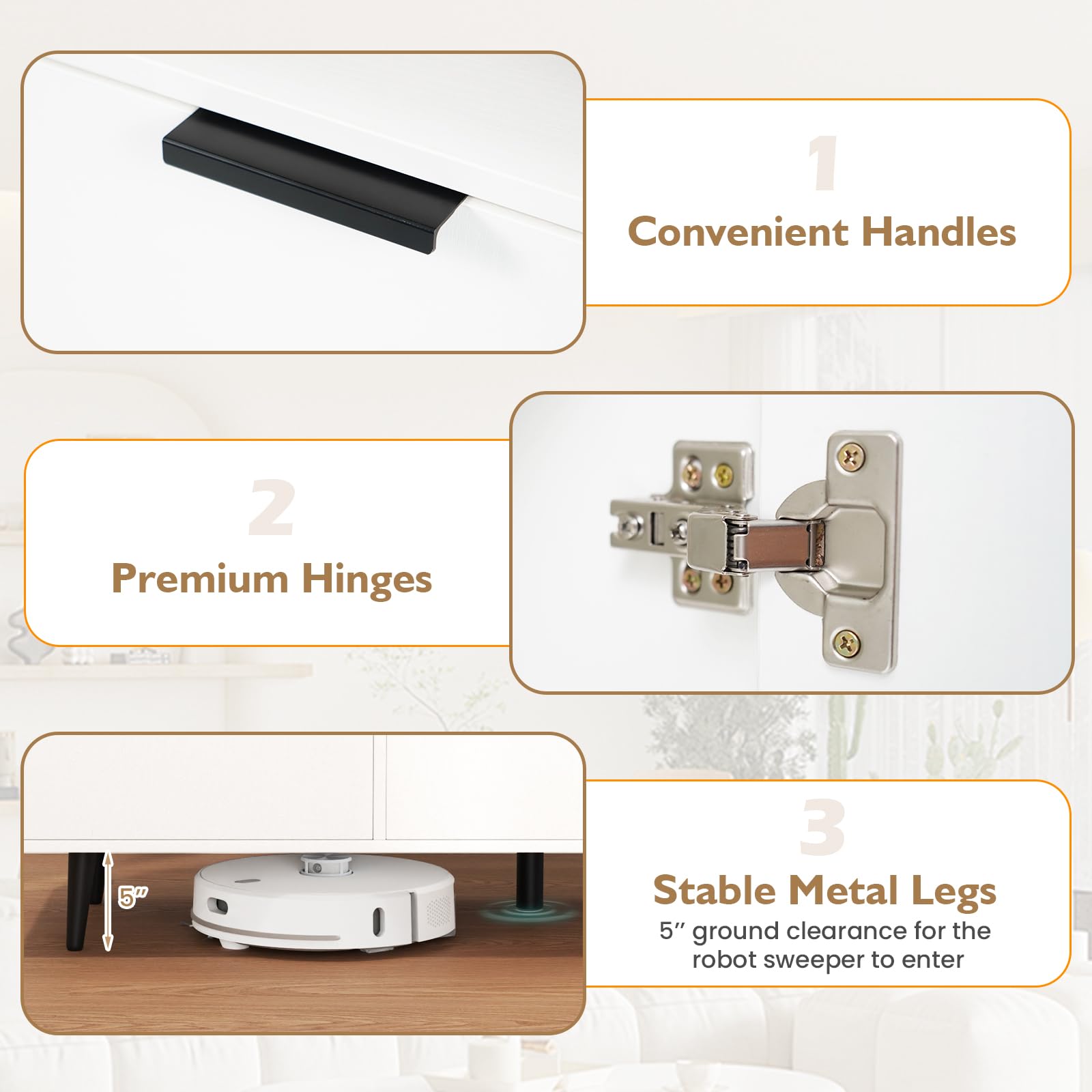 - [Stable Construction]: Boasting a sturdy construction that can support up to 350 lbs, this sideboard buffet cabinet is built to last. Additionally, the legs are raised 5” off the ground, making it a breeze to clean underneath with a robot sweeper.