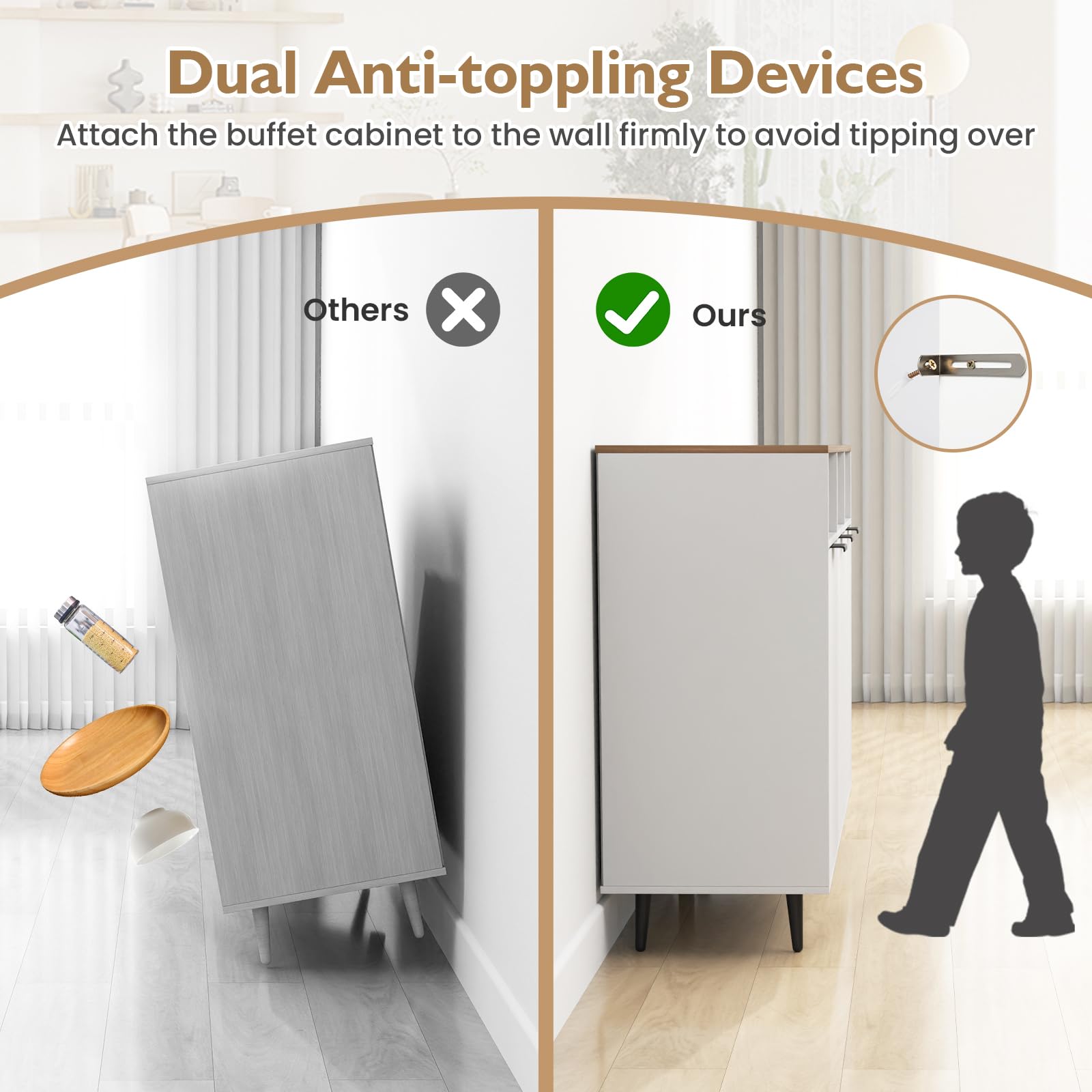 - [Enhanced Safety]: Safety is paramount with 2 anti-toppling devices that attach the buffet cabinet to the wall firmly to avoid tipping over, ensuring that your space remains secure and hazard-free. The high-quality hinges on the cabinet doors add an extra layer of safety and convenience.