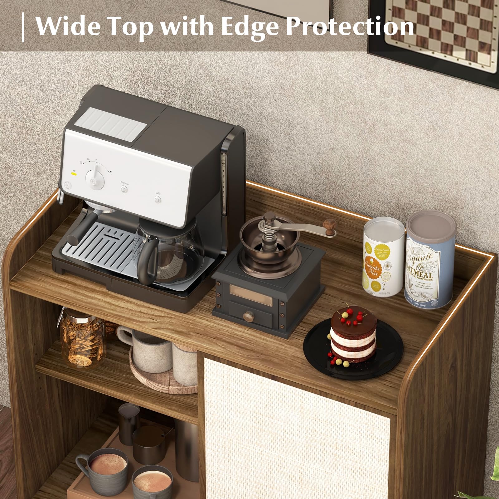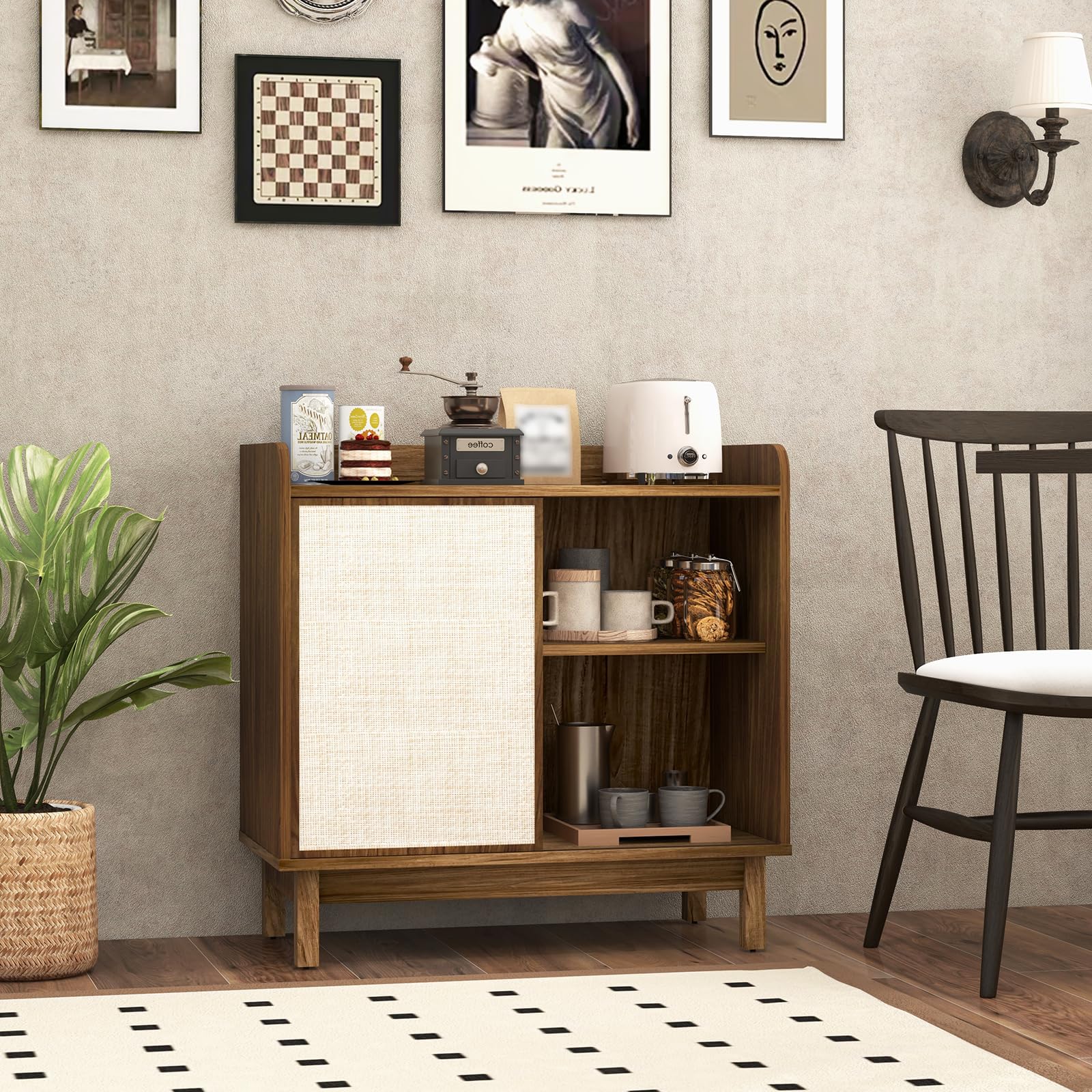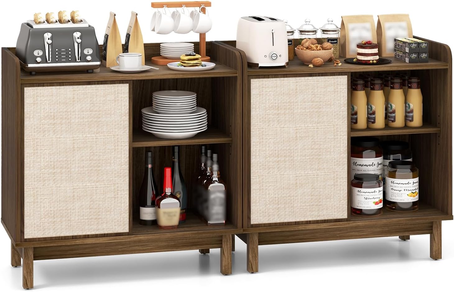 This buffet sideboard features a sliding door design, along with 2 adjustable shelves, offering flexible storage space for dishes, tableware, seasonings and more. Made of thickened board with sturdy support leg, the storage cabinet is built to last. Also, there are anti-tip kits and non-slip foot pads for unparalleled stability. With decorative weaving rattan design, the sideboard cabinet will match perfectly with your kitchen, dining room, living room, coffee bar and more.