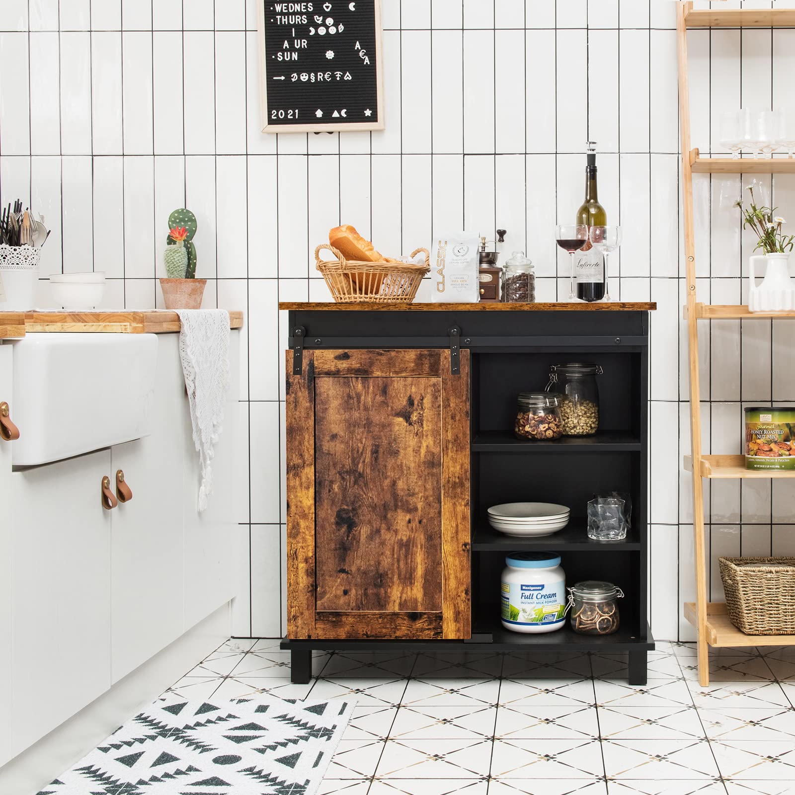 Our standing cabinet is designed with a storage cabinet with 3 tier shelves on the right side, while a wine bottle organizer and an open storage cabinet on the left side. You can store various daily items on it, including your coffee machine. Besides, spacious cabinet top with high load capacity also offers additional storage space. The sideboard also features a slide barn door to add charms. It can serve as a kitchen buffet cabinet, dining room cupboard and a living room cabinet. Moreover, solid frame and anti-toppling device keep it stable and sturdy. Furthermore, it easy to install and maintain.