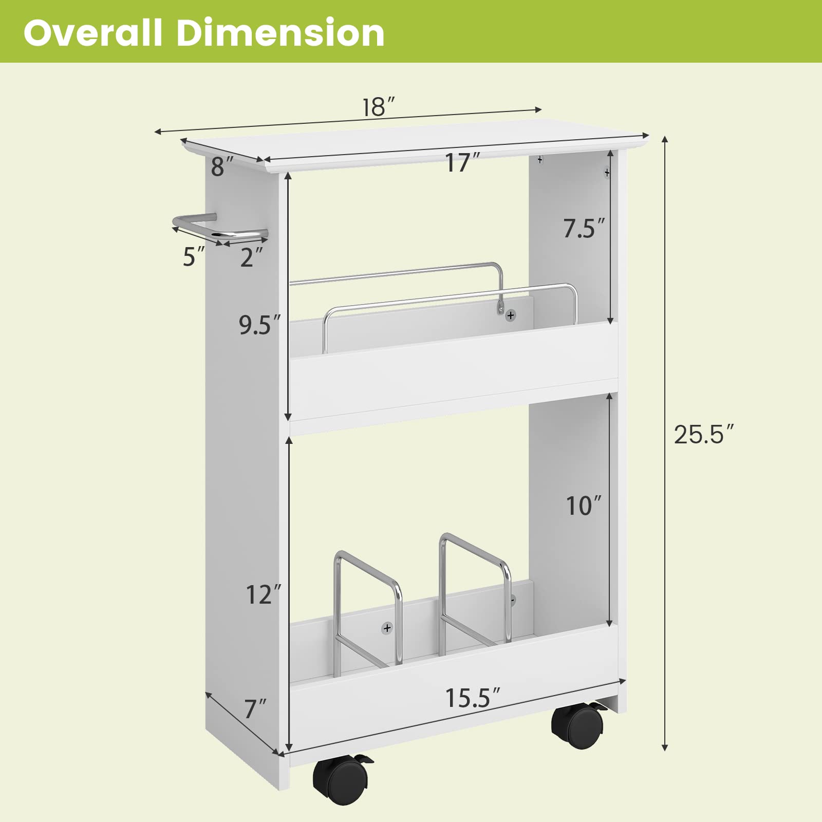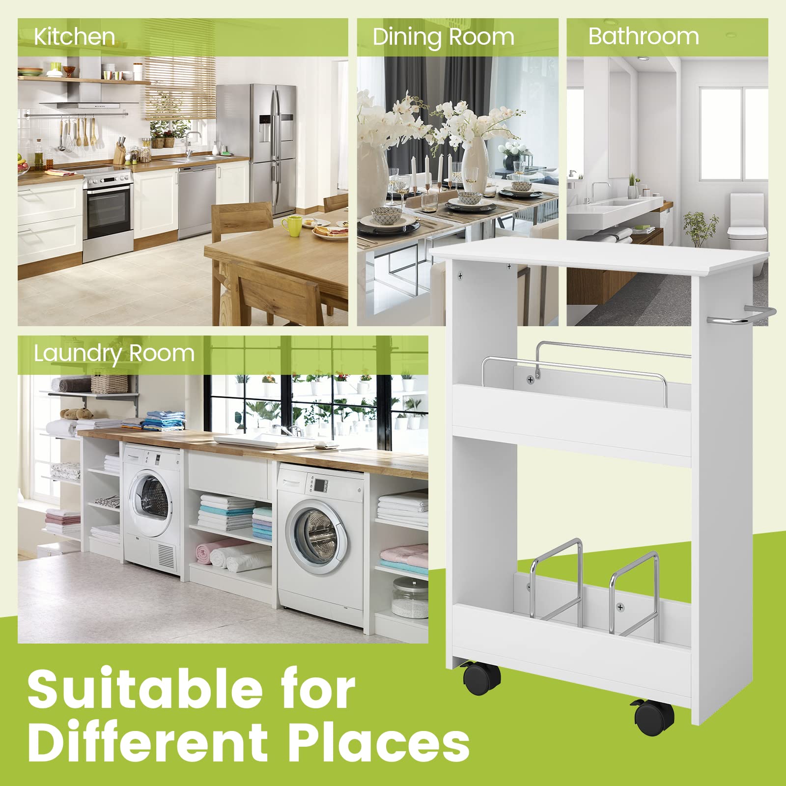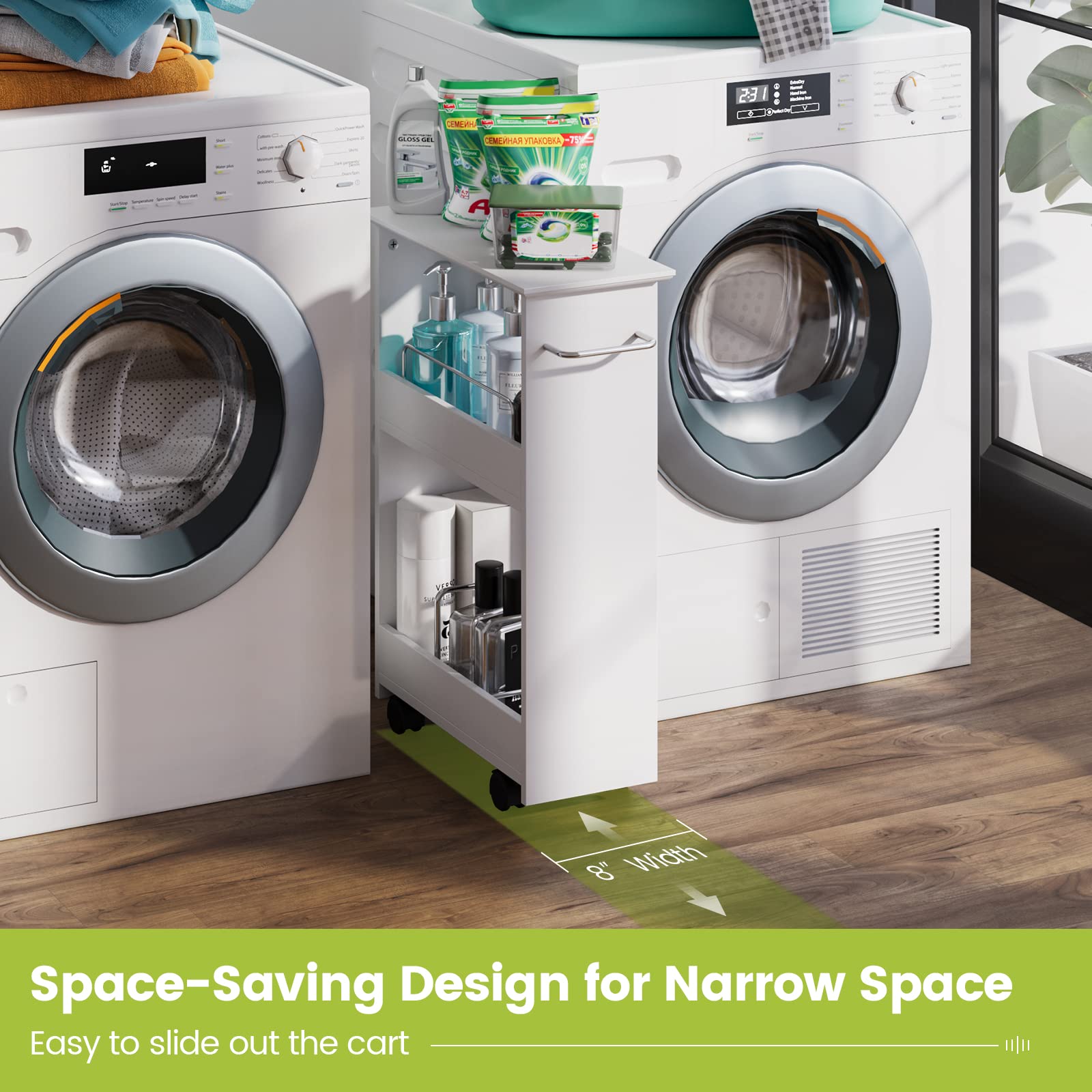 [Slide-out Design to Save Space]: Our slim storage cart with 8” width won’t occupy too much floor space and is suitable for different places, such as kitchen, dining room, bathroom or laundry room. Therefore, you can place it in any narrow corner to save space and effortlessly slide out the cart to acquire what you need.