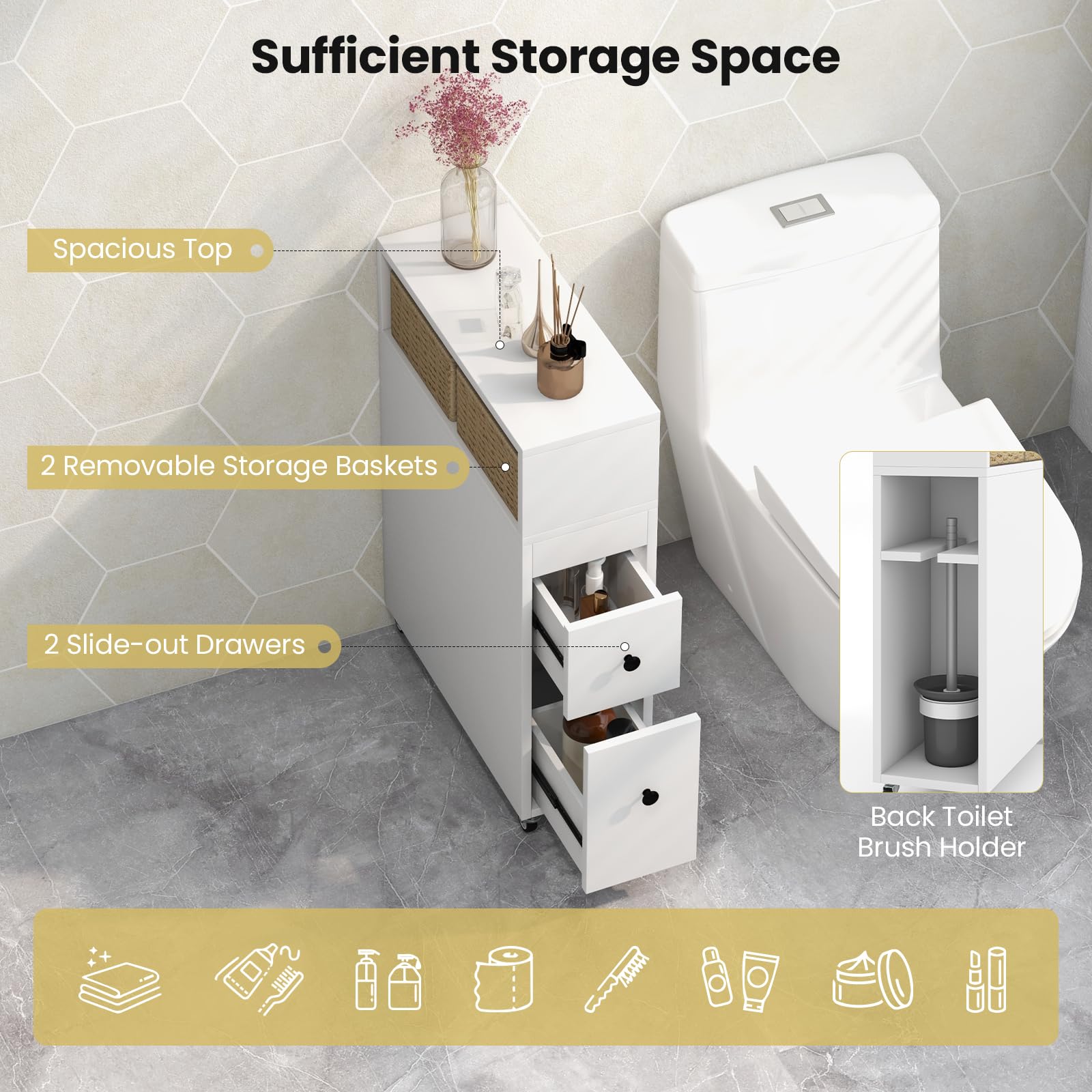- Ample Storage Space: This narrow bathroom floor cabinet provides sufficient storage with its spacious top, 2 slide-out drawers, and a back toilet brush holder. Store toilet paper, daily hygiene products, cleaning supplies, and more. The open shelf also includes 2 removable storage baskets for easy access to additional storage.