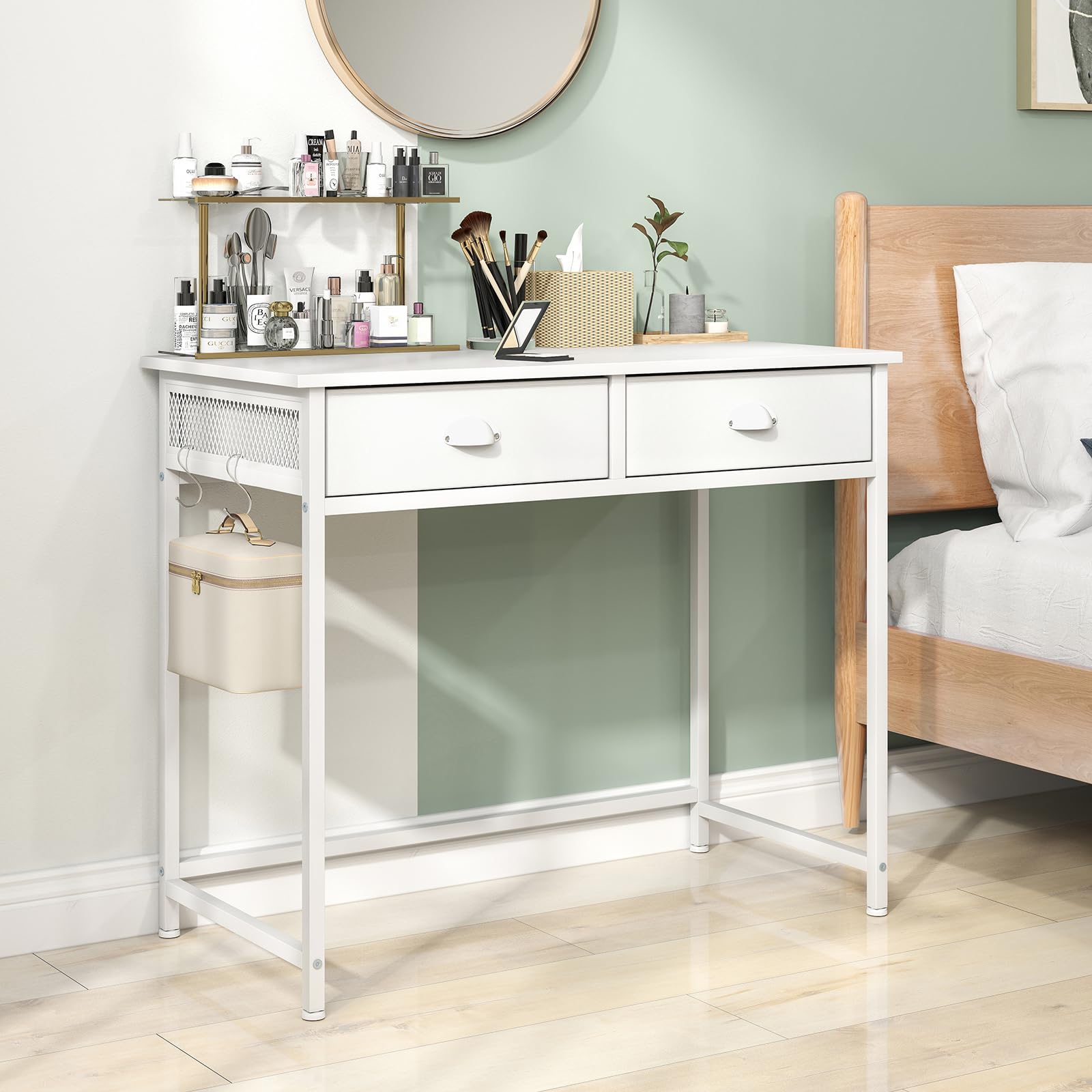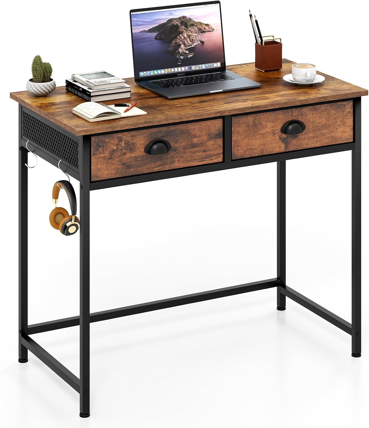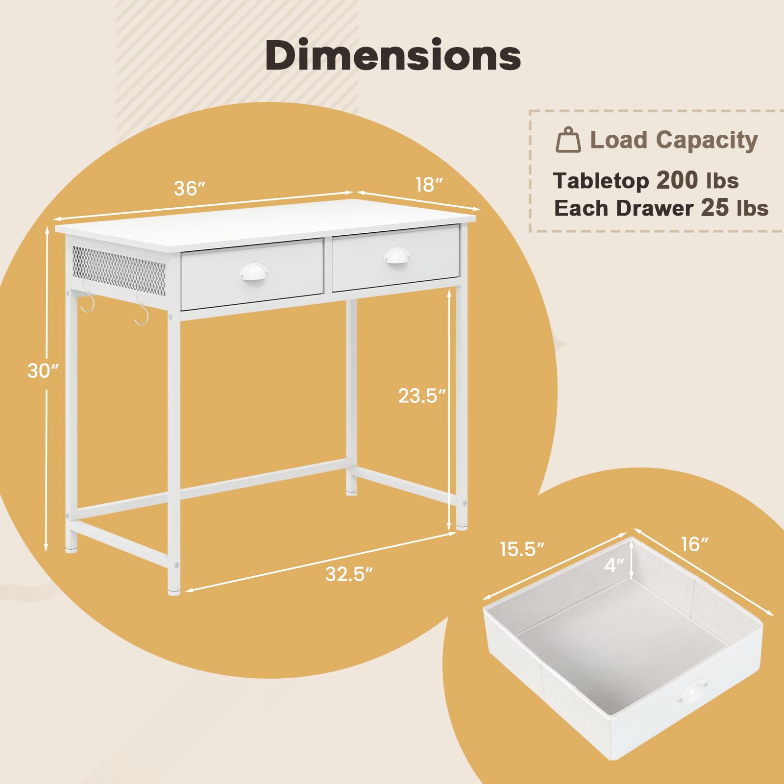 Giantex Small Computer Desk with Fabric Drawers, 36 Inch Home Office Desk with 4 Hanging Hooks & Metal Frame