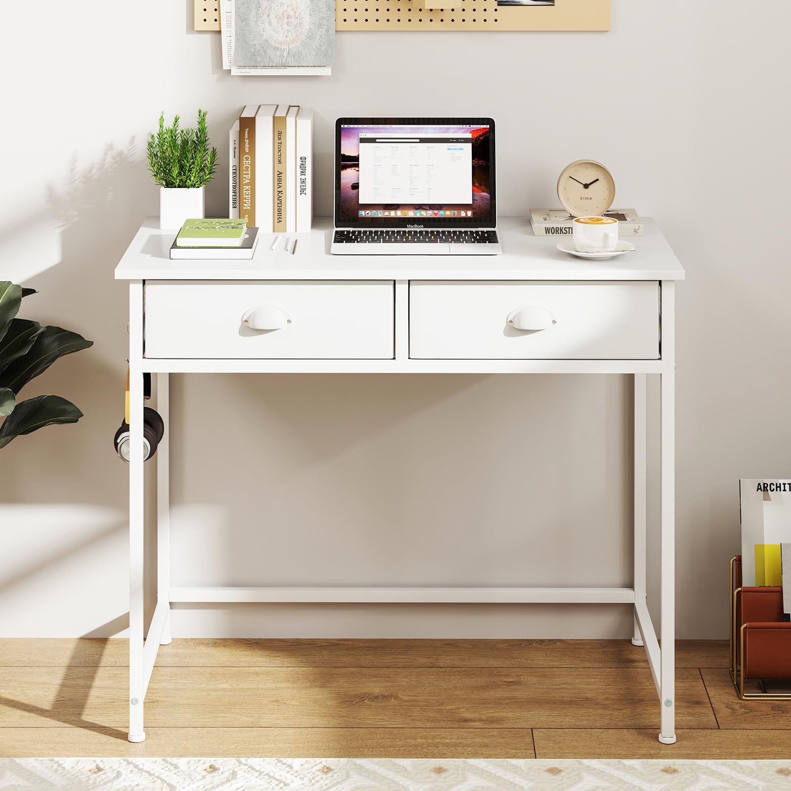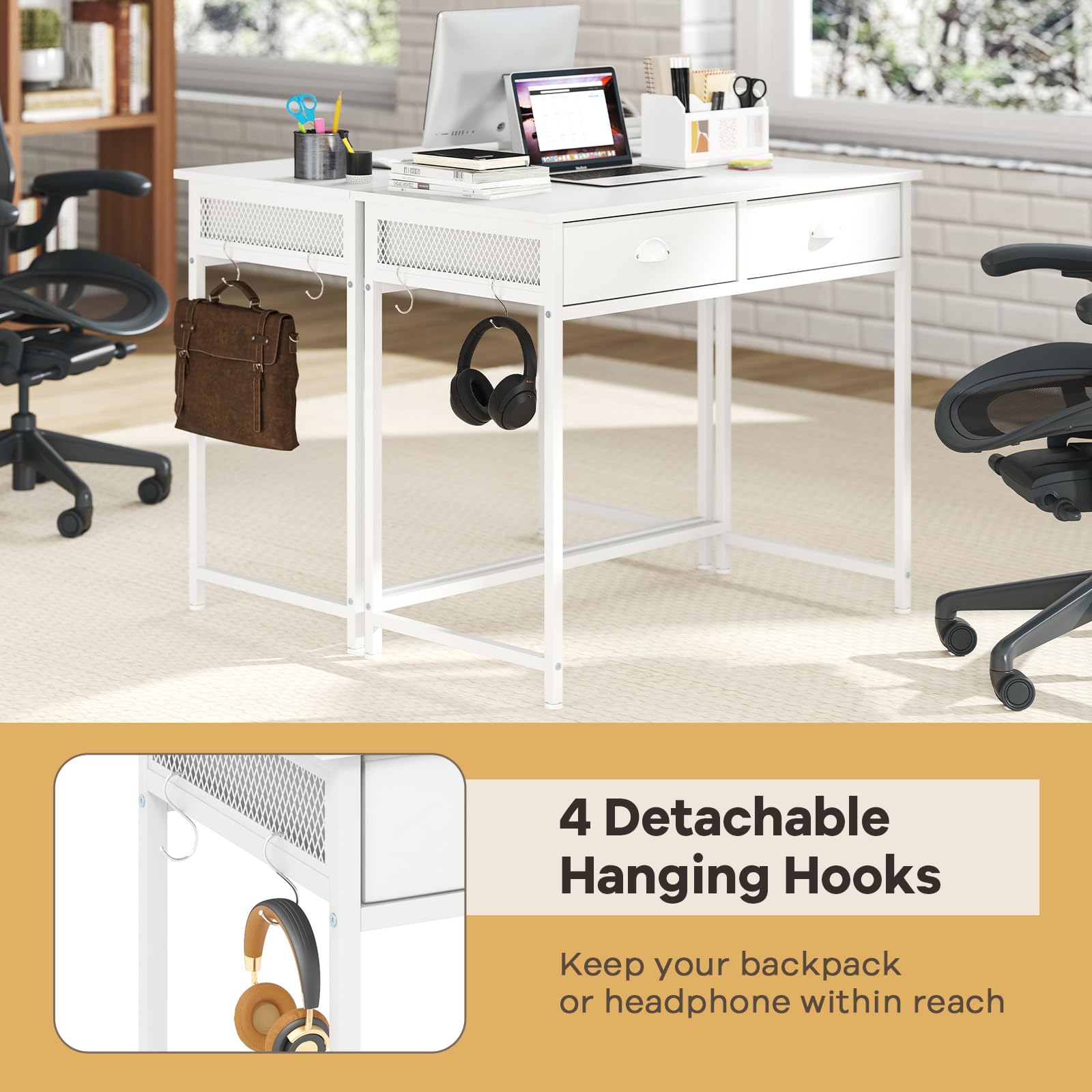 The study desk includes 2 fabric drawers and flexible hanging hooks for convenient storage of essentials like stationery and backpacks. Unlike flimsy desks, the computer desk is crafted with a sturdy metal frame that can support up to 250 lbs. Its compact 36" size makes it ideal for small spaces. With premium features like adjustable foot pads for uneven floors, a comfortable footrest for leg stretching, and elegant shell-shaped metal handles for seamless drawer operation, this home office desk combines practicality with elegance for a truly versatile and efficient workspace.