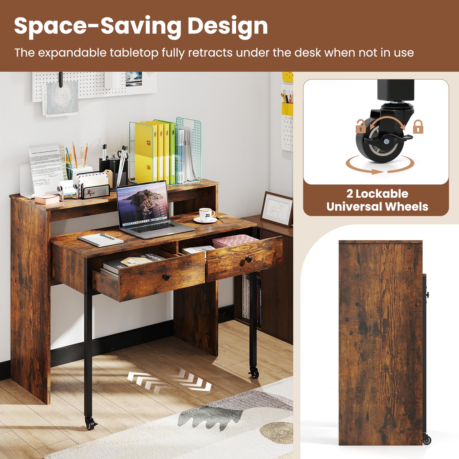 This versatile desk features a retractive lower tabletop to for space saving and lockable wheels for easy mobility. With a monitor shelf, it keeps the screen to your eyes’ level and relieves pressure off your back and neck during long working hours. Crafted with a sturdy metal frame and enhanced with anti-tipping devices, it enhances stability and provides protection for users. Added storage drawers help to store essential office supplies in organized. Embrace a clutter-free, stylish, and secure workspace ideal for any activity, be it studying, working, or gaming. Perfect for modern minimalists aiming to optimize their home office or study setup.