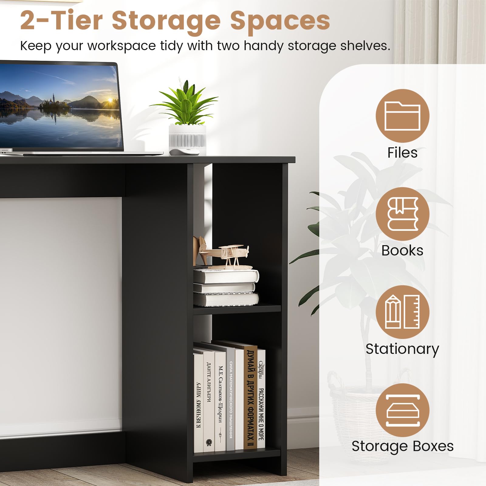 Wide desktop offers plenty of room for your laptop and work essentials. For more space, you can easily combine 2 desks to create a comfortable and uncrowded work area. It ensures additional storage for tidy workspace with 2 shelves, equipped with anti-falling baffles, perfect for storing books, files, and office supplies. The study desk’s sturdy construction, featuring high-strength material and an added crossbar, ensures stability and durability. Protect your floors with the anti-slip foot pads. With its clean lines and minimalist design, this workstation desk adds a touch of sophistication to any home office decor. Setting it up is hassle-free, and it is well-suited for your study, living room, bedroom, or office.