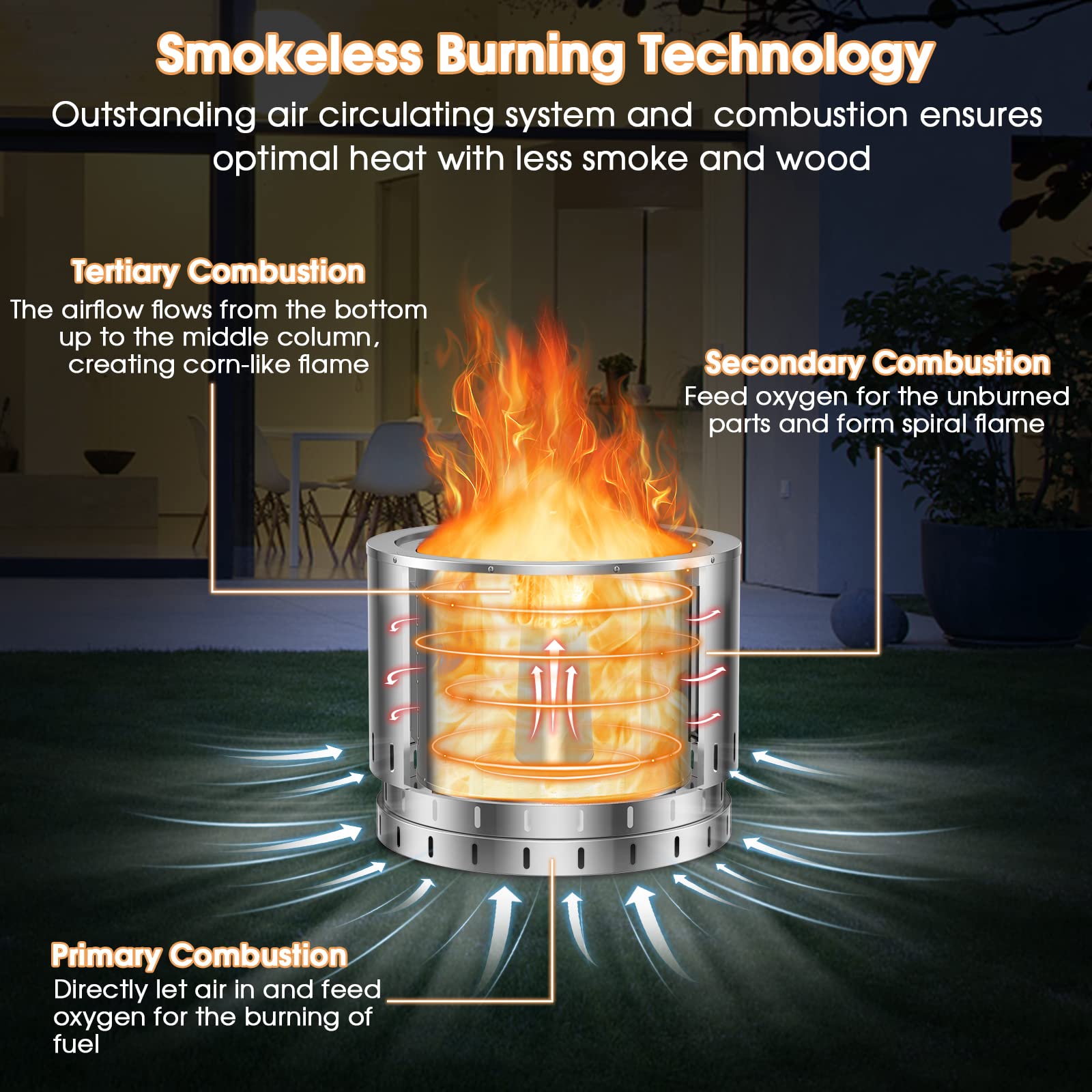 - Unique 3-Level Combustion: The unique structure of this fire pit will lead to 3-level combustion. As a result, the outstanding air circulating system and Oxygen-enriched fire technology ensures optimal heat with less smoke and wood. And the smokeless burning technology offers you a clean bonfire atmosphere.
