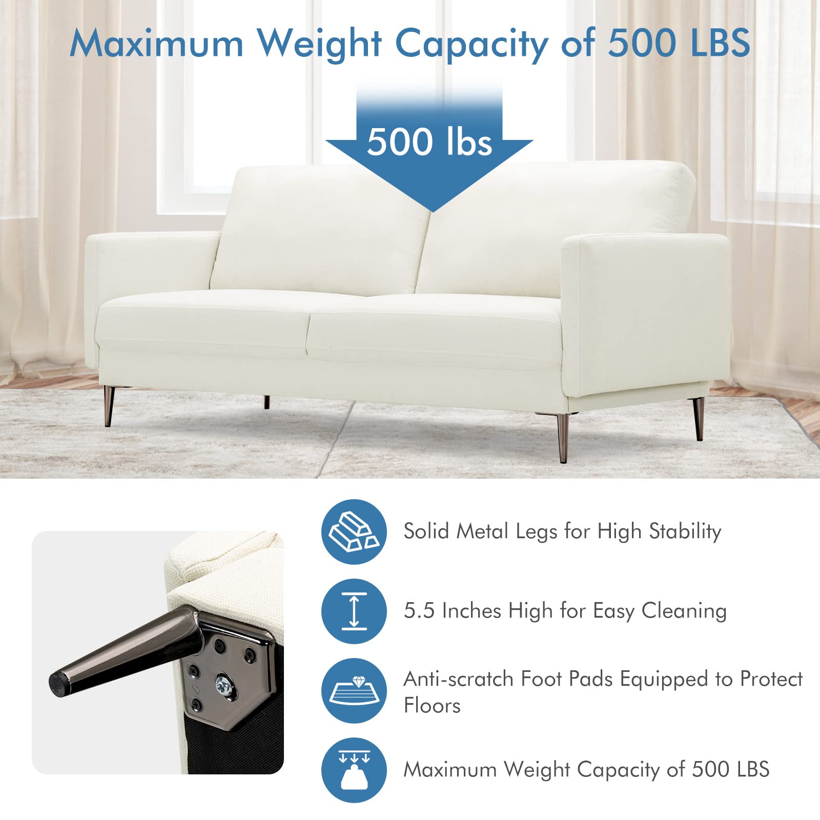 This 2-person sofa couch brings together minimalistic style and functionality with its compact profile, making it ideal for small spaces. This comfortable and stylish loveseat features breathable fabric for a soft and skin-friendly touch. And the high-density sponge filling with CertiPUR-US certification aims to build up a lasting firmness while the elastic spring supporting system to expand lifespan. This sofa couch is supported by the solid metal legs for high stability with a maximum weight capacity of 500 lbs. The backrest is designed with a certain slop angle to ensure the ergonomic seating. The installation is easy, and you can find the full installing kit underneath the loveseat.