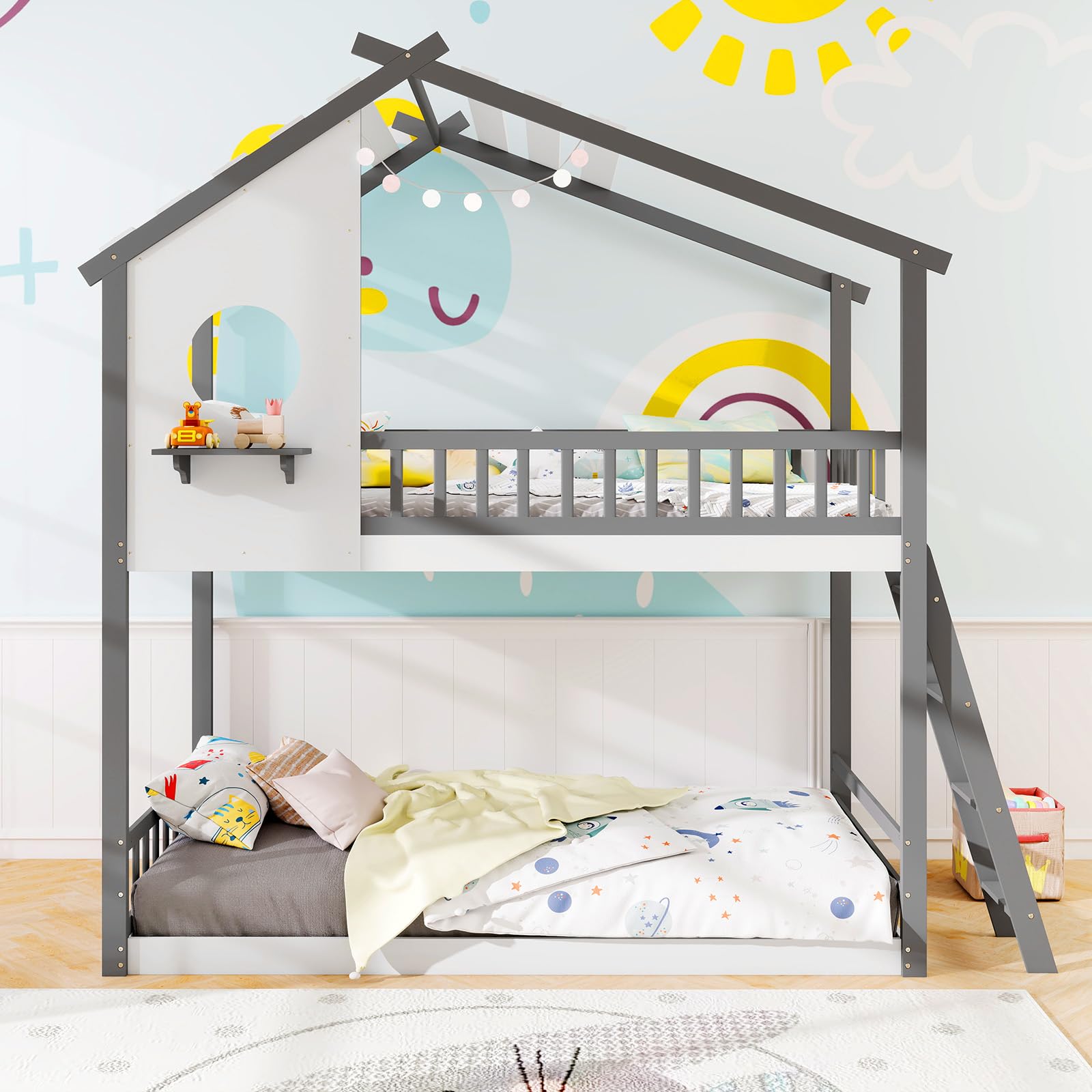 The unique house-shaped design not only sparks joy and imagination but also transforms any bedroom into a playful sanctuary. The house bed is constructed from solid wood for durability and stability. Besides, the sturdy plywood slats provide reliable mattress support, eliminating the need for a box spring. Moreover, the low-to-ground profile is ideal for younger children, making it easier for them to get into bed. The full-length guardrails and built-in ladder provide easy and secure access to the top bunk. All in all, the twin over twin bunk bed adds a whimsical touch while maximizing room space.