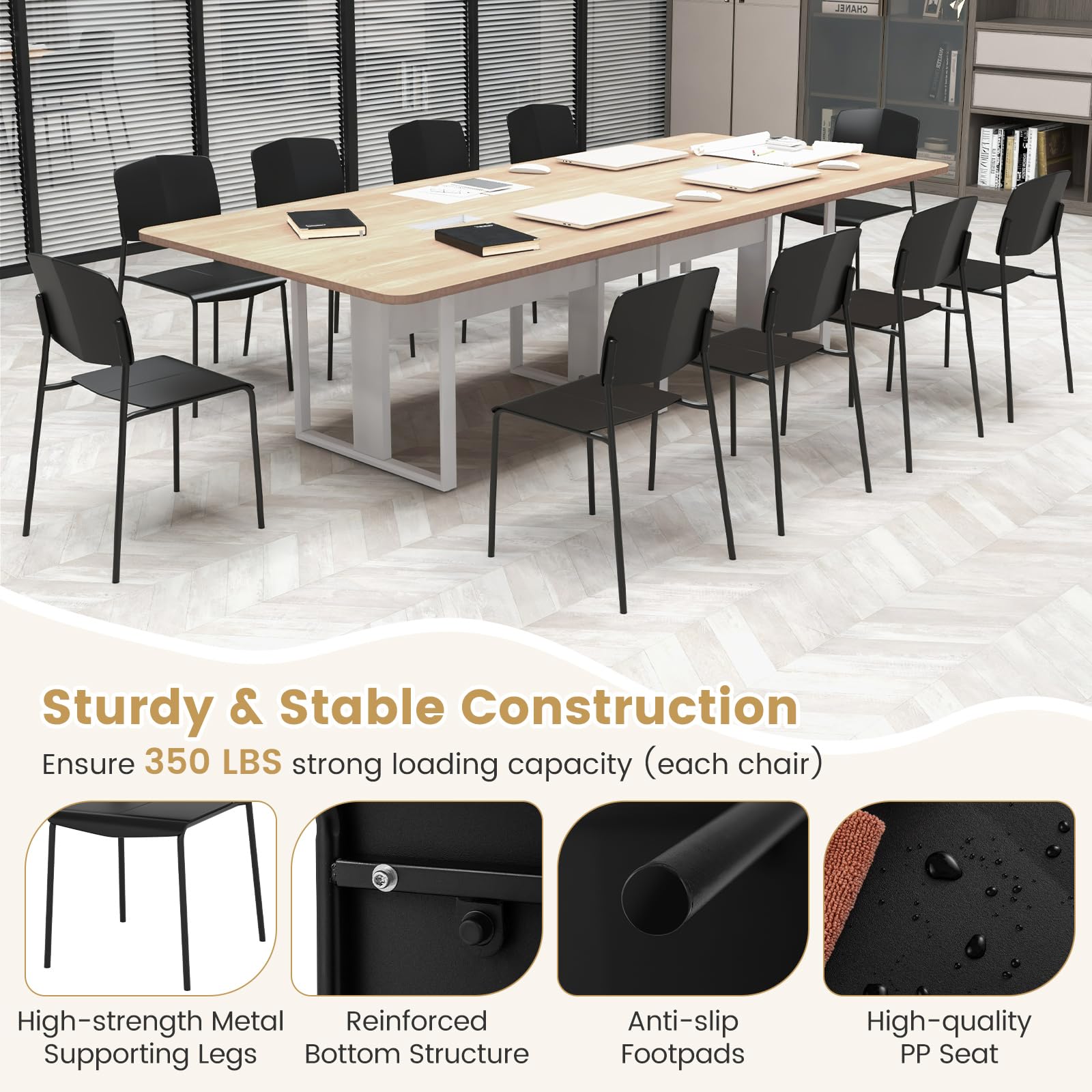 • Solid and Stable Build: Supported by sturdy metal legs, these plastic dining chairs boast a strong loading capacity of 350 lbs each. Anti-slip footpads are also included for added stability.
