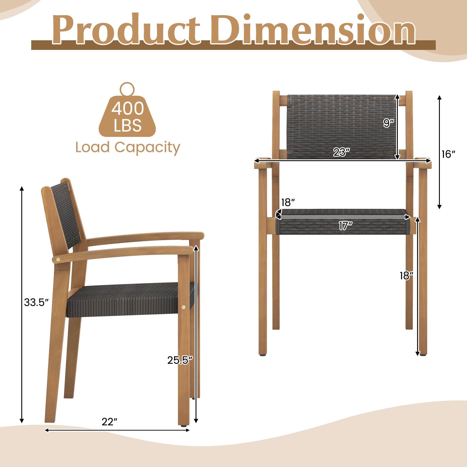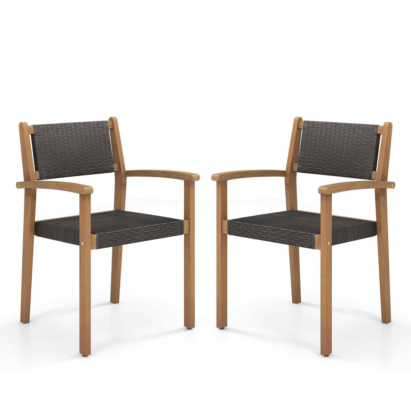 The stackable outdoor chairs feature a mixed brown rattan backrest and seat, which are elegant and sun-proof. Meanwhile, the breathable design allows for comfortable seating even during warm weather conditions. With ergonomic backrests and curved armrests, the patio rattan chairs allow you to relax and enjoy prolonged periods of sitting without discomfort. Each chair is constructed with a robust frame made from high-quality acacia wood, known for its high hardness and durability. Most importantly, these outdoor conversation chairs are stackable. Therefore, you can easily store the wicker armchairs when not in use, saving valuable space on your patio, deck, or balcony.
