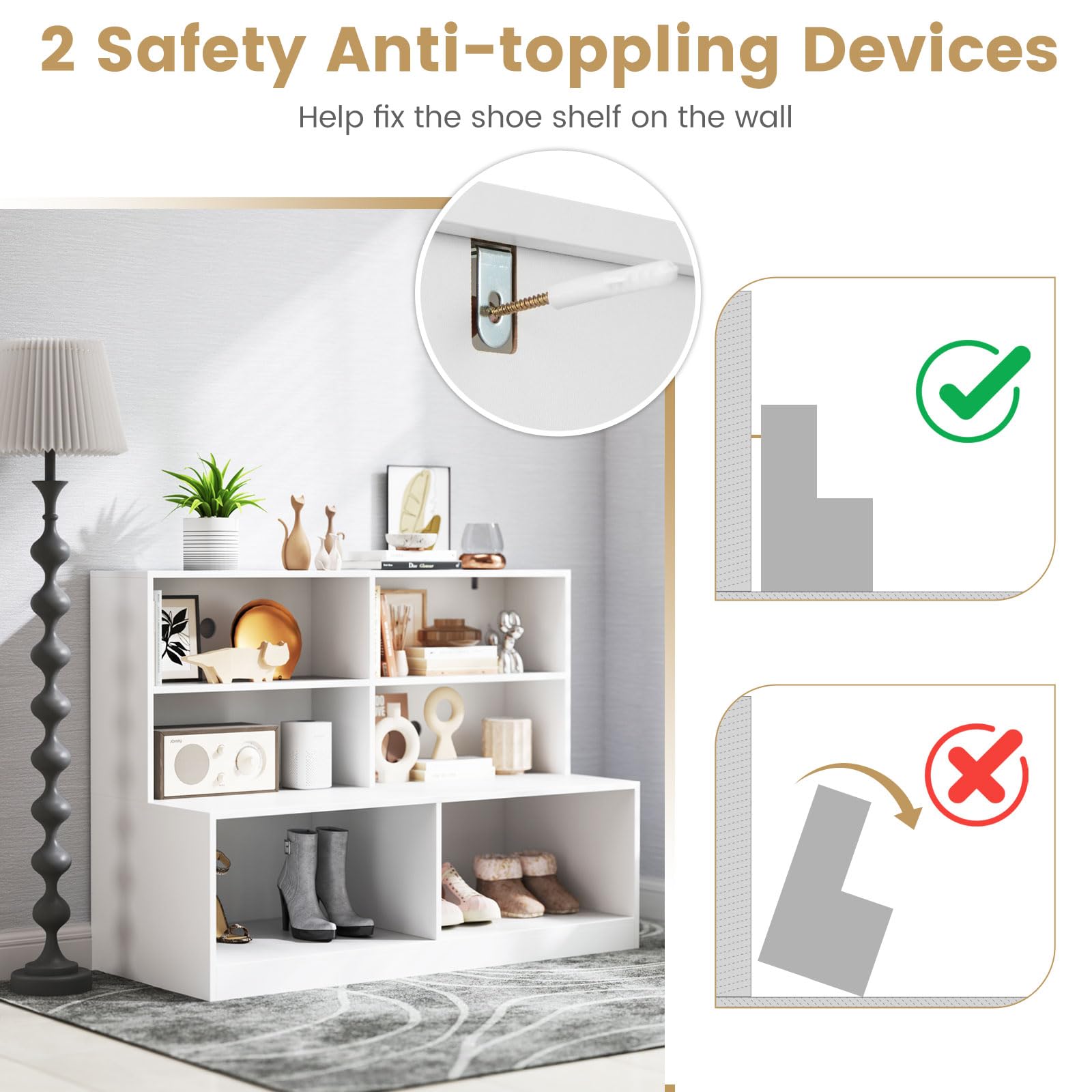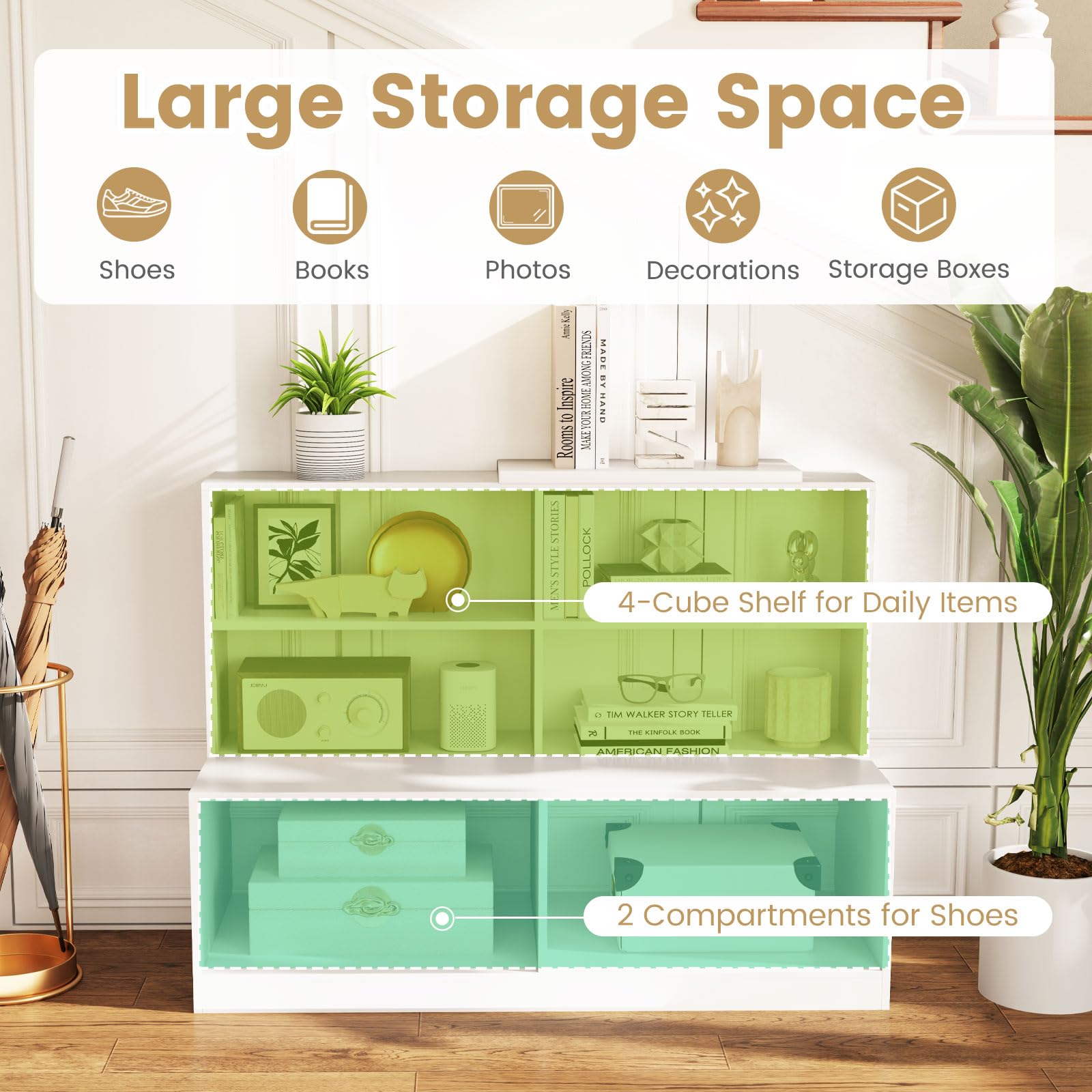 Elevate your entryway organization with our multifunctional shoe rack and bench. Boasting a spacious tabletop, 4-cube shelf, and 2 shoe compartments, this storage solution is ideal for keeping your daily items in order. Crafted with sturdy boards, it can double as a seat holding up to 440 lbs. The added safety anti-toppling devices ensure a secure setup. Its chic and modern design seamlessly blends with your decoration, adding a stylish touch to any room.