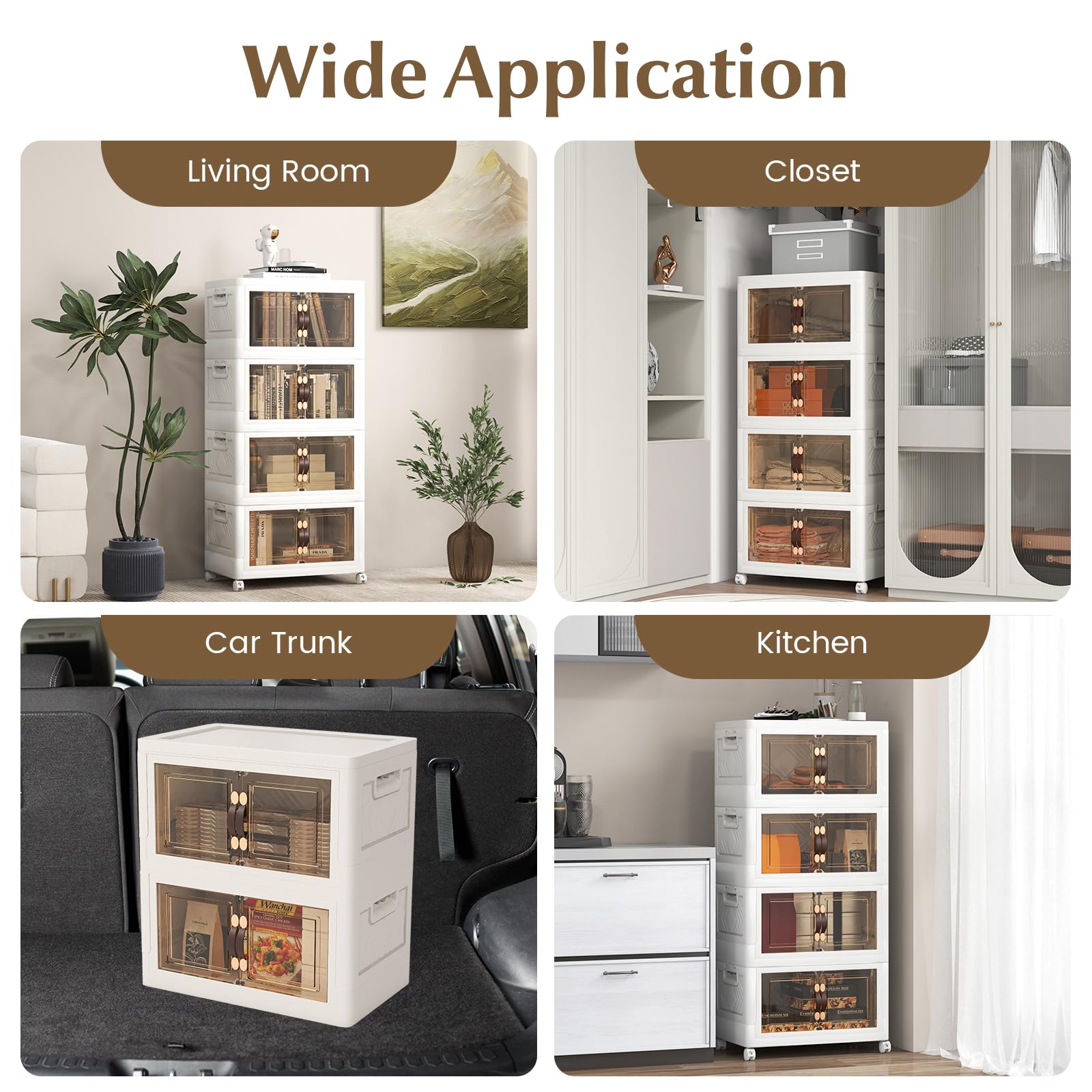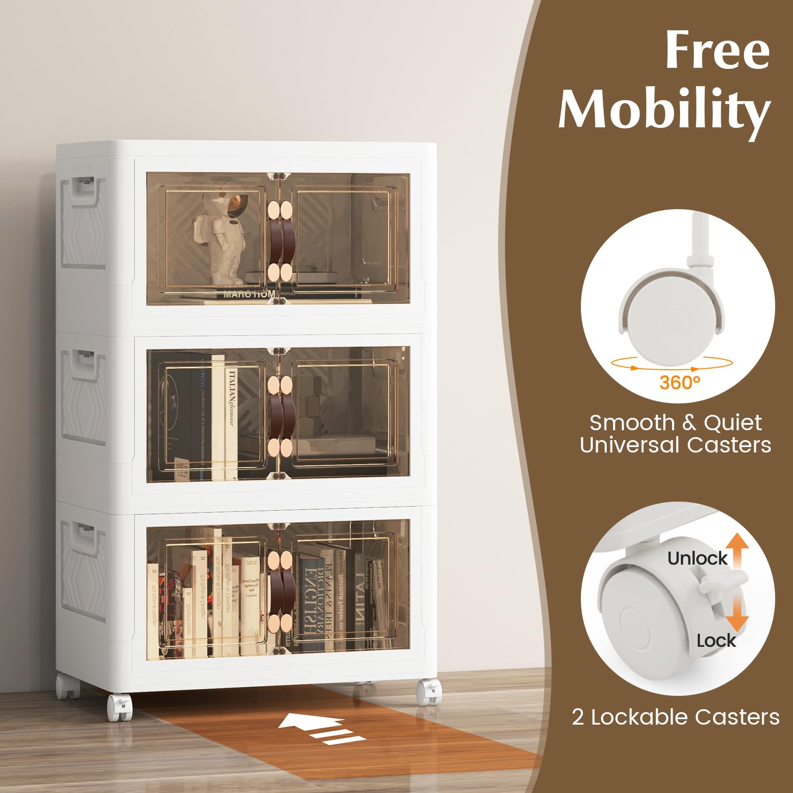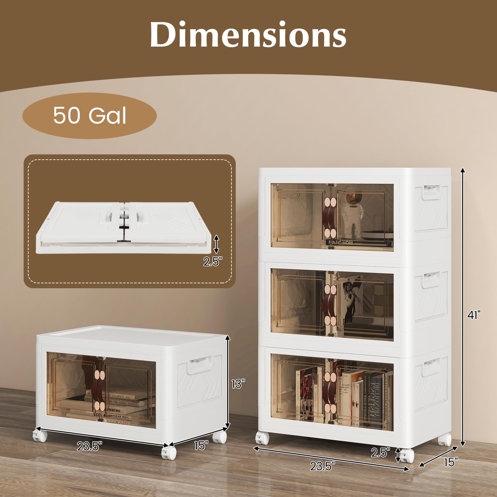 Instantly transform your space with our clever collapsible storage box! Setup is a breeze with its folding design. Snap, stack, and declutter effortlessly! Need to make some room? Simply collapse and store it flat until next time. Accessing your belongings is a breeze with the transparent doors, magnetic catches, and handles. The removable lid allows for easy top access. With four smooth and silent universal casters, move your storage box effortlessly from room to room. Worried about it moving unexpectedly? Just lock the two casters in place. Perfect for closets, living rooms, kitchens, and car trunks. Customize your storage organizer to suit your needs!