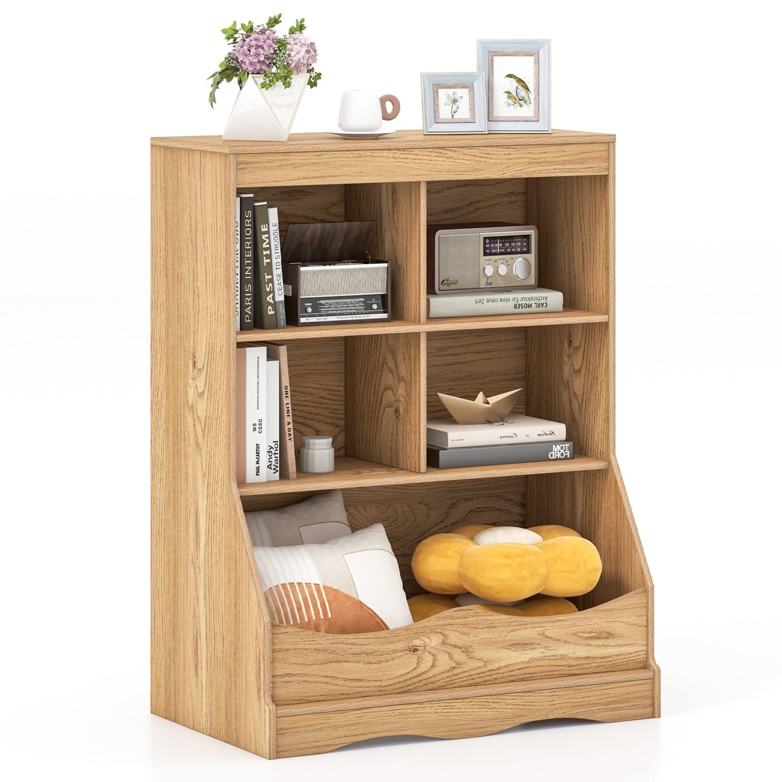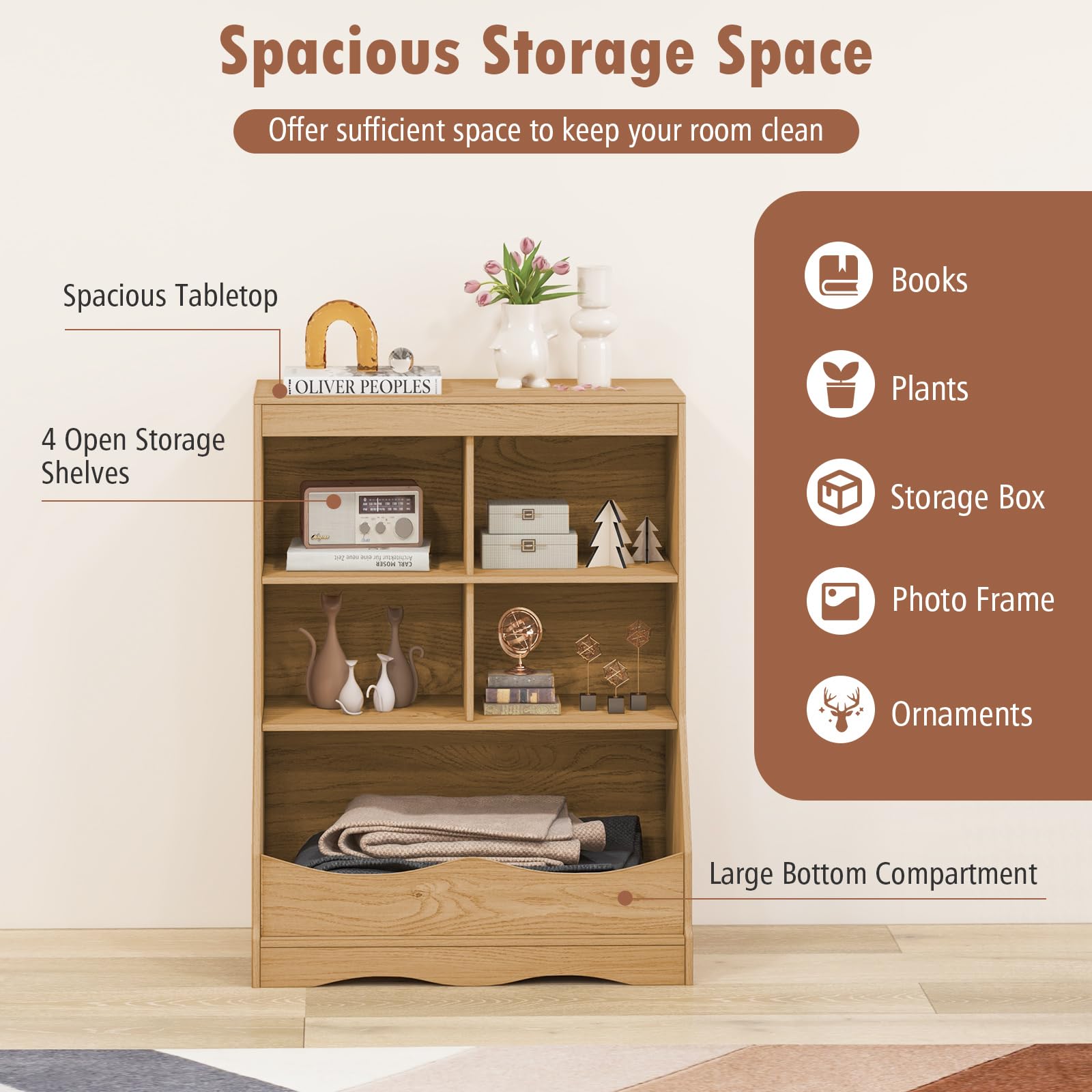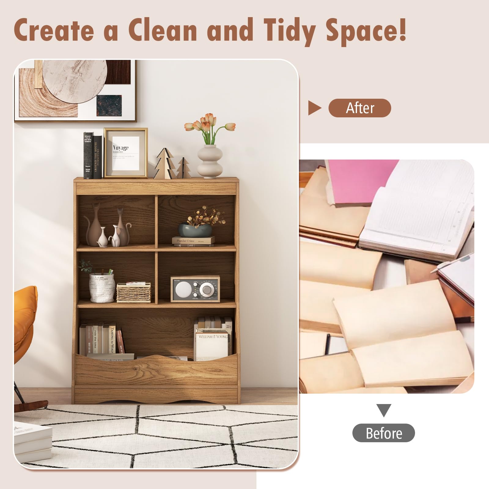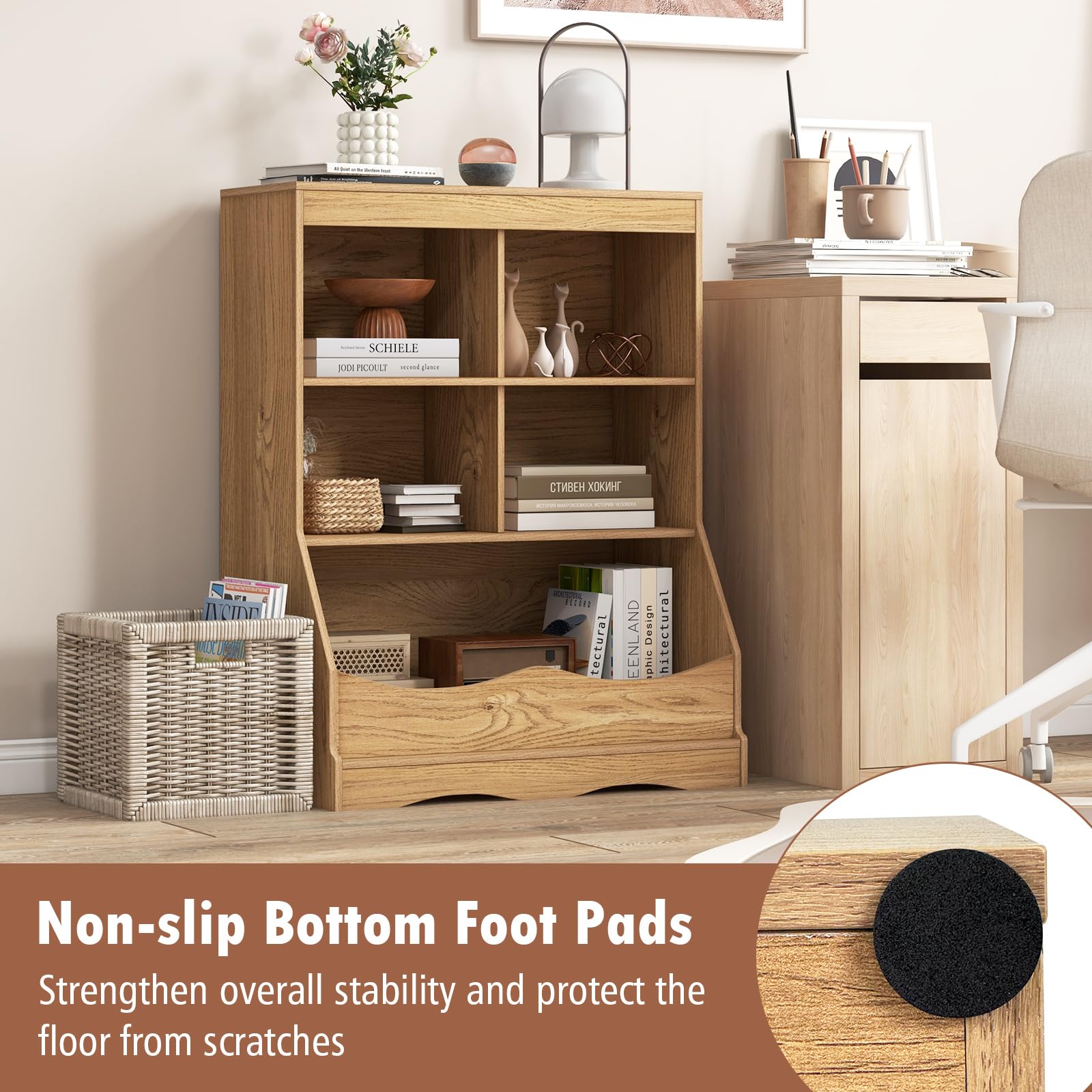 Our bookshelf offers a spacious tabletop, four open storage shelves, and a large bottom compartment to neatly organize books, vases, photo frames, ornaments, and plants. Effortlessly transform cluttered rooms into well-organized spaces with this stylish and practical piece. Precision-crafted from premium material, this bookcase is designed to provide a durable and sturdy structure that will last for years to come. The reinforced legs with foot pads enhance stability and protect your floors from scratches. Additionally, 2 anti-toppling devices securely anchor the bookcase in place for added safety. The perfect height for kids, this bookshelf encourages independence and fosters organizational habits. Experience the convenience and elegance of our storage cabinet in your home today.