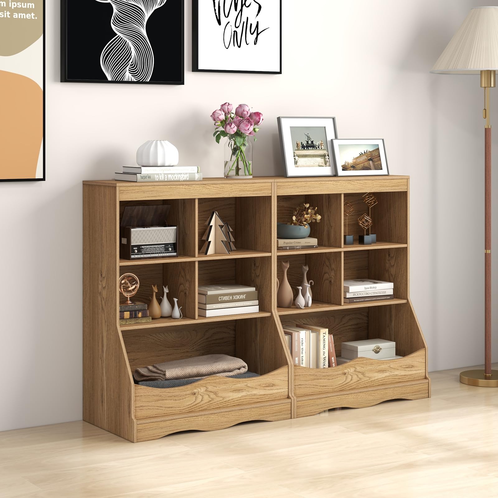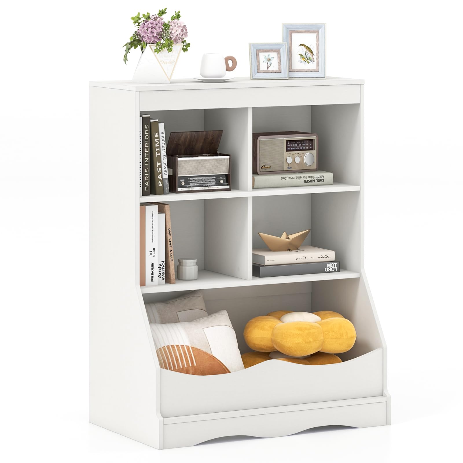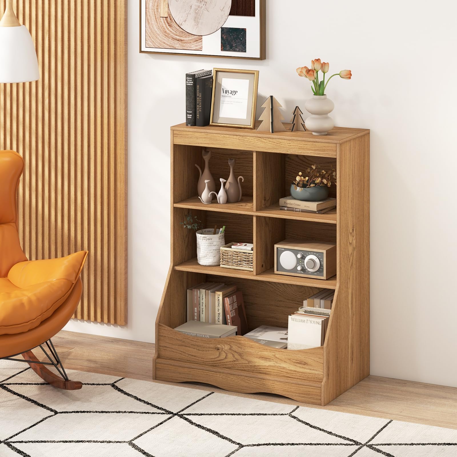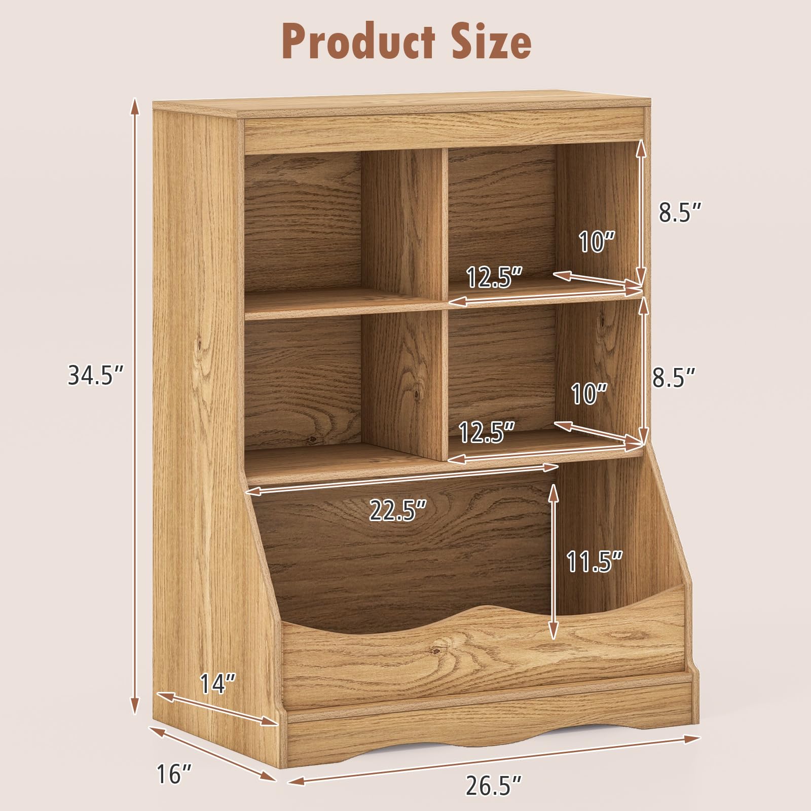 Our bookshelf offers a spacious tabletop, four open storage shelves, and a large bottom compartment to neatly organize books, vases, photo frames, ornaments, and plants. Effortlessly transform cluttered rooms into well-organized spaces with this stylish and practical piece. Precision-crafted from premium material, this bookcase is designed to provide a durable and sturdy structure that will last for years to come. The reinforced legs with foot pads enhance stability and protect your floors from scratches. Additionally, 2 anti-toppling devices securely anchor the bookcase in place for added safety. The perfect height for kids, this bookshelf encourages independence and fosters organizational habits. Experience the convenience and elegance of our storage cabinet in your home today.
