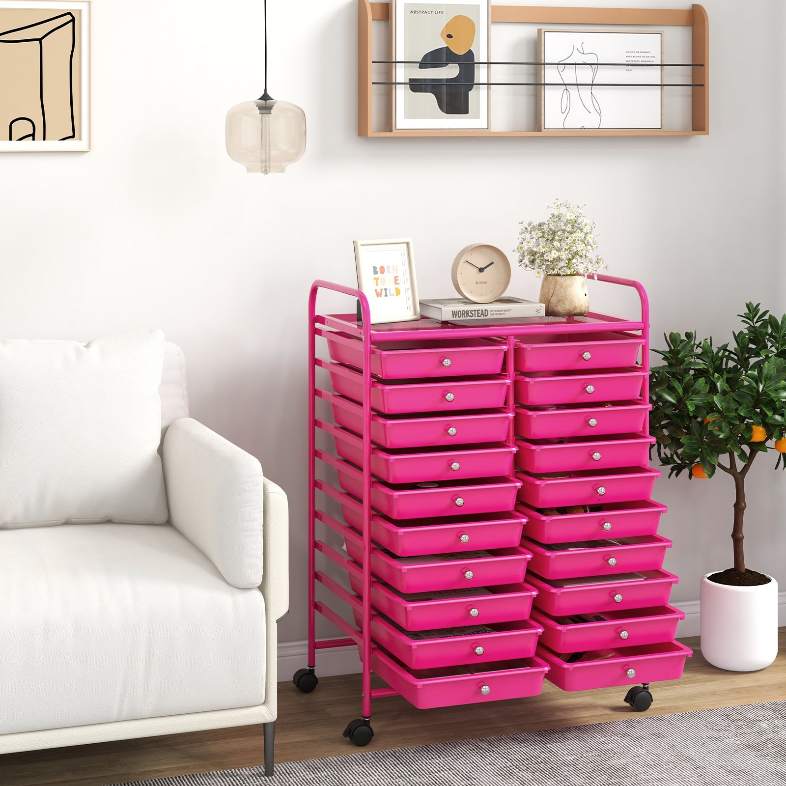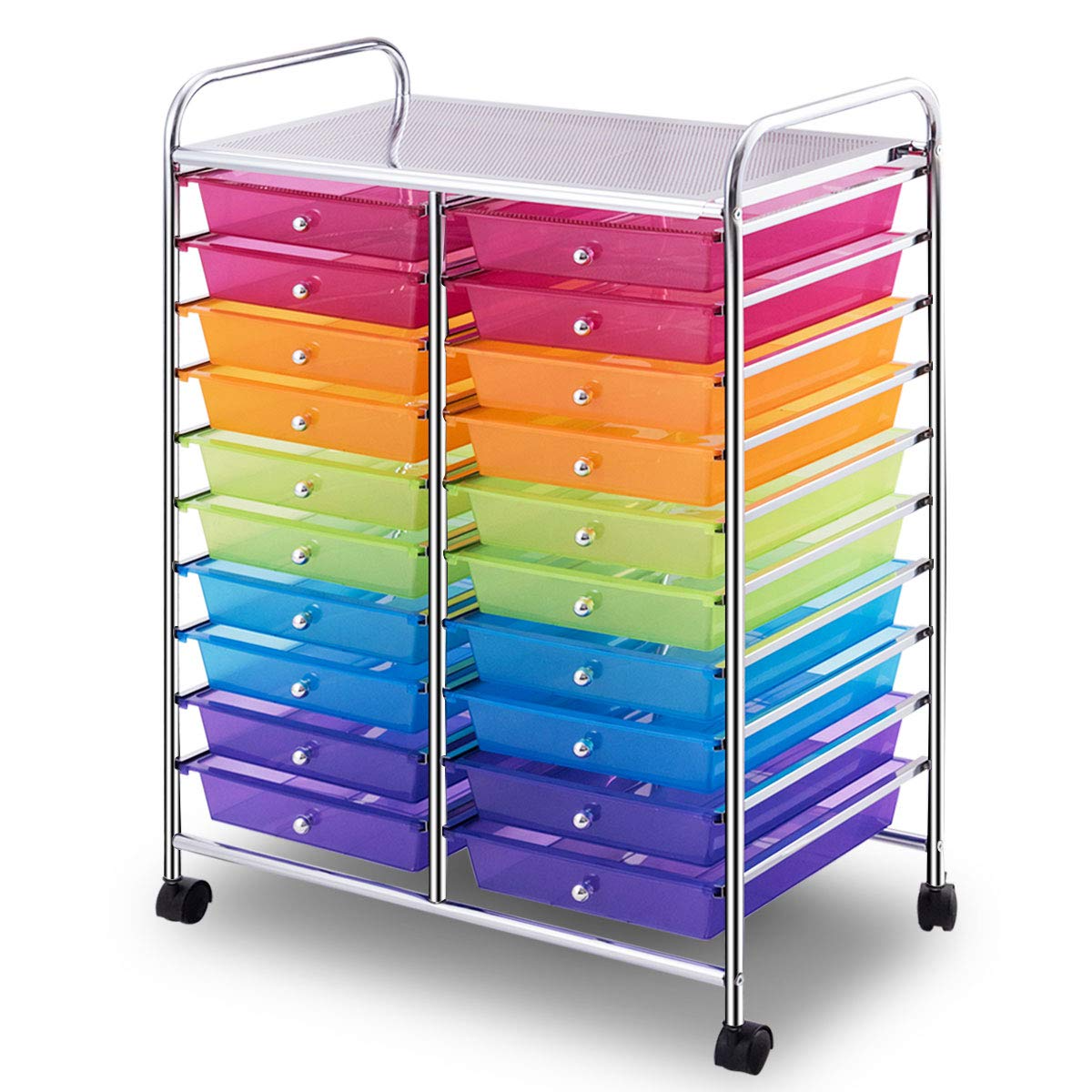 Do you want to have a storage cart that can be rolled smoothly from one place to another? Our 20-drawer rolling storage cart which will provide enough storage space for you. It is great for paper, tools, accessories, crafting, scrap booking, or home office, helping you to organize and make your tools in order. Constructed of industrial-strength metal tubes and finished in chrome, the cart is sturdy enough to serve you for a long time. Equipped with easy-to-grab handles and 4 universal wheels, it is easy to move the lightweight cart. And 2 of the wheels have a simple lock for stopping easily. With our practical cart, you can store various things from art and office supplies to cleaning or kitchen essentials. It is ideal to arrange your different stuff at the office, home, school garage or just about anywhere organization is needed.