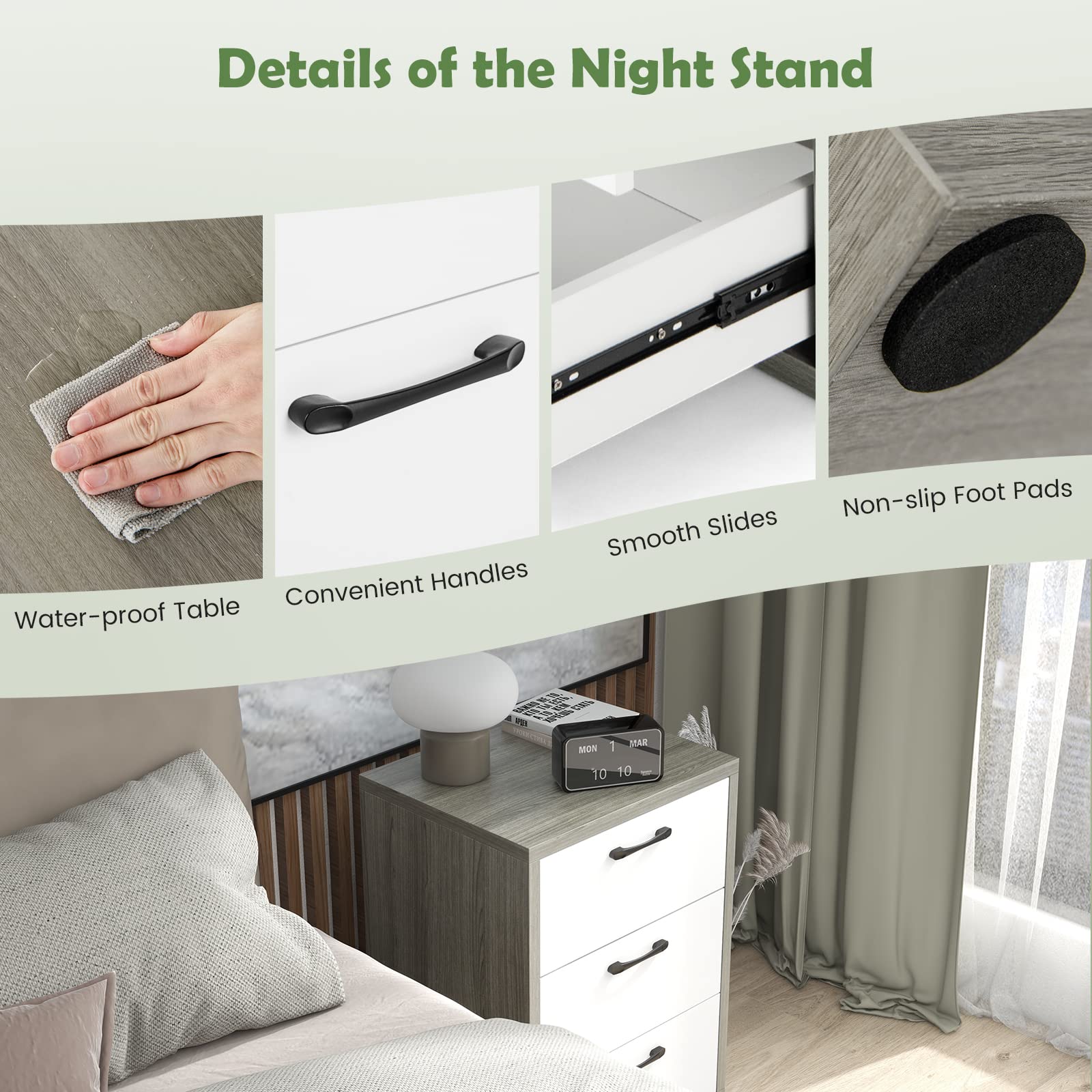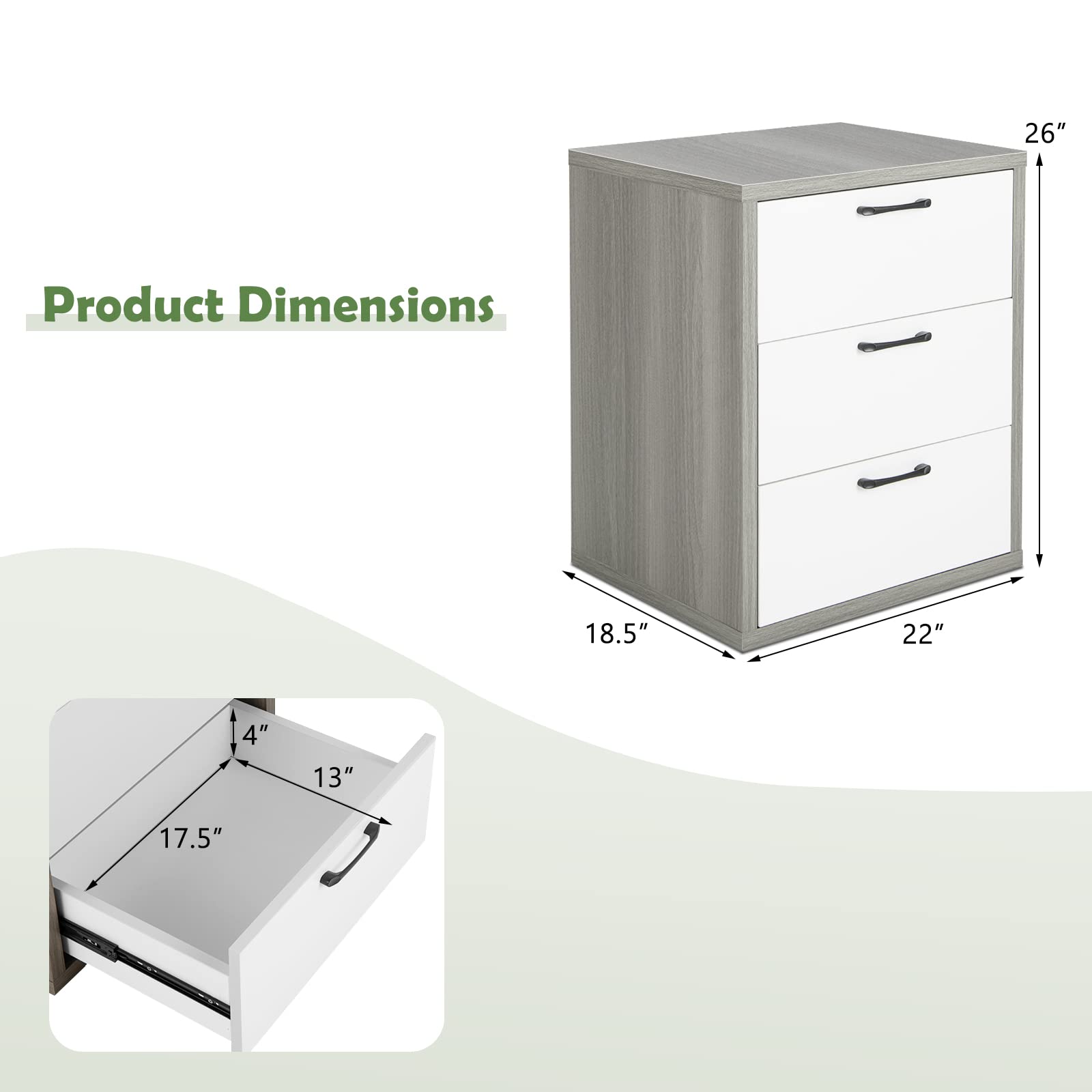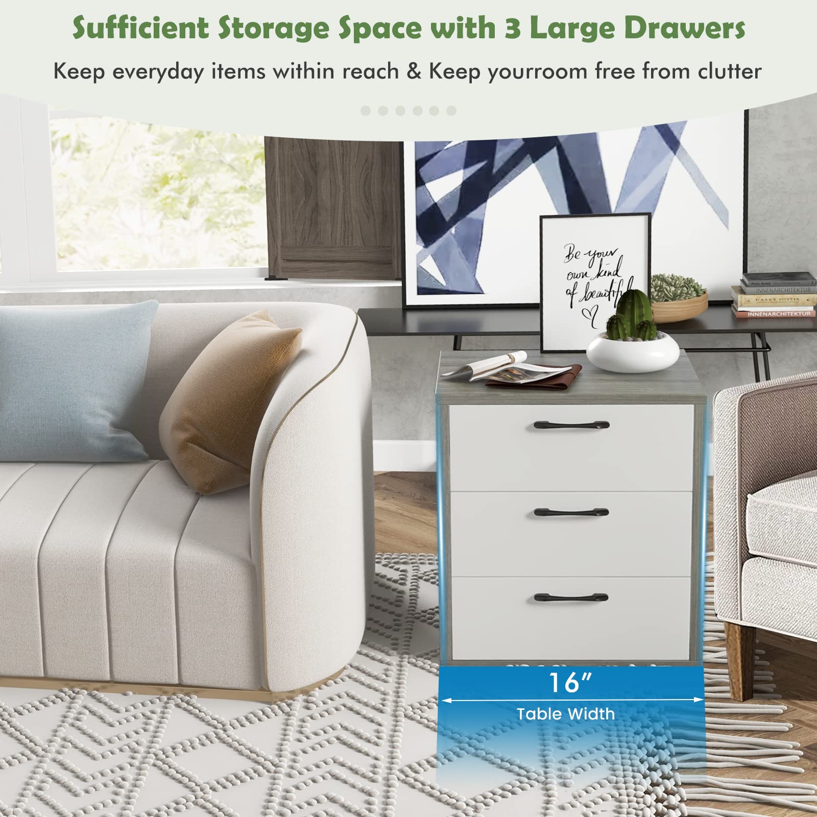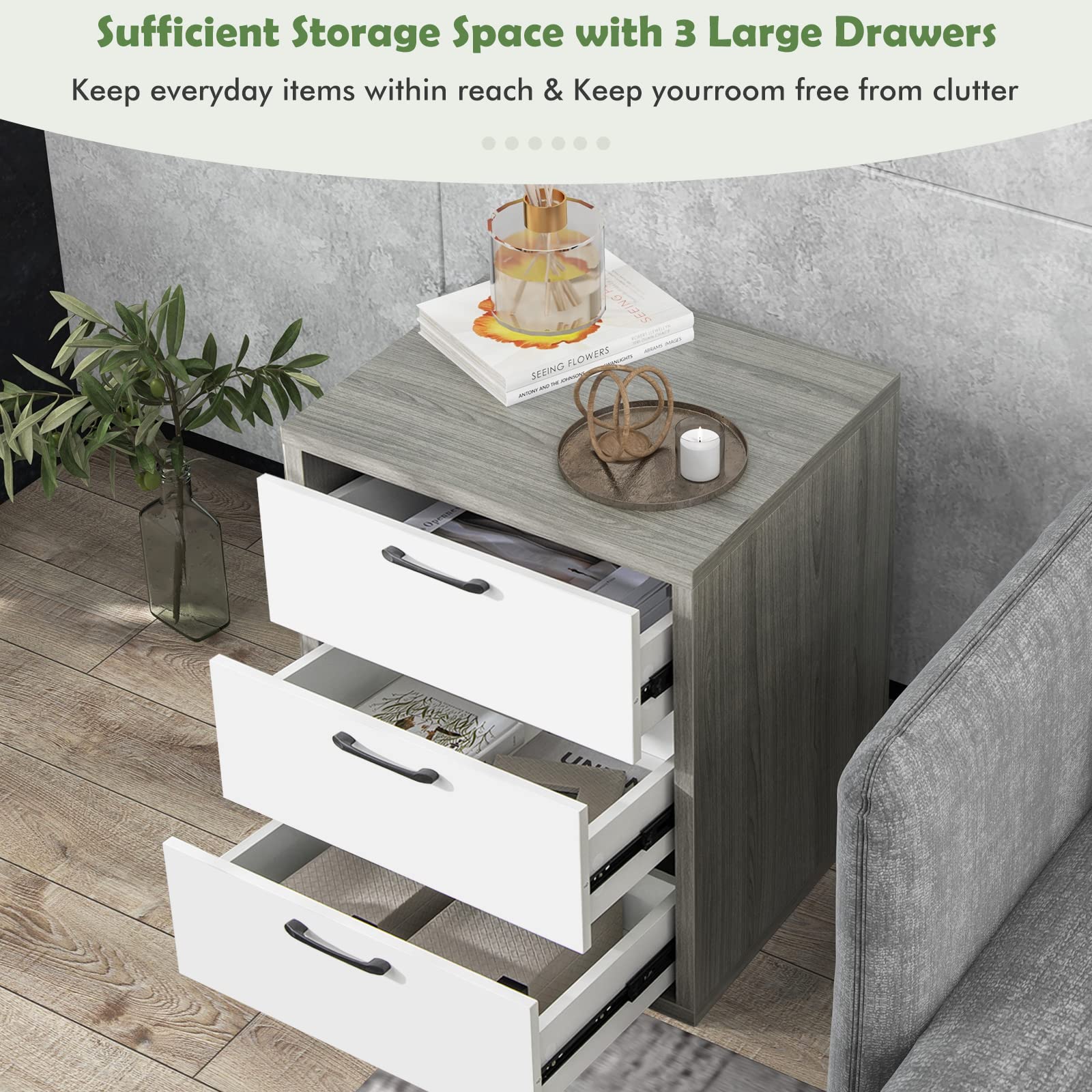Wide Storage Space: This storage cabinet is equipped with a spacious tabletop featuring 22x18.5" (L x W), which can meet your daily storage needs. Also, it is designed with three deep drawers where you can place some private items for quick and convenient access. With the storage cabinet, you can keep your room neat and tidy.