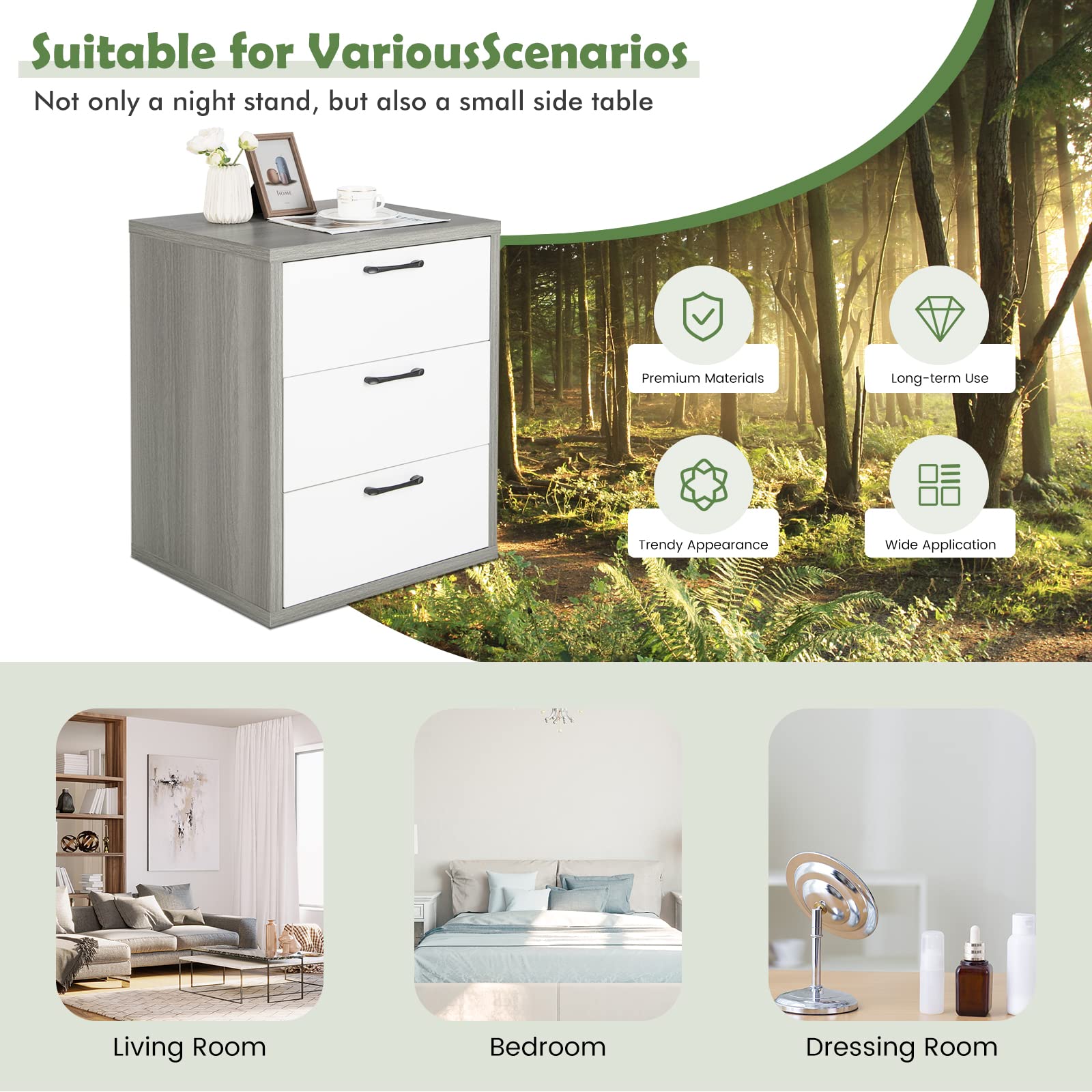 Versatile Cabinet: In addition to being a drawer dresser for your bedroom, the storage cabinet can also be used as a nightstand for displaying your beautiful table lamps. At the same time, you can also apply it as a side table in your living room for placing and storing snacks and other essentials for convenient access.