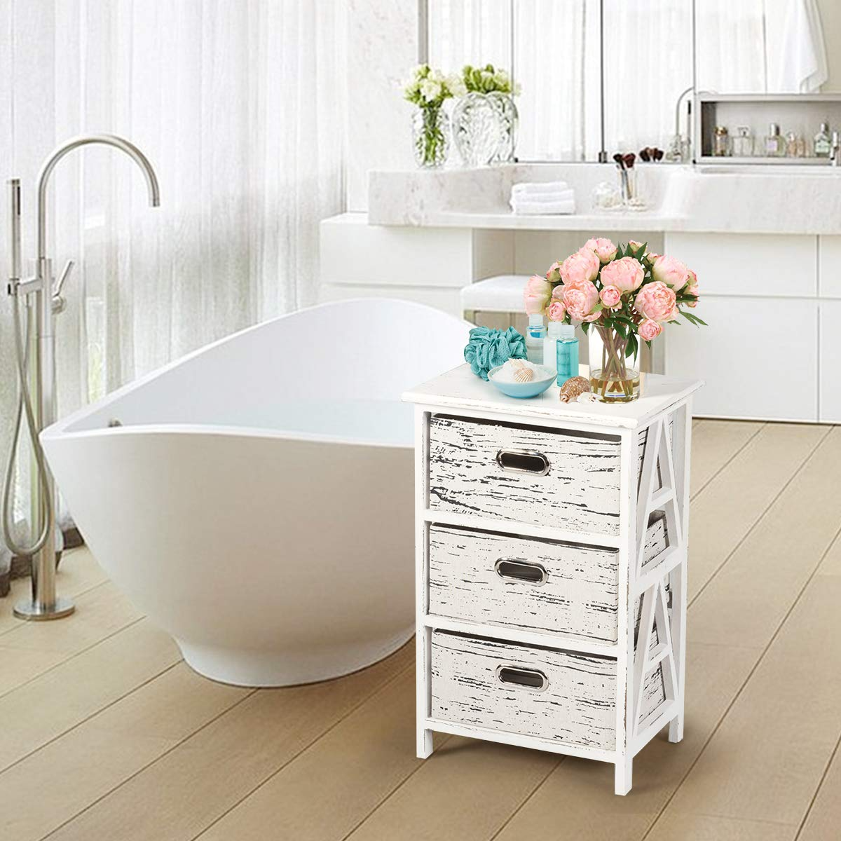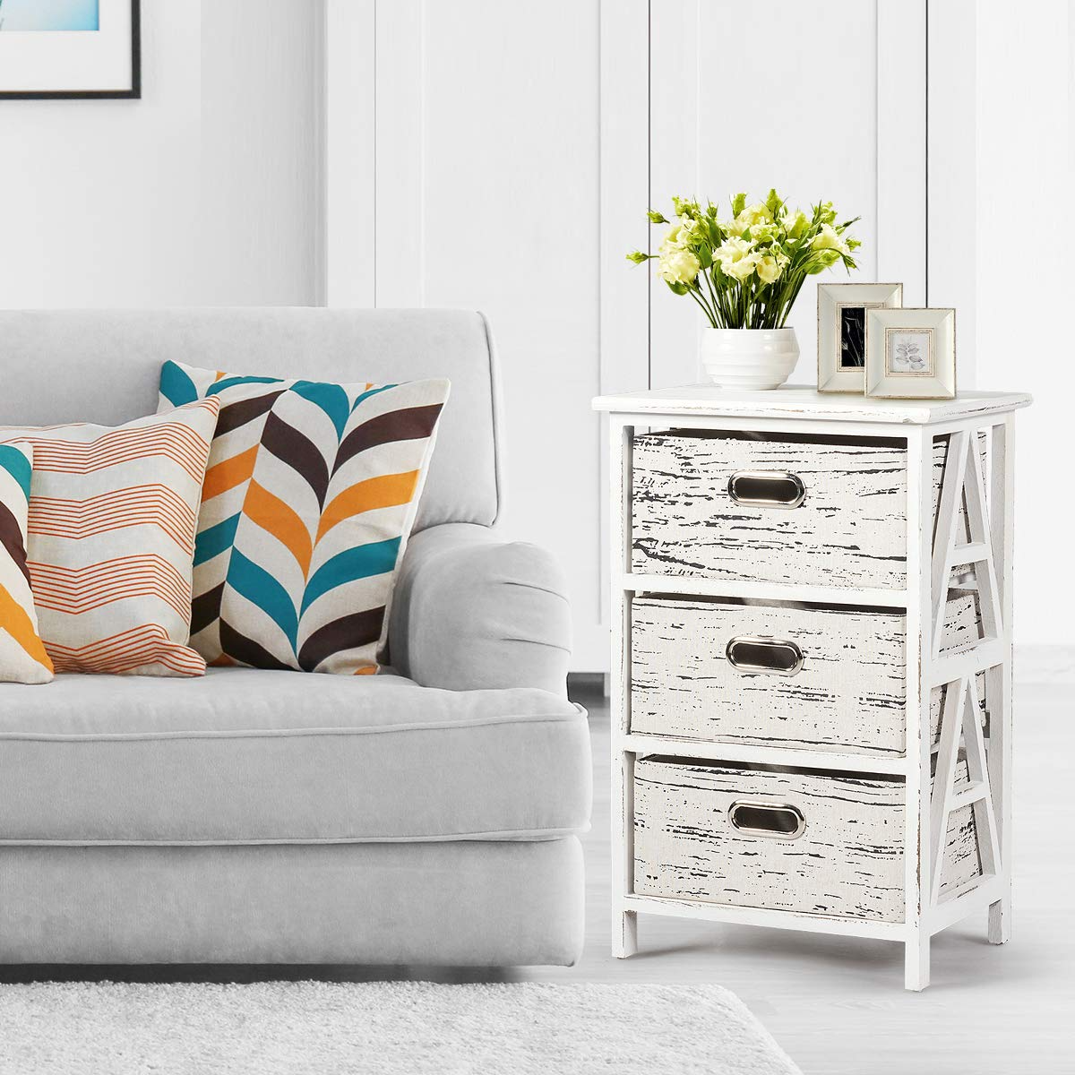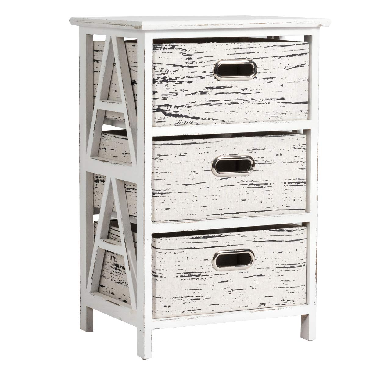 This chest of drawer is combine with beautiful and practical, and is the idealoption for you! This end table is well craft of solid wood and functional to fit bedroom and living room use.Featuring 3 removable fabric drawers and spacious tabletop that provides plentyof storage space, allowing you to keep the clutter under control. The separate fabric drawers with exquisite hollow handle making it easy to access to yoursundries. Solid wood frame and premium fabric drawer ensure sturdy and durableenough to accommodate many stuffs and worry free use. Vintage style pluscompact design, this nightstand is great for small space.