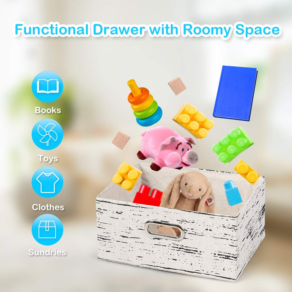 - Removable fabric drawers with oval hollowed handle allow you to use alone