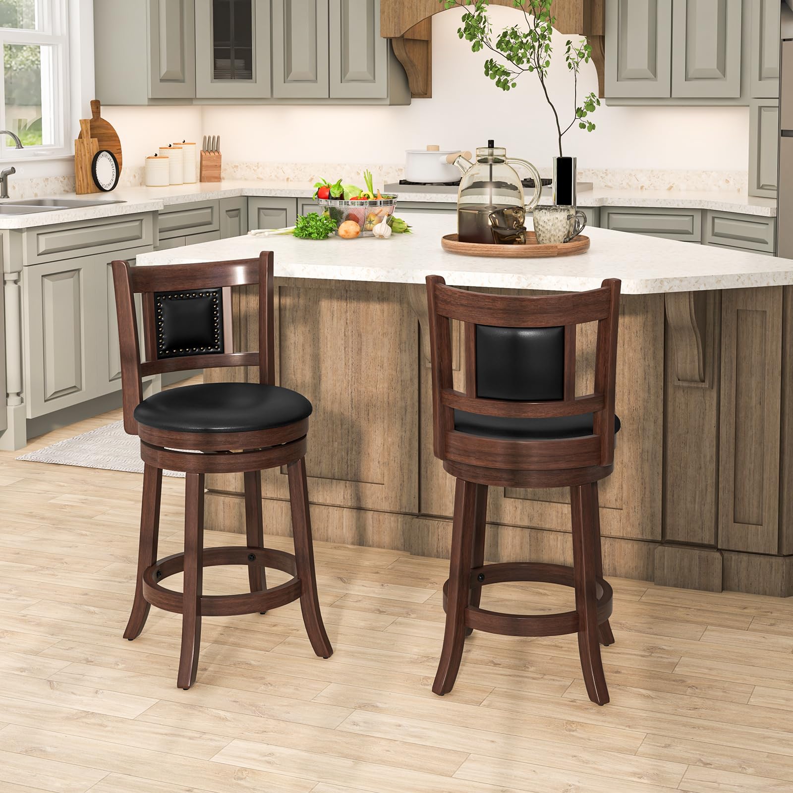 Curved backrest, padded seat and round footrest allow you to sit with a comfortable posture. The seat cushion is covered with premium PVC leather and filled with elastic sponge, so that you won’t feel uncomfortable even after long-lasting seating. Besides, to add more fun, the seat can swivel 360°. Furthermore, each chair is designed with a strong rubber wood frame, which bears a weight up to 250 lbs and ensures long-term use.