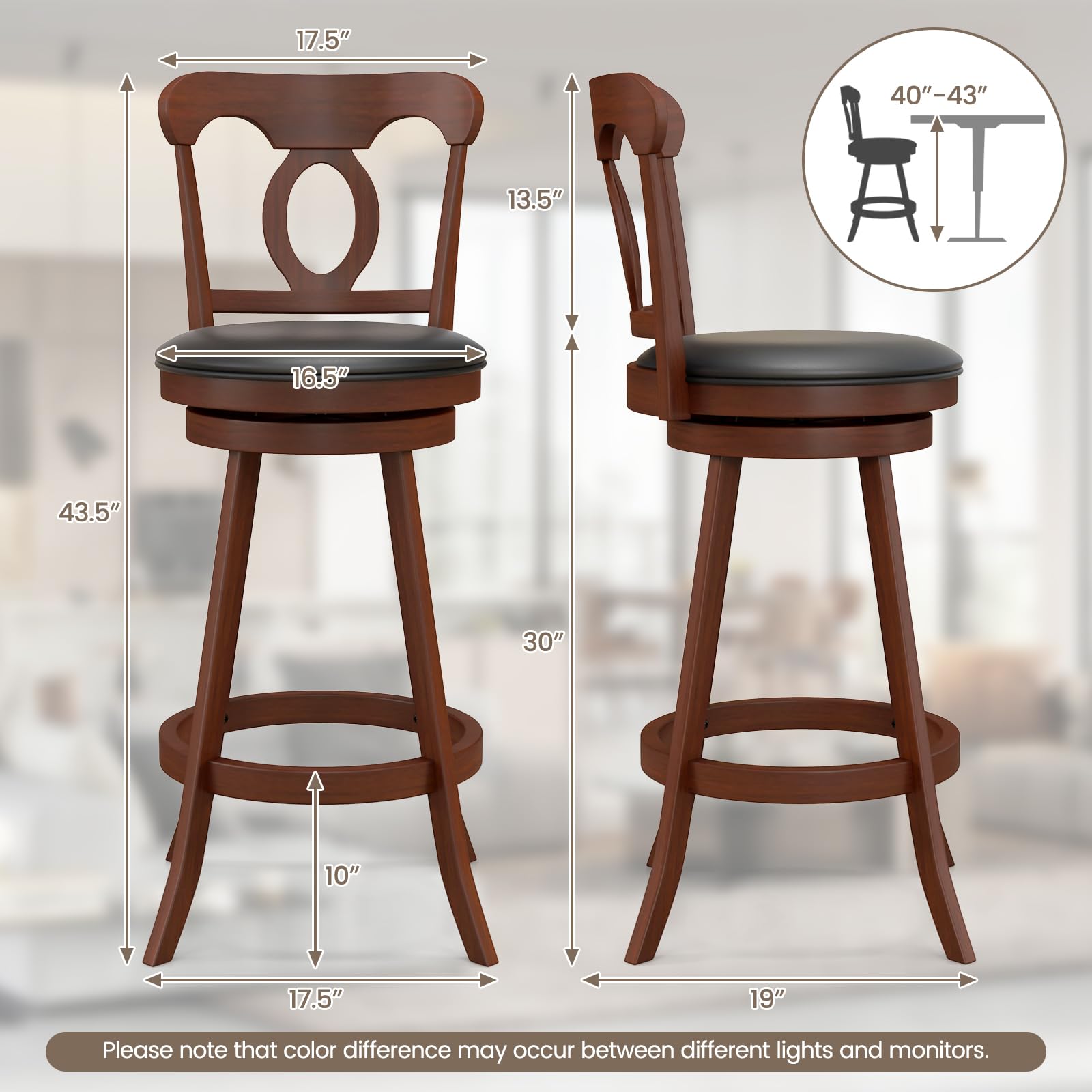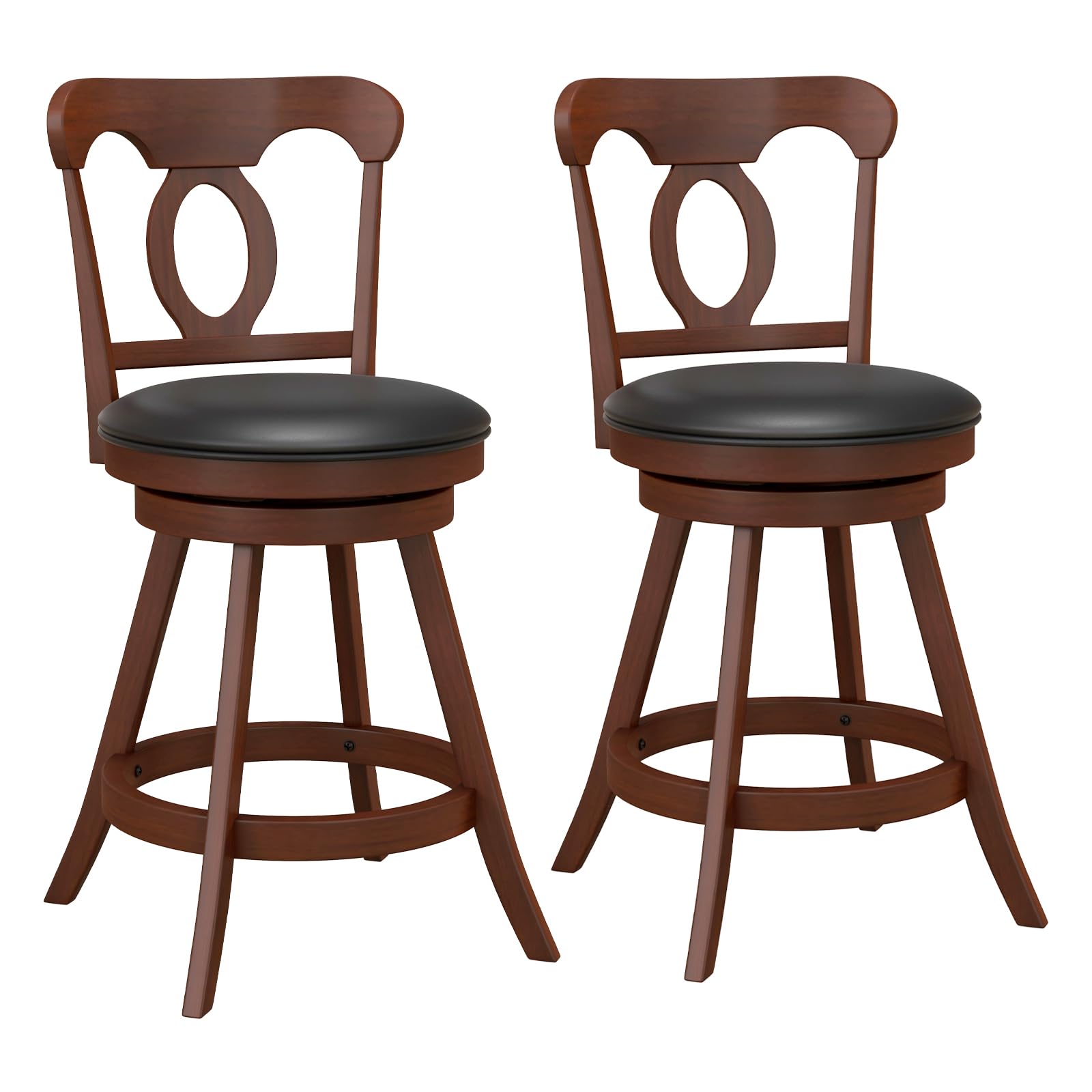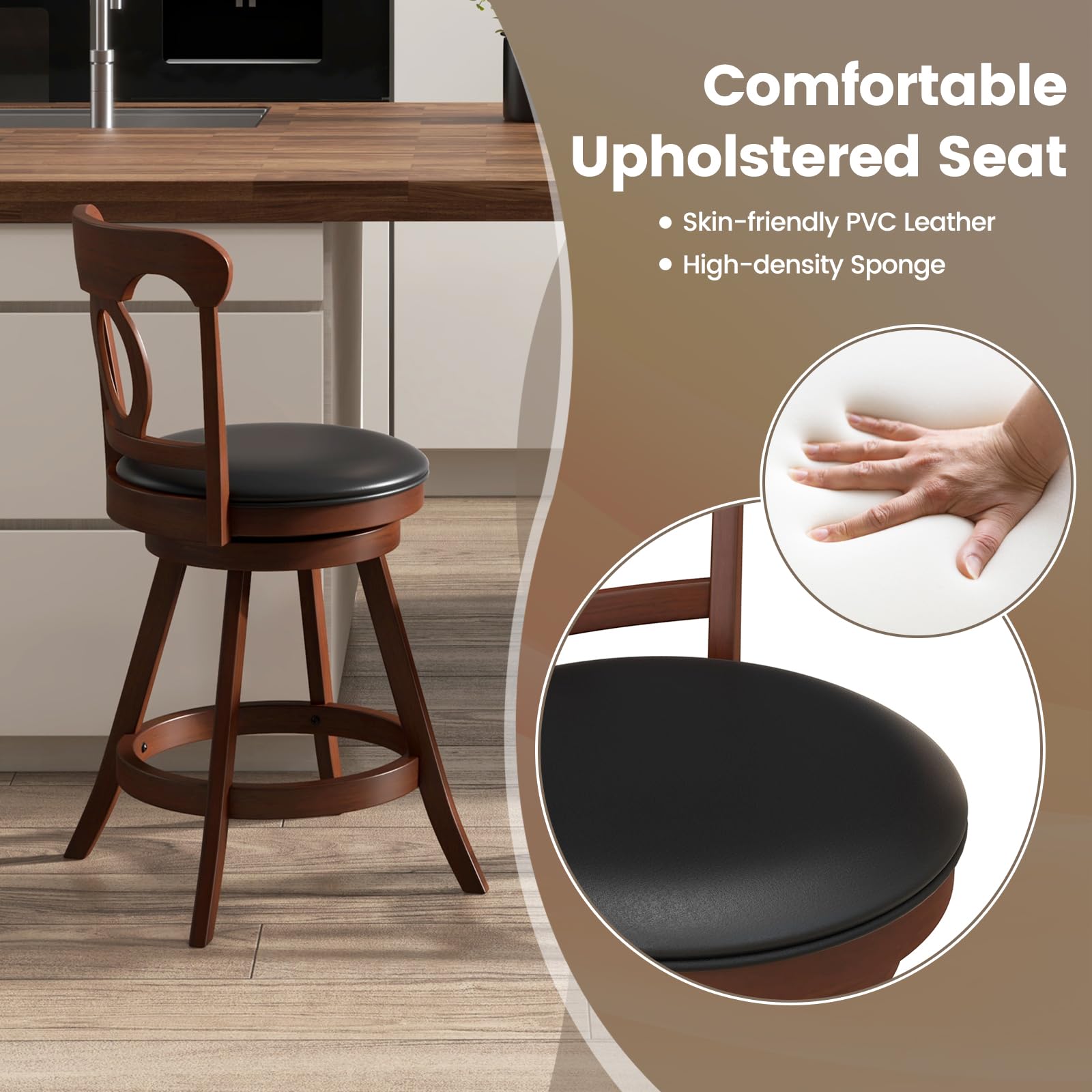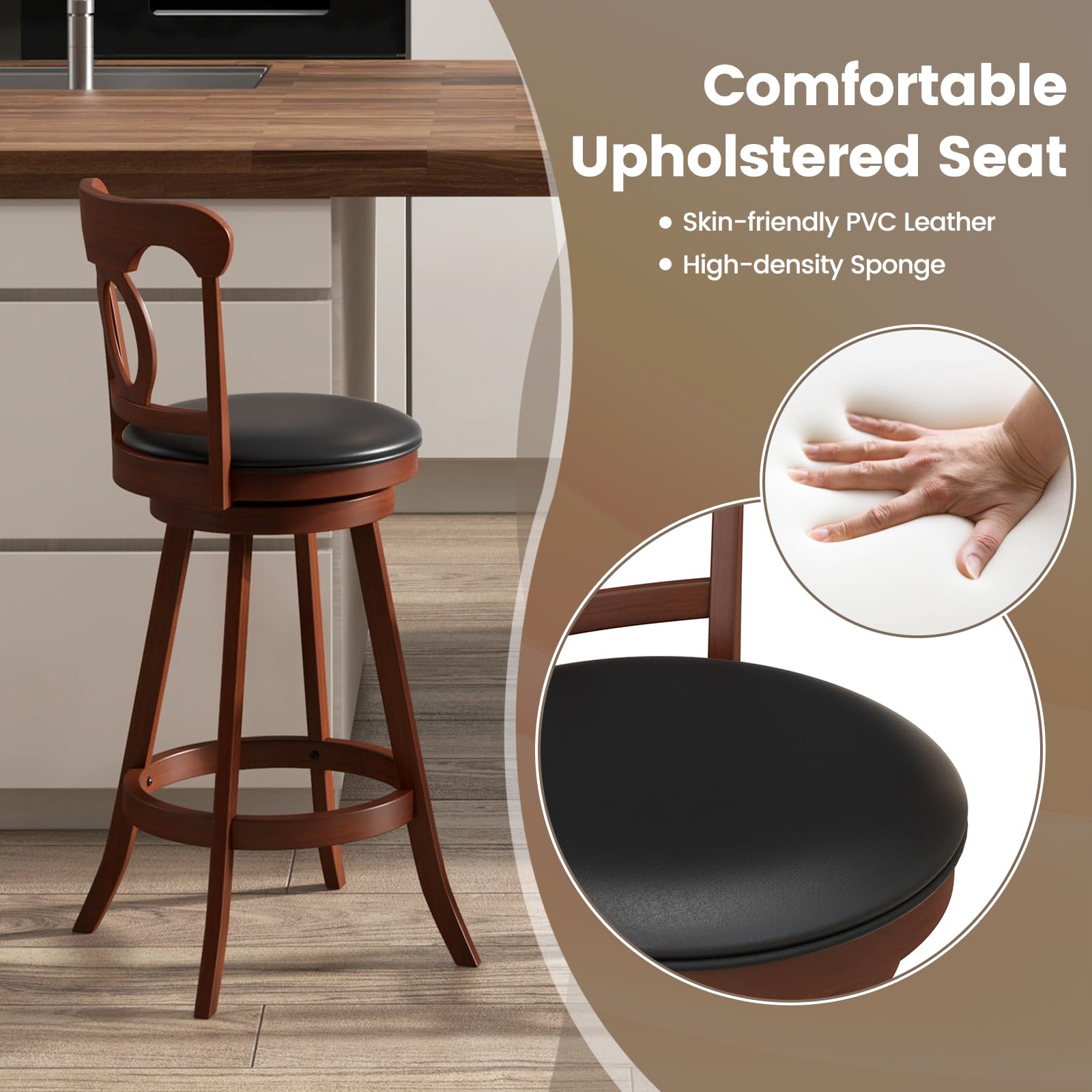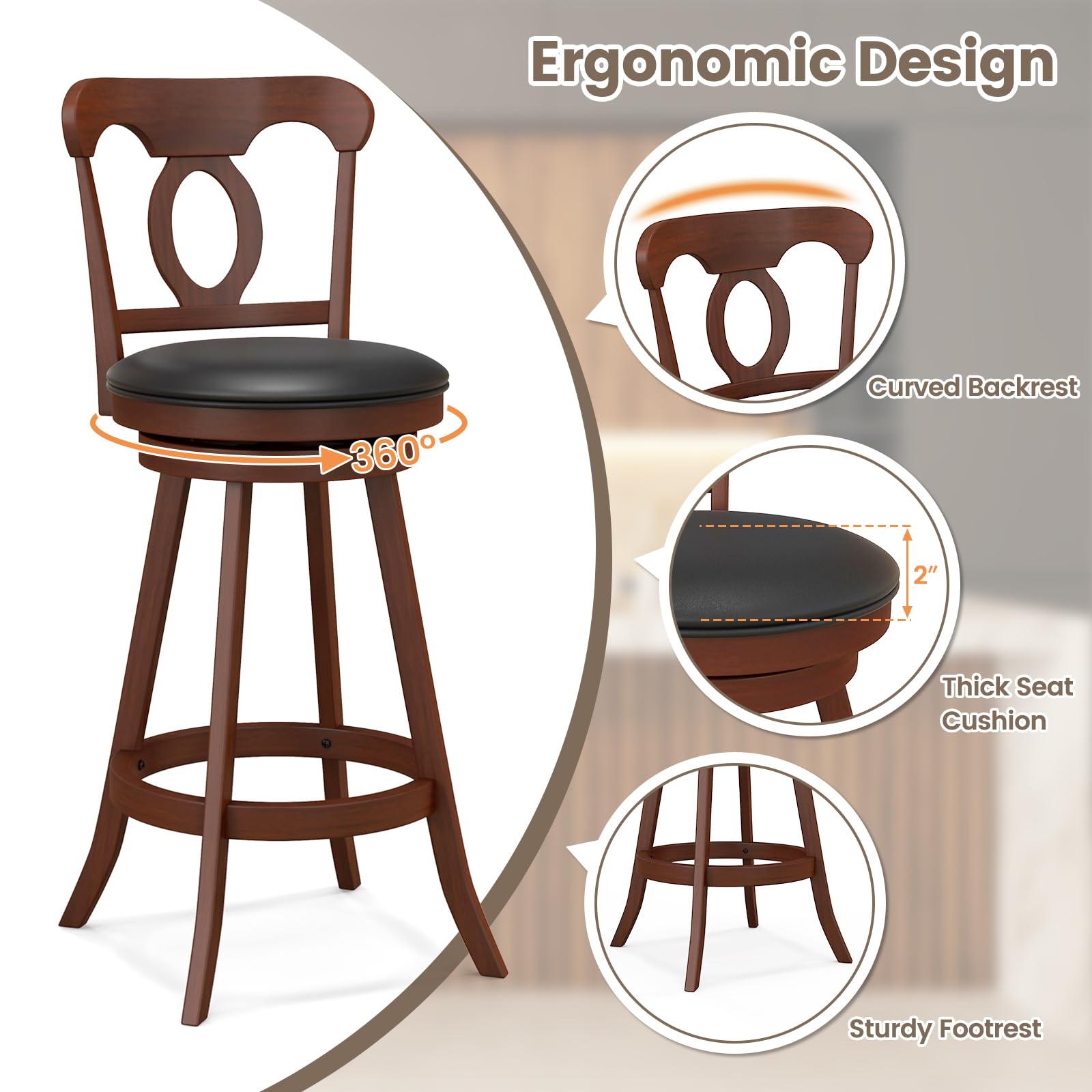 Indulge in the ultimate comfort with our breathtaking 2-piece barstools - the perfect addition to your moments of leisure and joyous gatherings! Featuring a 360-degree swivel chassis, impress your guests with effortless conversation as they sit comfortably on the ergonomic backrest that provides solid support and pressure relief. Rest your feet on the sturdy footrest for relaxation. Exuding a timeless charm, the solid rubber wood frame boasts a natural style, whilst the hollow-out back adds a vintage appeal. Designed with safe round corners and non-slip foot pads, these barstools are the epitome of comfort and safety, making them an ideal choice for any home kitchen, bar, or café.