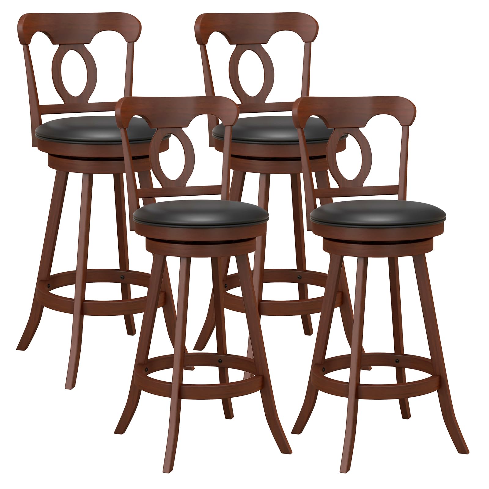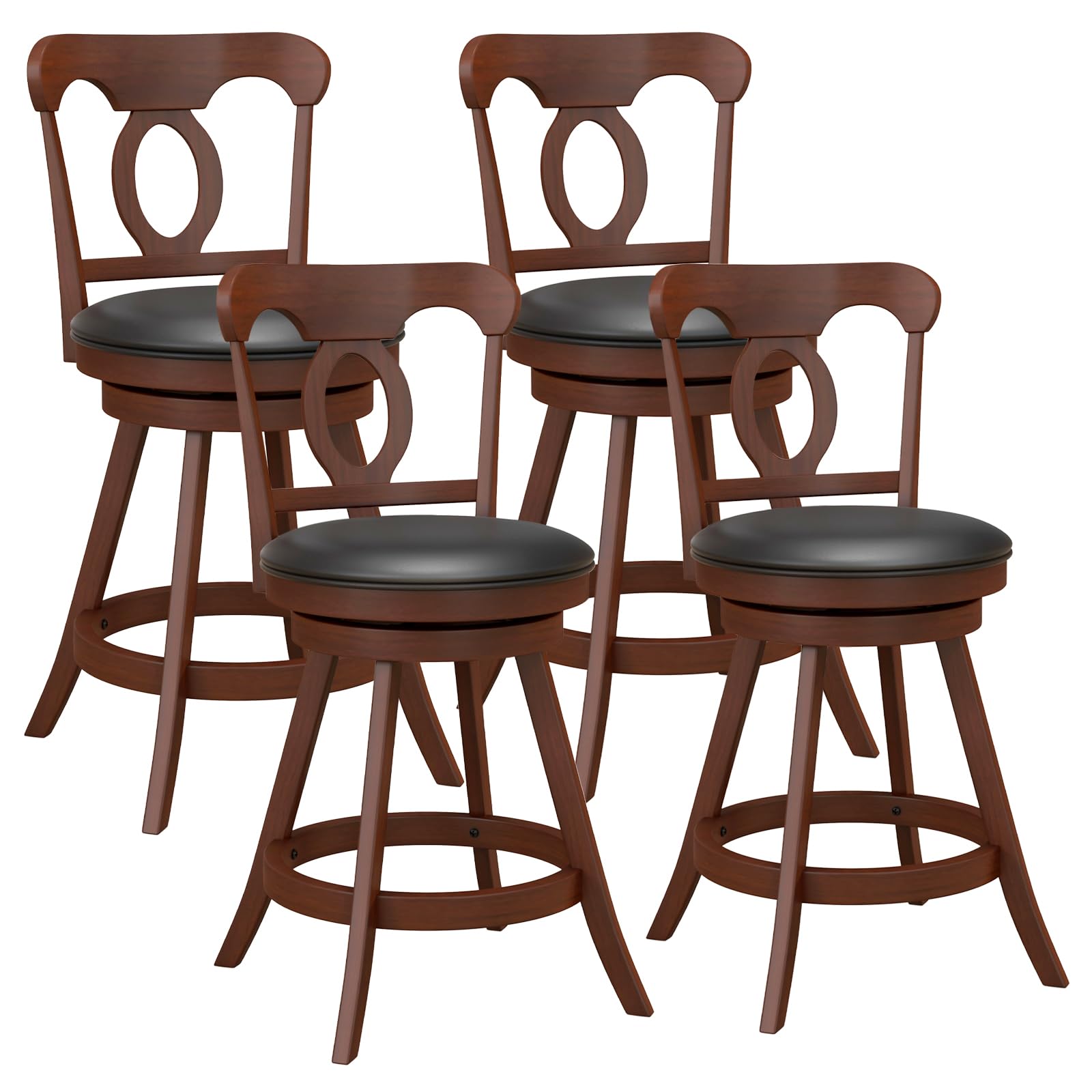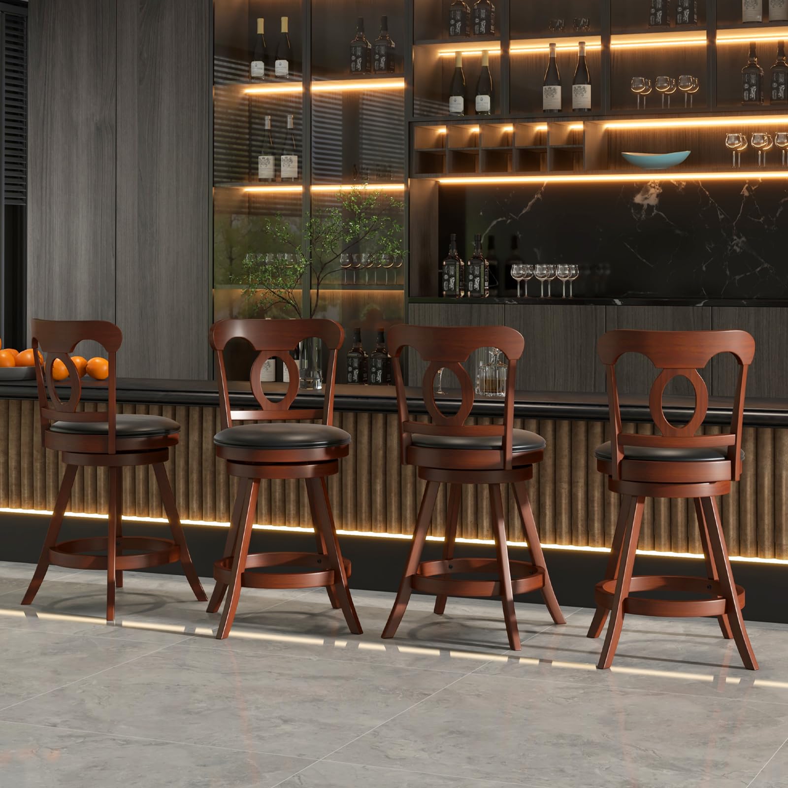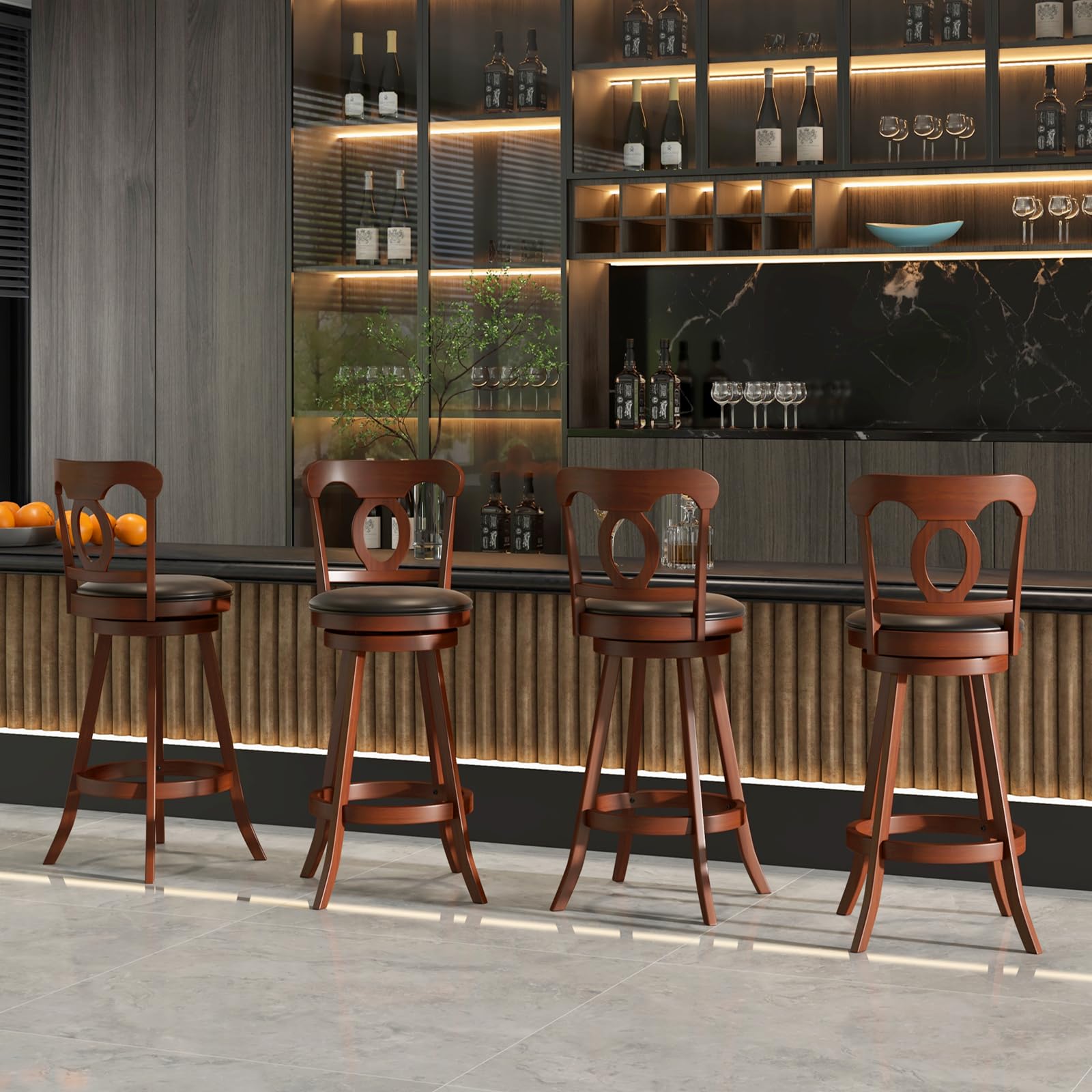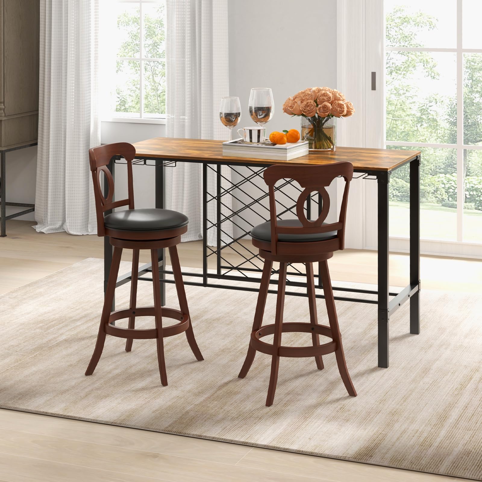 Indulge in the ultimate comfort with our breathtaking 2-piece barstools - the perfect addition to your moments of leisure and joyous gatherings! Featuring a 360-degree swivel chassis, impress your guests with effortless conversation as they sit comfortably on the ergonomic backrest that provides solid support and pressure relief. Rest your feet on the sturdy footrest for relaxation. Exuding a timeless charm, the solid rubber wood frame boasts a natural style, whilst the hollow-out back adds a vintage appeal. Designed with safe round corners and non-slip foot pads, these barstools are the epitome of comfort and safety, making them an ideal choice for any home kitchen, bar, or café.