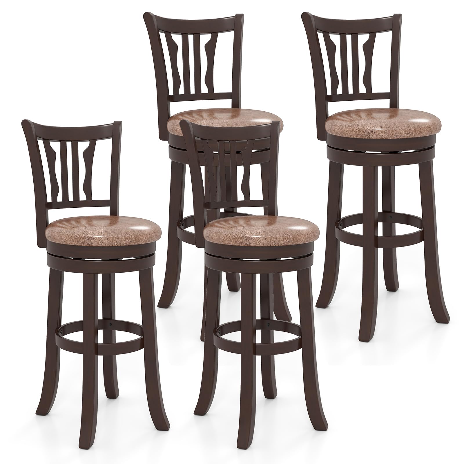These tall island chairs offer a 360° swivel seat that enhances your flexibility, perfect for socializing in any bustling setting. Constructed from solid rubber wood, these kitchen bar stools can support up to 400 lbs each, ensuring both sturdiness and longevity. Upholstered in skin-friendly faux leather and padded with soft sponge, the swivel barstools provide a cozy sitting experience. Additionally, the curved backrests and built-in footrests add an extra layer of comfort, making them ideal for enjoying meals or casual drinks at your counter height tables.