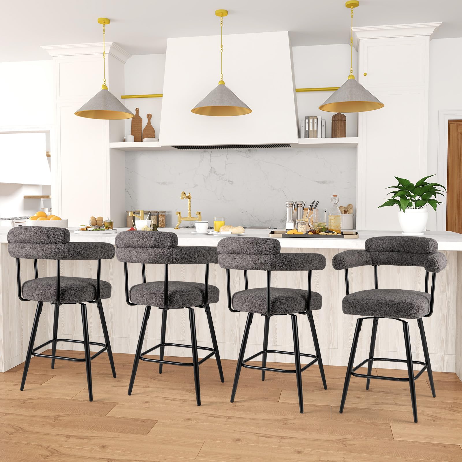 Transform your space with our boucle upholstered swivel bar stools! Sink into the luxury of plush boucle fabric and supreme comfort with each seating! Our bar stools aren't just gorgeously inviting but built to cater to your lively spirit with a fun 360-degree swivel feature—turn every gathering into a vibrant celebration! Their stellar construction can bear up to an impressive 330 lbs, and with adjustable foot pads, say goodbye to wobbles and floor scratches. Perfect ergonomics are at play, thanks to tailored curves and a robust footrest, ideal for extended chill-outs. Standing majestically at 27 inches, these stools are a match made in heaven for nearly any counter or bar, enhancing your kitchen island, home bar, or cafe effortlessly with their chic, functional beauty. Upgrade your seating game today and dazzle your guests with unrivaled elegance and comfort!