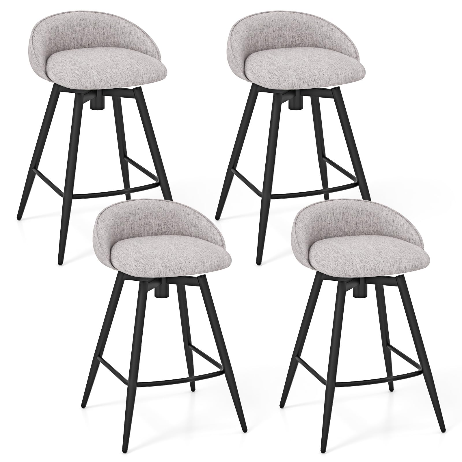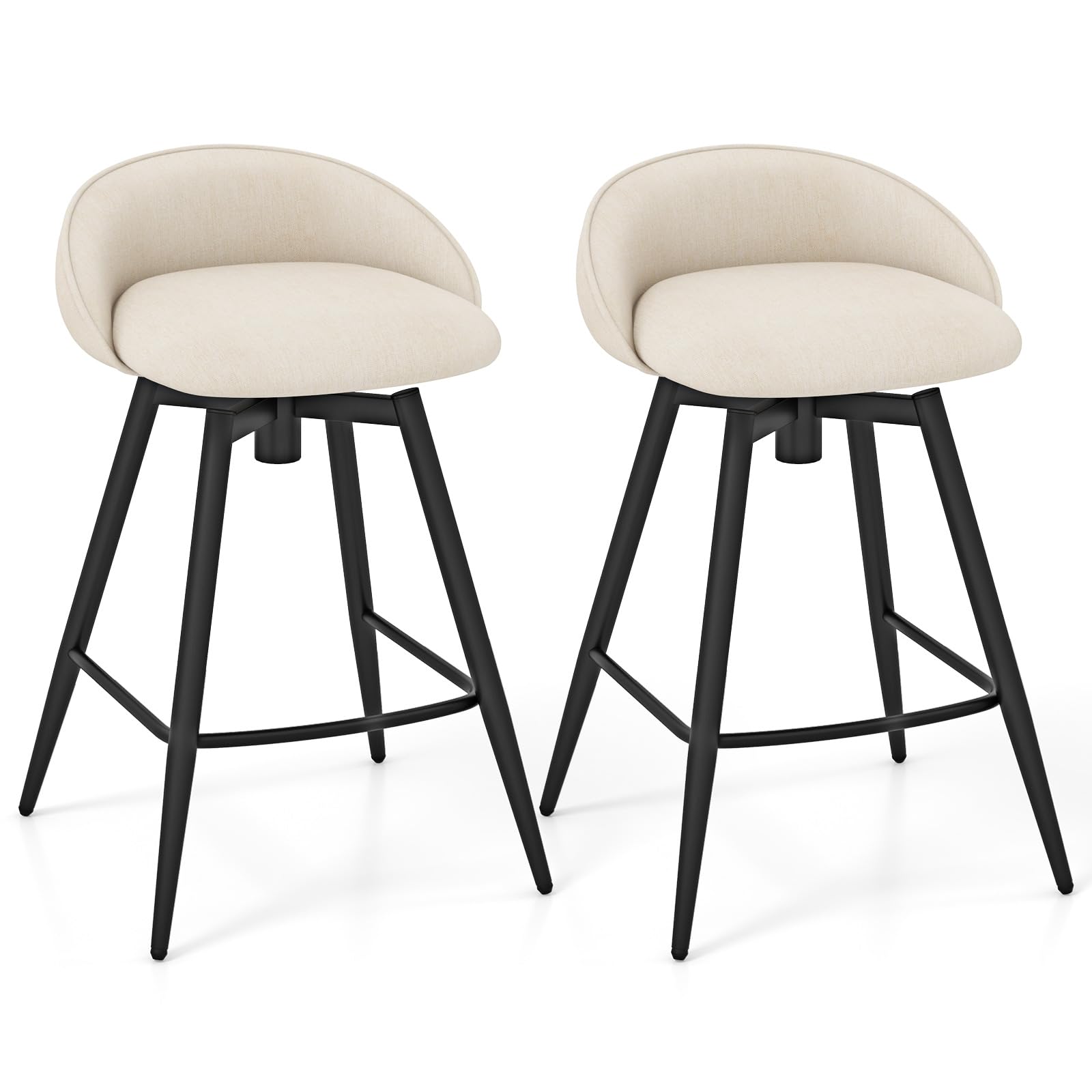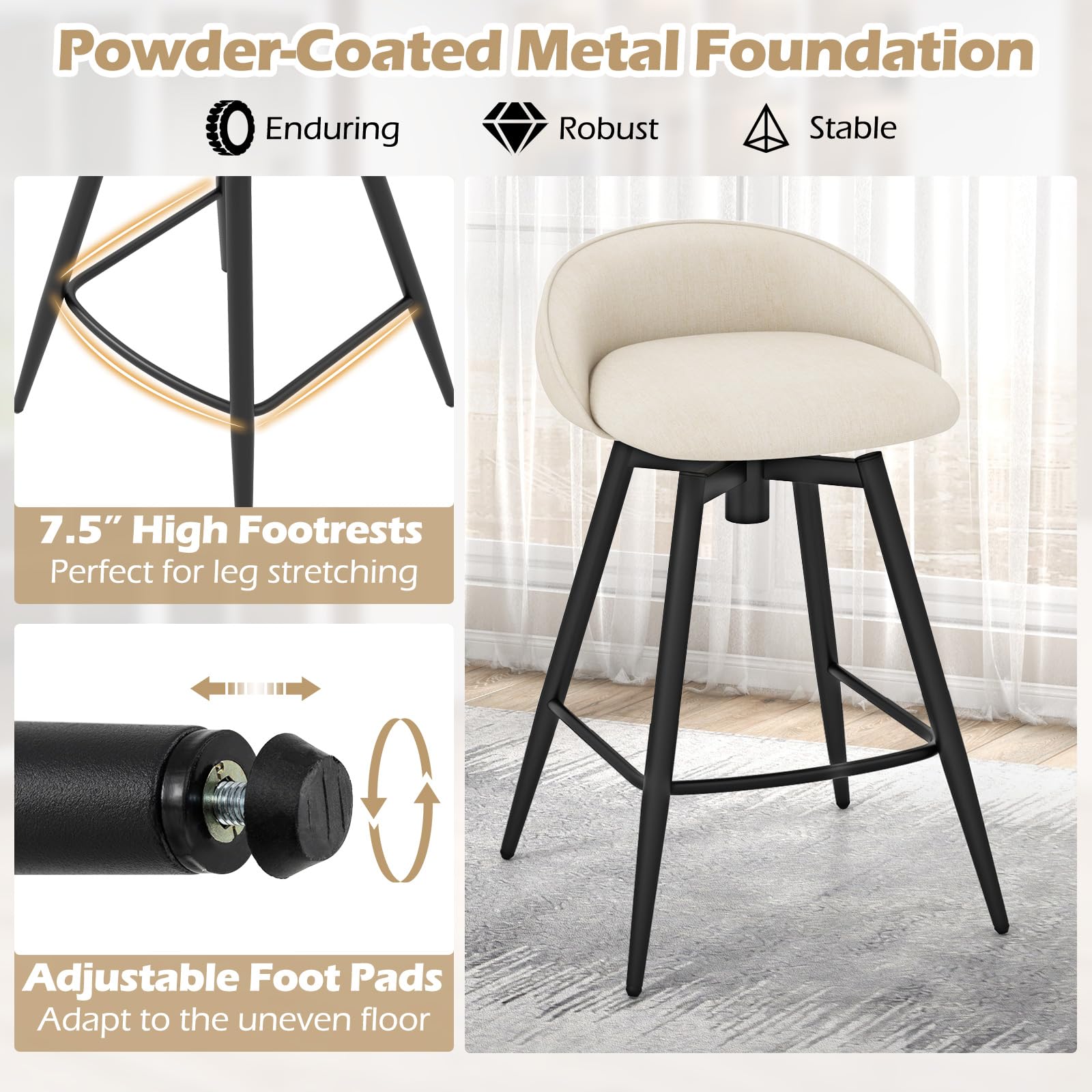 These bar stools are designed for optimal seating comfort, with a swivel seat upholstered in breathable linen fabric and thick padding. The sturdy metal structure ensures stability and supports a weight of up to 330 lbs, while adjustable foot pads promote the stability. Each counter stool features an integrated seat that allows for smooth, low-noise operation. Thanks to 7.5" high footrests, these bar chairs are perfect for relaxation and leg stretching. Their sleek and modern design seamlessly blends into a variety of settings, fitting well with tables ranging from 35” to 39” in height.