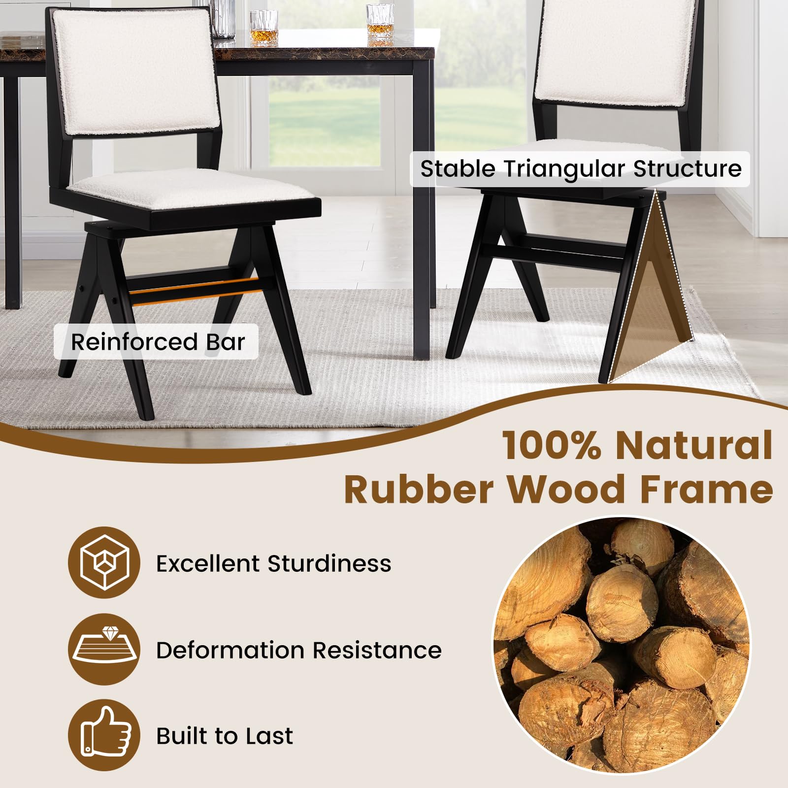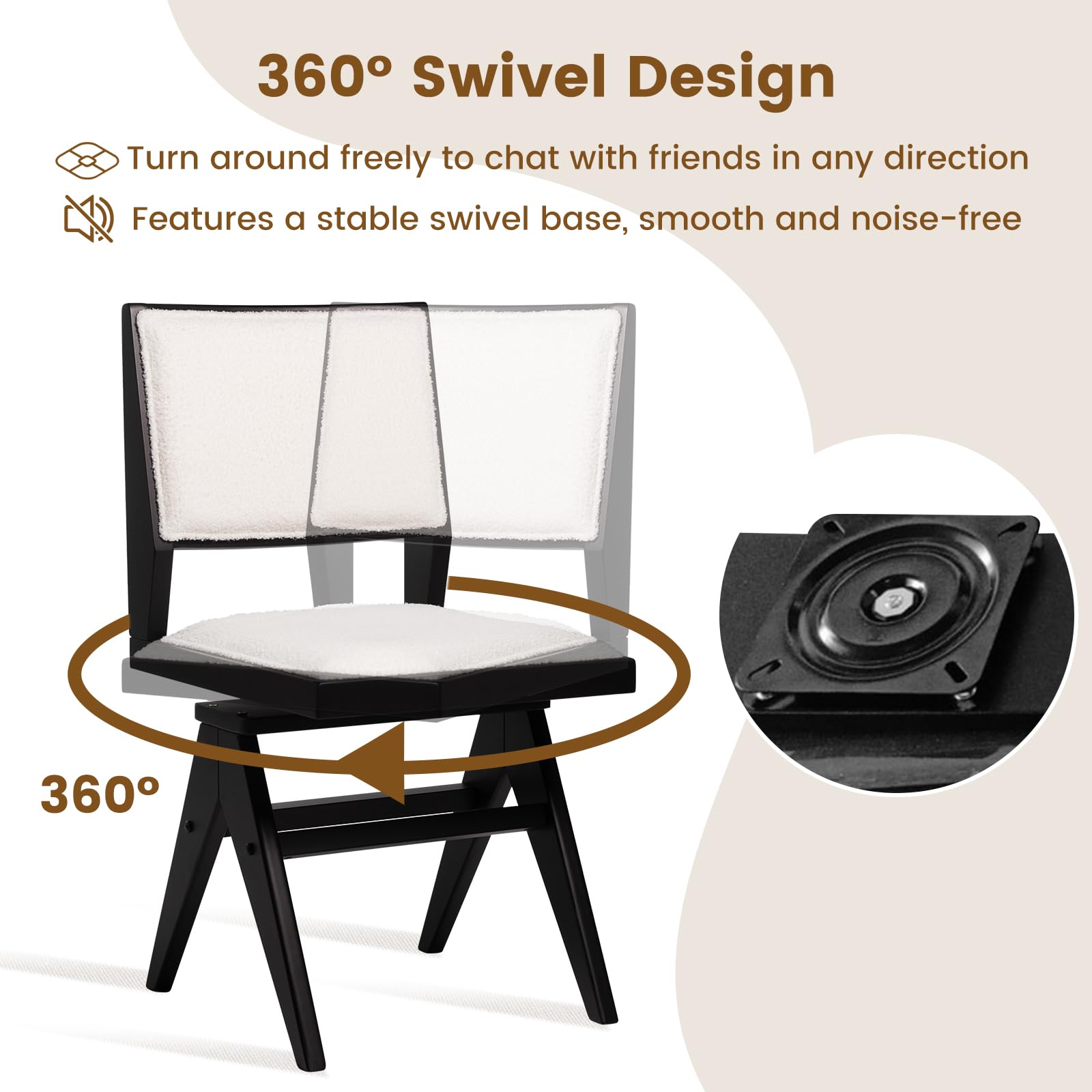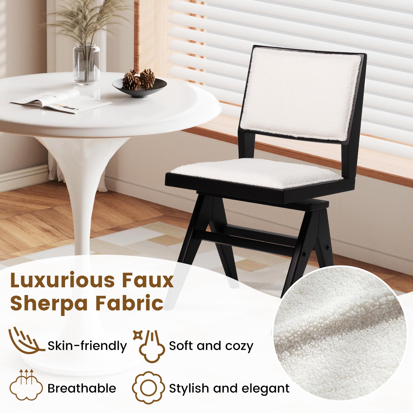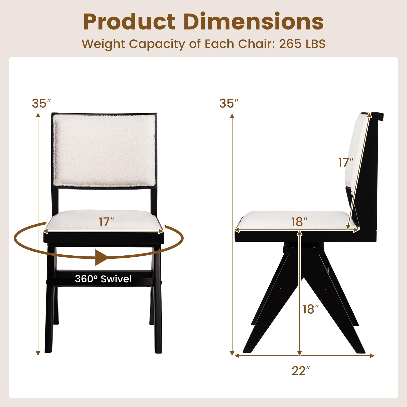 Our swivel dining chair set measures 17" x 22" x 35" (L x W x H), the seat measures 17" x 18" (L x W), and the seat height is 18". The first standout feature is the 360° swivel design, allowing you to easily turn around and engage in conversations without having to move the chair. Moreover, the chairs are upholstered in faux sherpa fabric, creating a soft and inviting feel. The plush material covers both the backrests and seats, ensuring a cozy seating experience. Additionally, supported by solid rubber wood frames, these chairs are built to withstand daily use and provide long-lasting support. Whether for residential and commercial uses, our swivel dining chair set can be a perfect choice!
