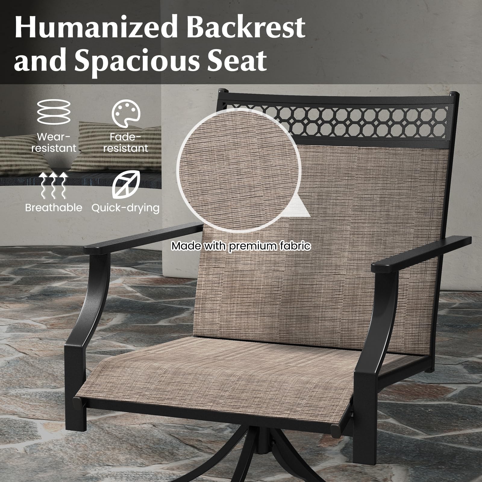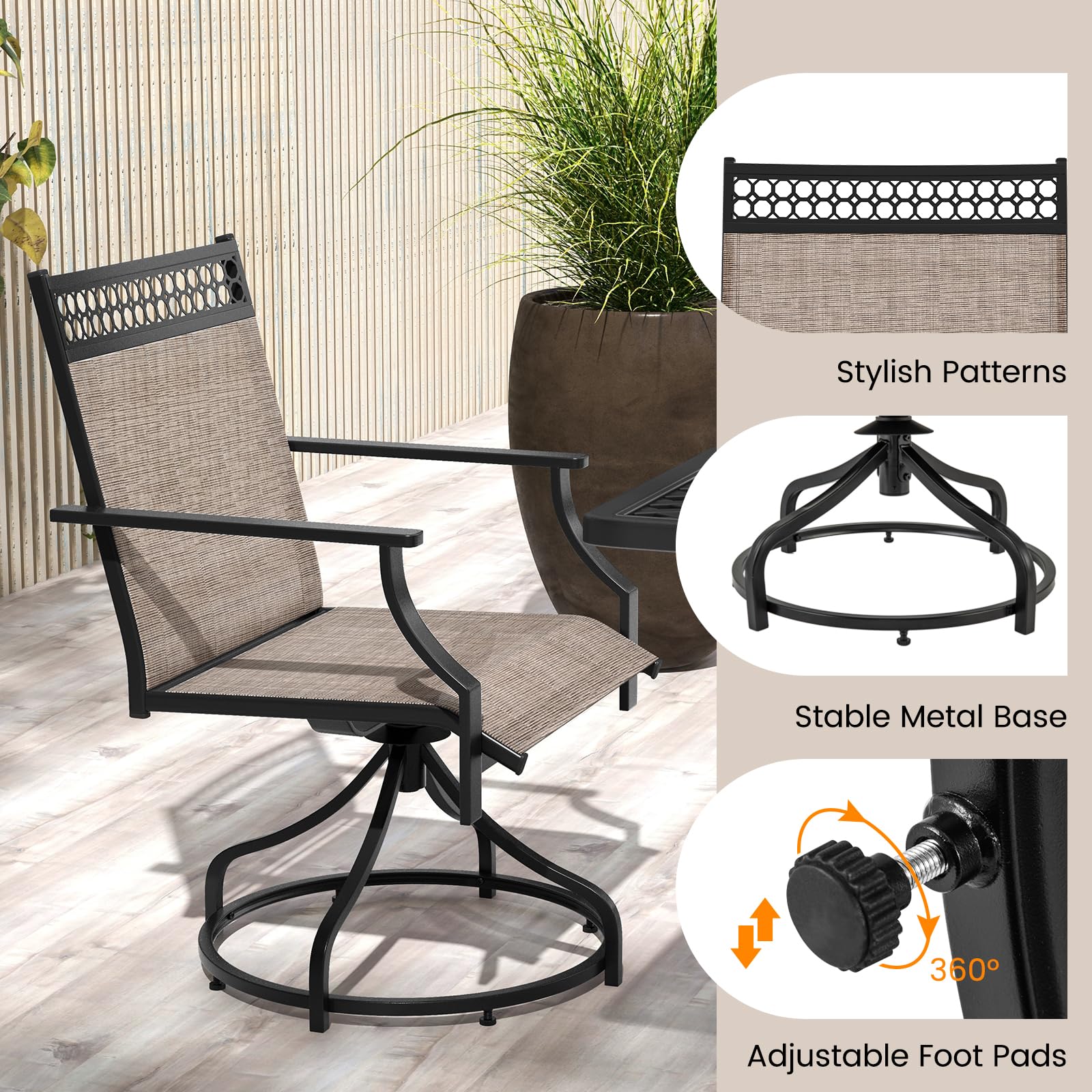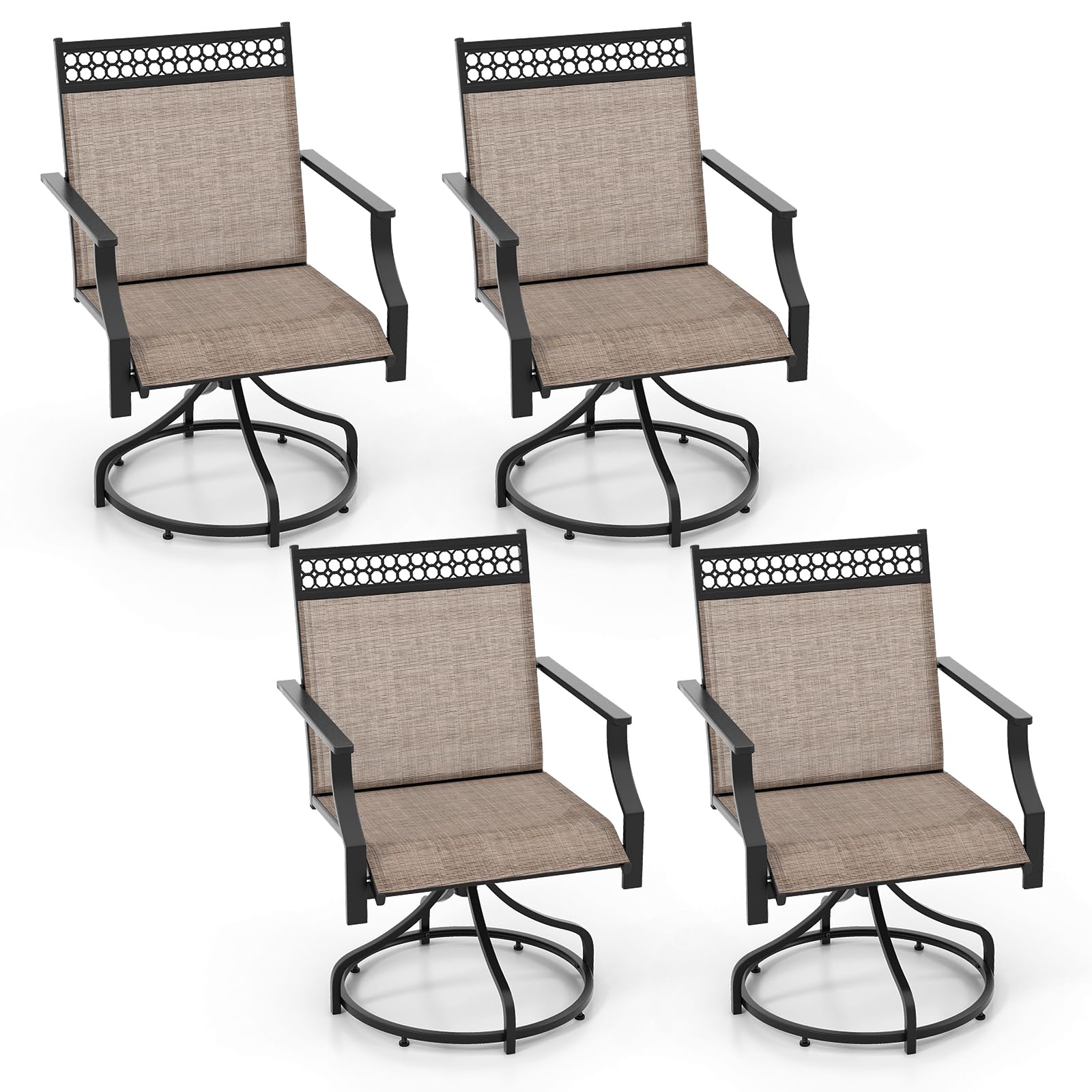 Make a stylish statement in your outdoor area with our patio swivel chairs set of 4! Designed for optimal relaxation, these patio swivel chairs feature a 360° swivel function. Each chair features a humanized backrest, curved armrests, and a spacious seat, ensuring long-lasting comfort. The breathable, quick-drying fabric is not only cool to touch but also resistant to wear and fading. The sturdy metal frame provides stability, with a weight capacity of 400 lbs, making these chairs a reliable choice for your outdoor seating needs. Adjustable foot pads ensure stability on uneven surfaces. Furthermore, the outdoor swivel chairs are perfect for any outdoor setting – whether it’s your backyard, garden, poolside, or patio.