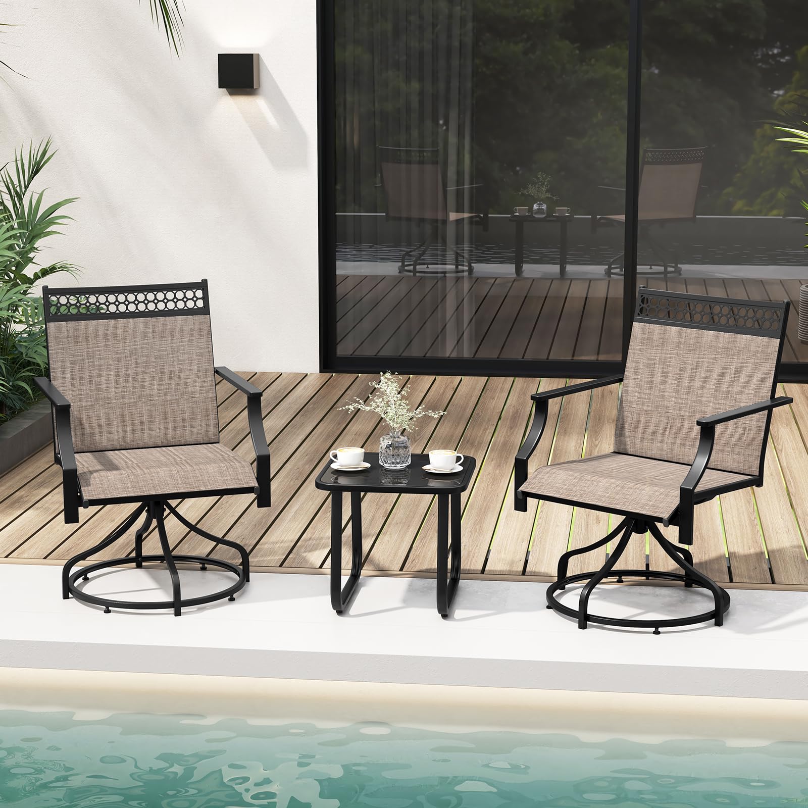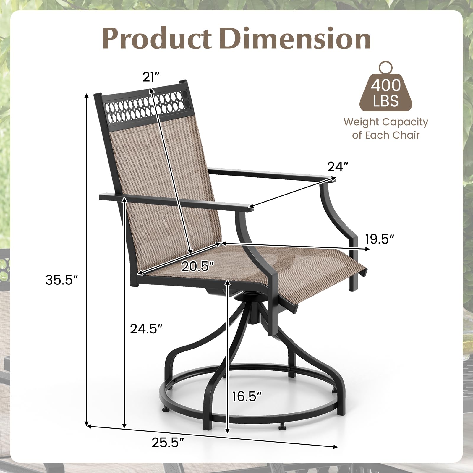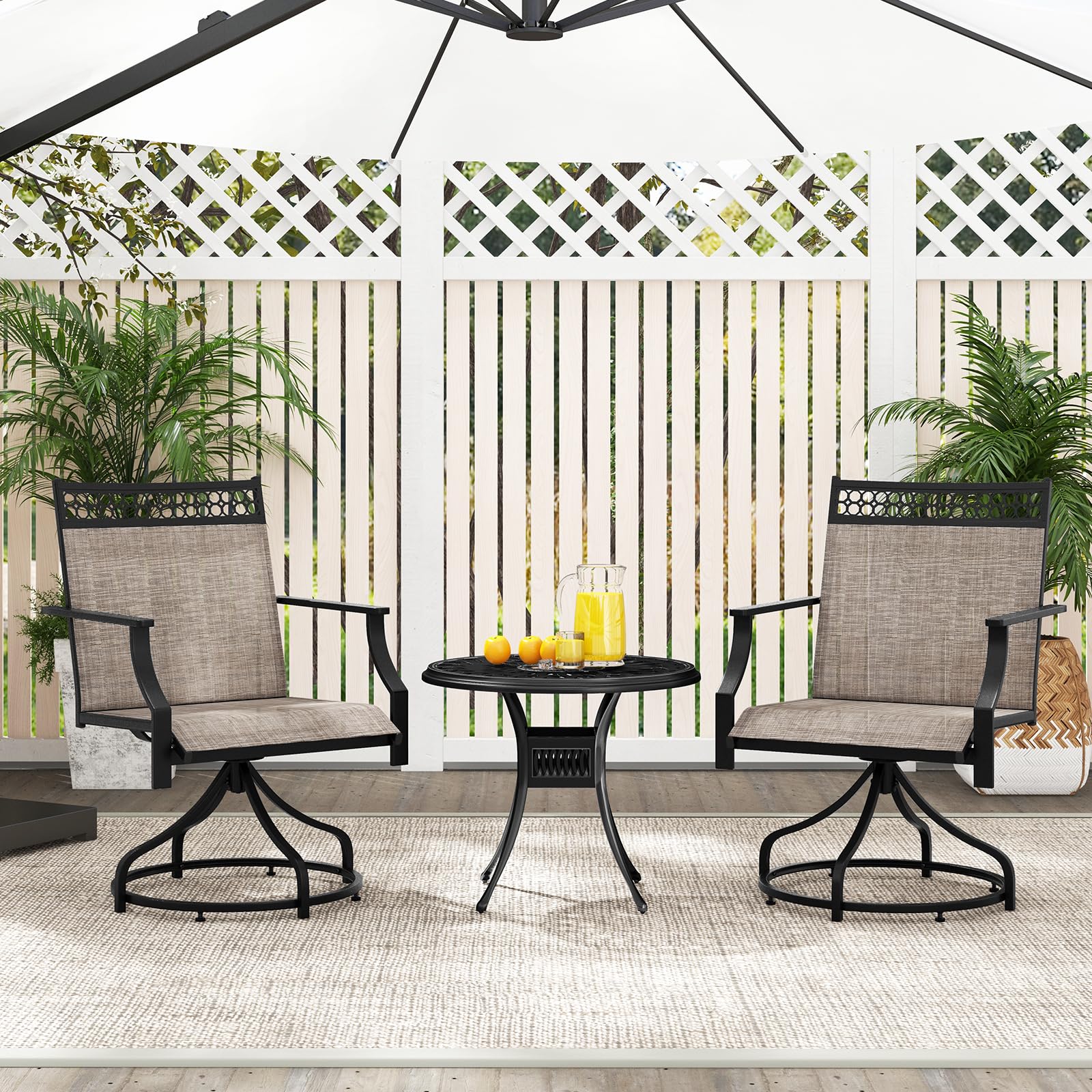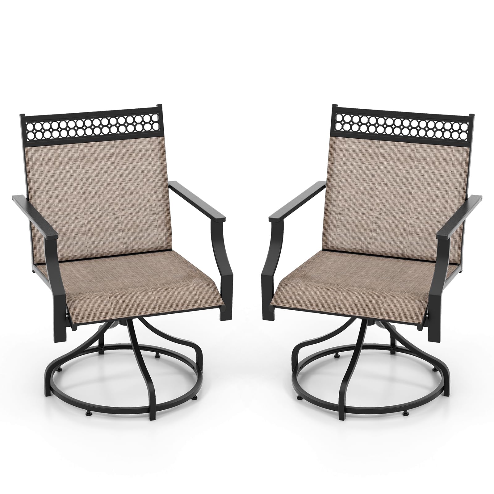 Make a stylish statement in your outdoor area with our patio swivel chairs set of 4! Designed for optimal relaxation, these patio swivel chairs feature a 360° swivel function. Each chair features a humanized backrest, curved armrests, and a spacious seat, ensuring long-lasting comfort. The breathable, quick-drying fabric is not only cool to touch but also resistant to wear and fading. The sturdy metal frame provides stability, with a weight capacity of 400 lbs, making these chairs a reliable choice for your outdoor seating needs. Adjustable foot pads ensure stability on uneven surfaces. Furthermore, the outdoor swivel chairs are perfect for any outdoor setting – whether it’s your backyard, garden, poolside, or patio.