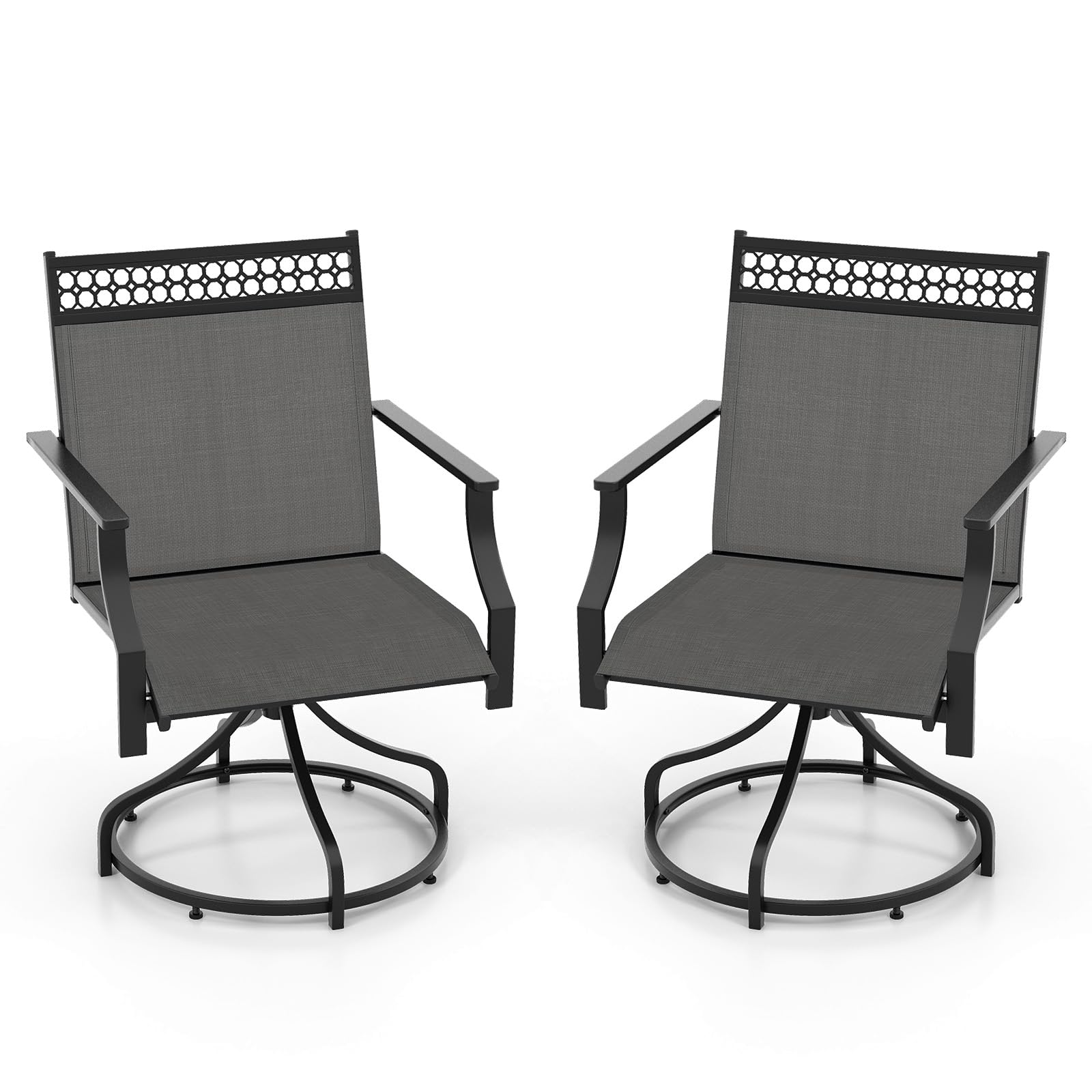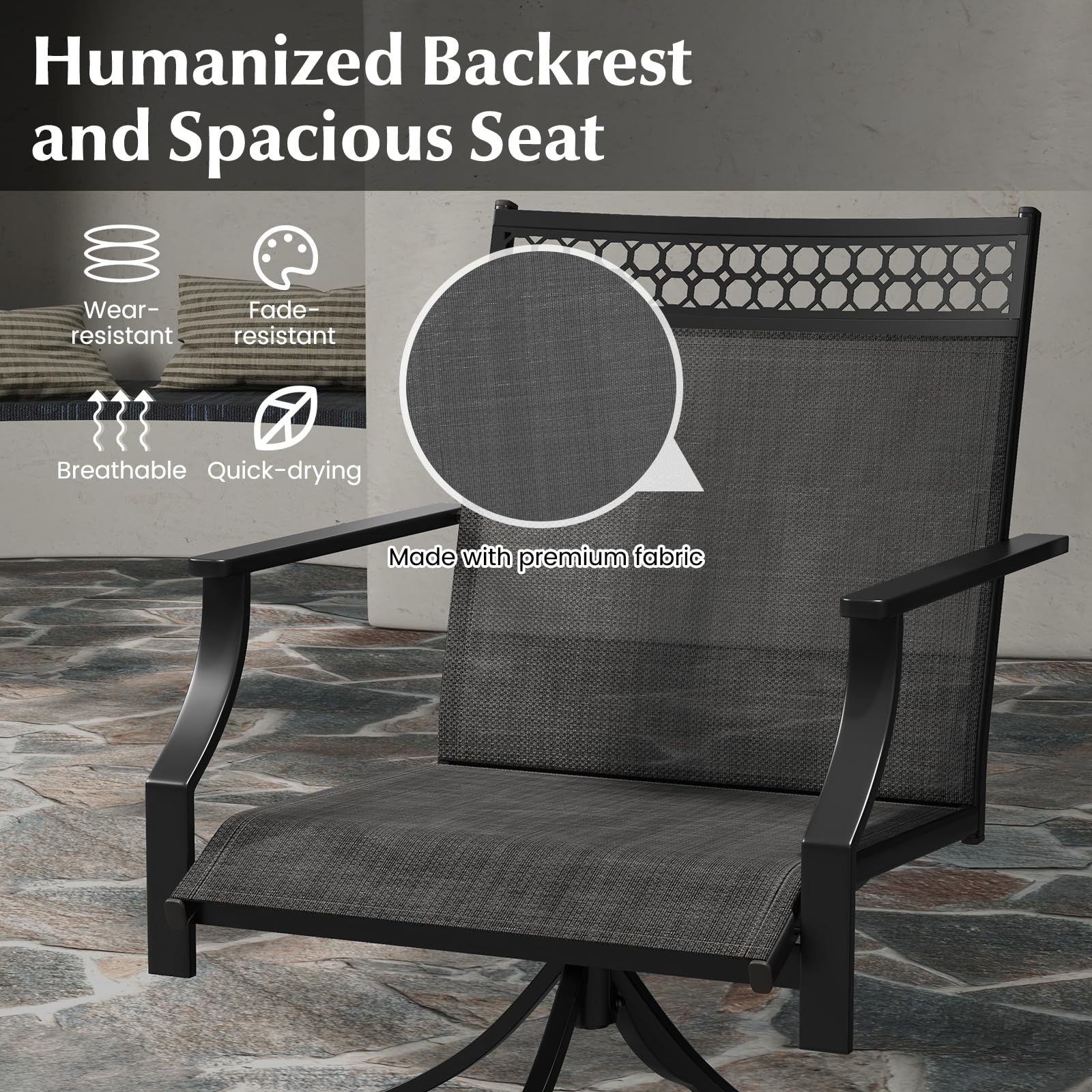 Make a stylish statement in your outdoor area with our patio swivel chairs set of 2! Designed for optimal relaxation, these patio swivel chairs feature a 360° swivel function. Each chair features a humanized backrest, curved armrests, and a spacious seat, ensuring long-lasting comfort. The breathable, quick-drying fabric is not only cool to touch but also resistant to wear and fading. The sturdy metal frame provides stability, with a weight capacity of 400 lbs, making these chairs a reliable choice for your outdoor seating needs. Adjustable foot pads ensure stability on uneven surfaces. Furthermore, the outdoor swivel chairs are perfect for any outdoor setting – whether it’s your backyard, garden, poolside, or patio.
