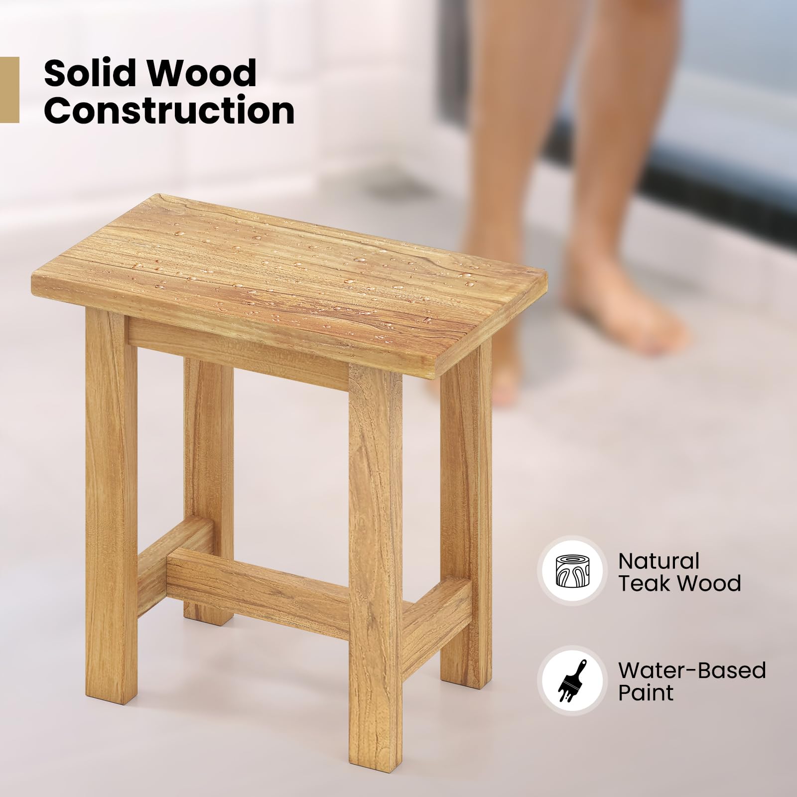 Made of natural and sturdy teak wood, this shower bench stool is finished with a water-based paint for an elegant aesthetic and long-lasting durability. Built with thickened panels and crossbars, the waterproof shower seat provides superior stability. Its versatility extends beyond a mere shower chair, as it can also be used as a shoe bench or a side table, fulfilling various needs like applying lotion, shaving legs, or simply relaxing. Additionally, this spa bath seat is a perfect addition to your living space, from your bathroom to the poolside.