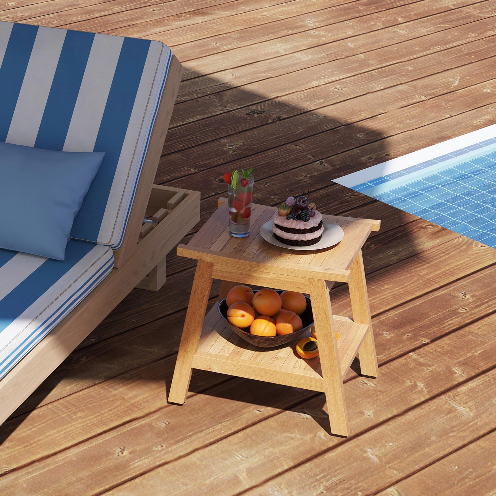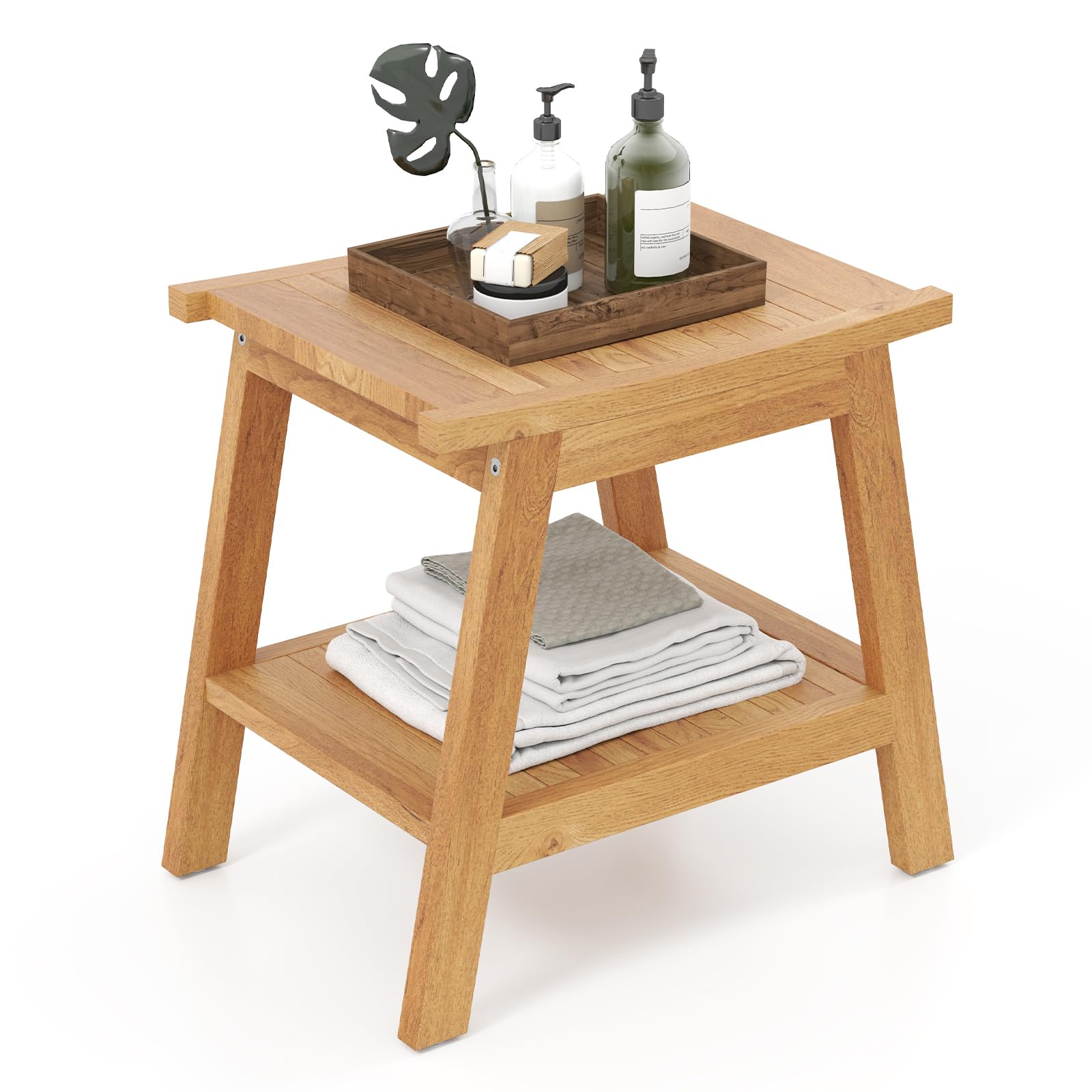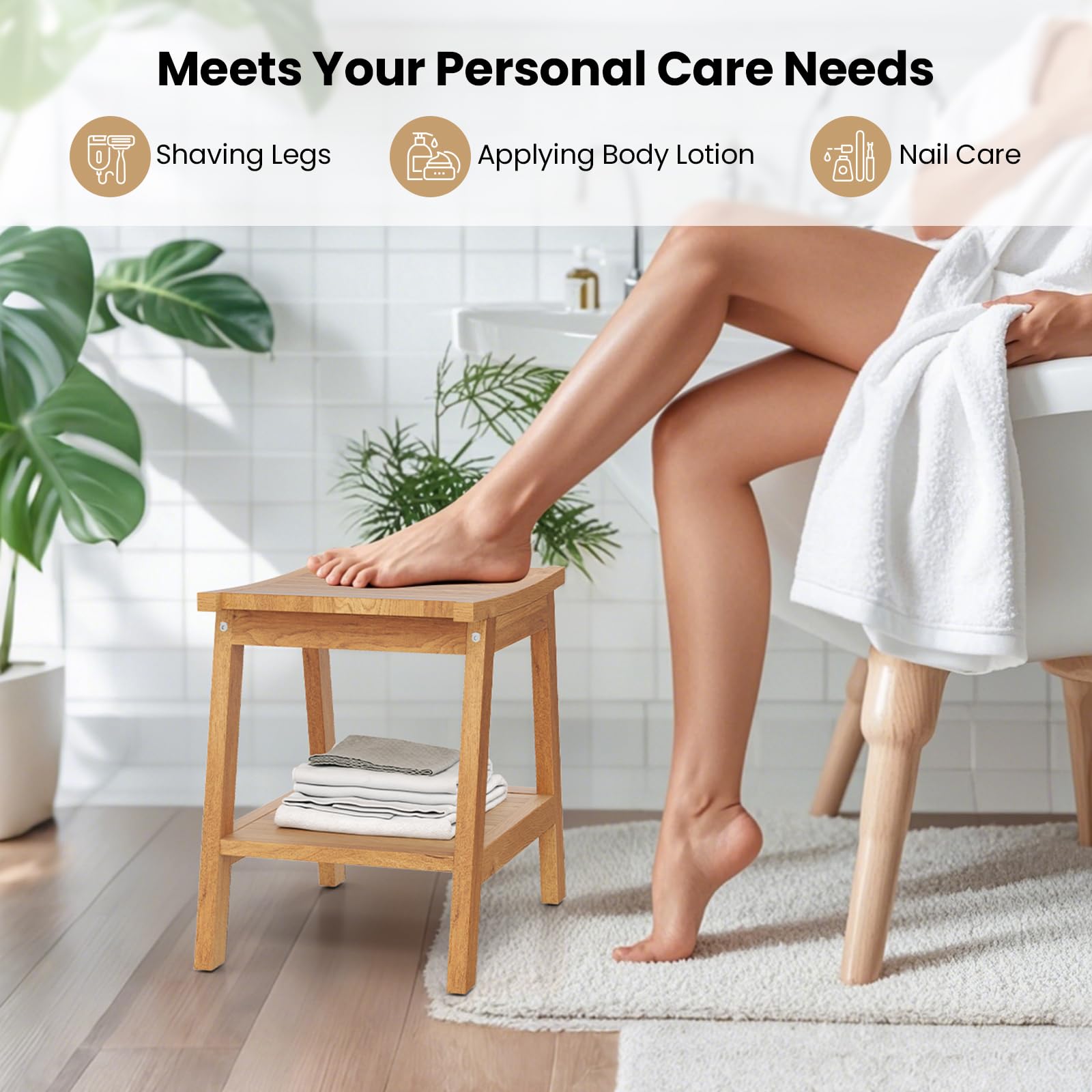 Crafted from solid Indonesian teak, our shower bench is tough, stylish, and built to last. The ergonomic seat keeps you comfy, and the lower shelf keeps your shower must-haves organized and dry, thanks to its quick-draining slats. Below, 4 adjustable anti-slip foot pads keep the stool steady, even on uneven surfaces. But don’t let the name mislead you—our stool isn’t just for showers. Use it as a step stool for grooming, a plant stand on the balcony, or even a chic side table by the pool! And don’t worry about complicated setups—it’s mostly pre-assembled and ready to go in minutes. Make our bath stool a new highlight in your bathroom (or beyond) today!