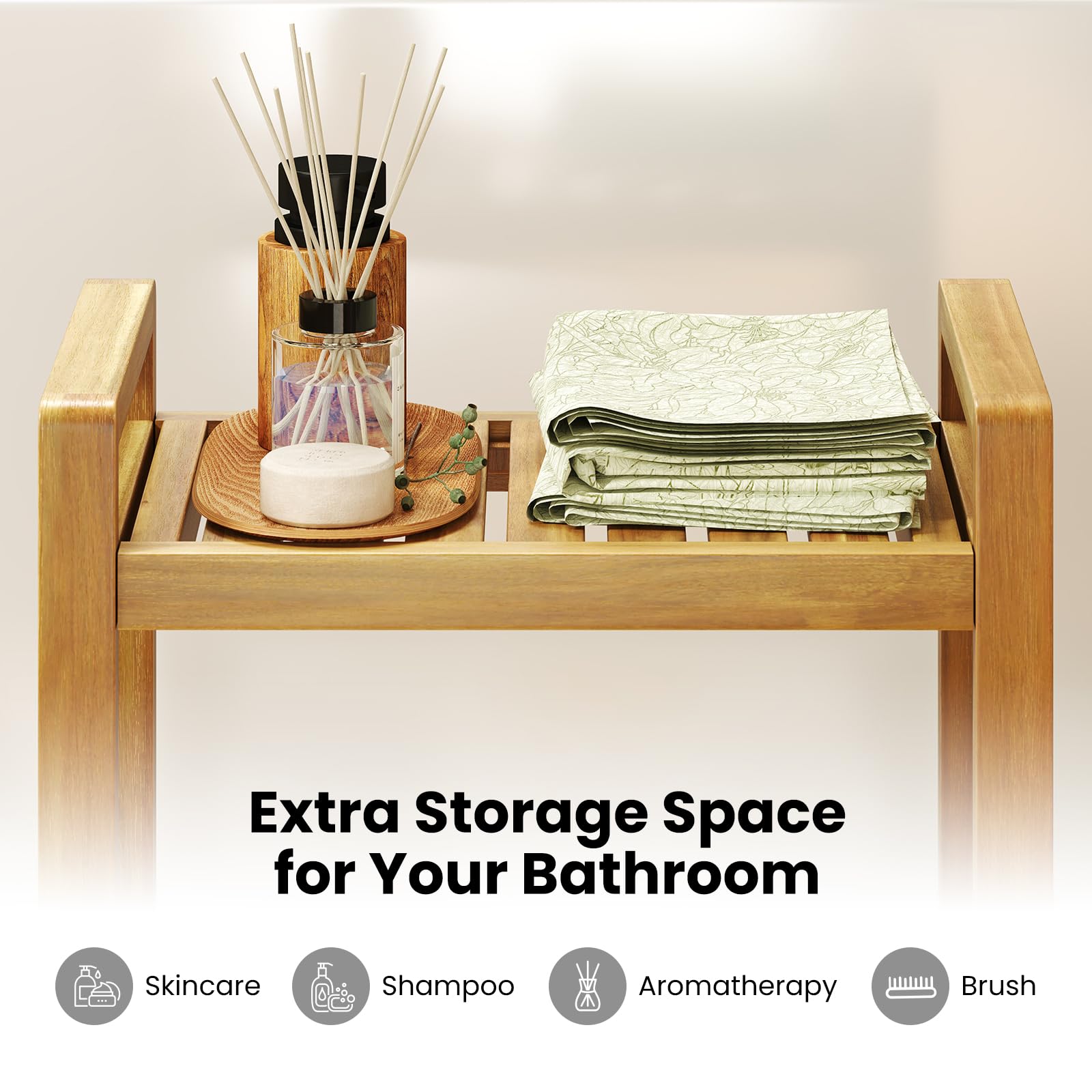 - [Practical Storage Solution]: More than just a seating option, this teak shower bench provides extra storage for your bathroom essentials. Organize items like skincare products, shampoo, brushes, and aromatherapy tools within easy reach, effortlessly combining functionality and comfort.
