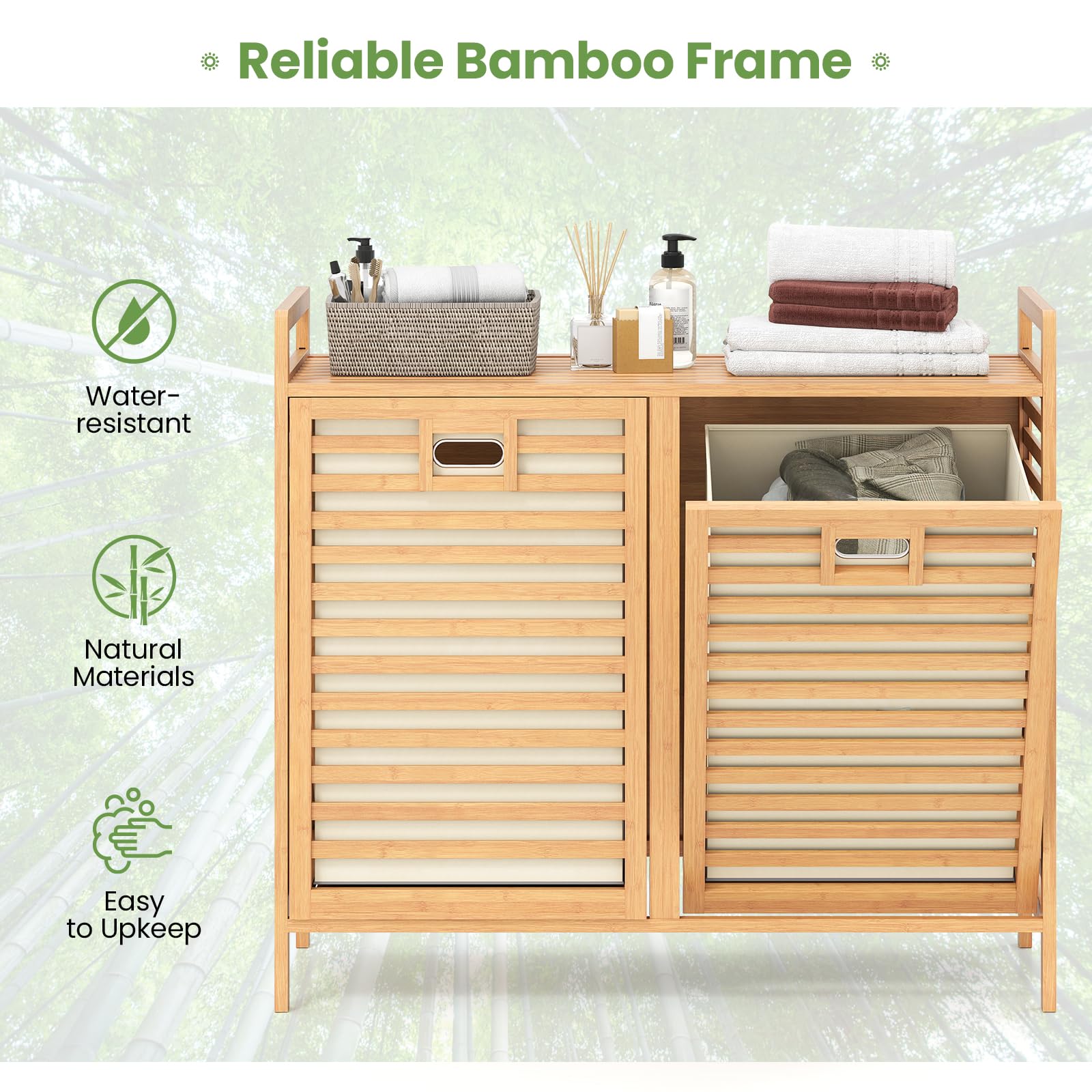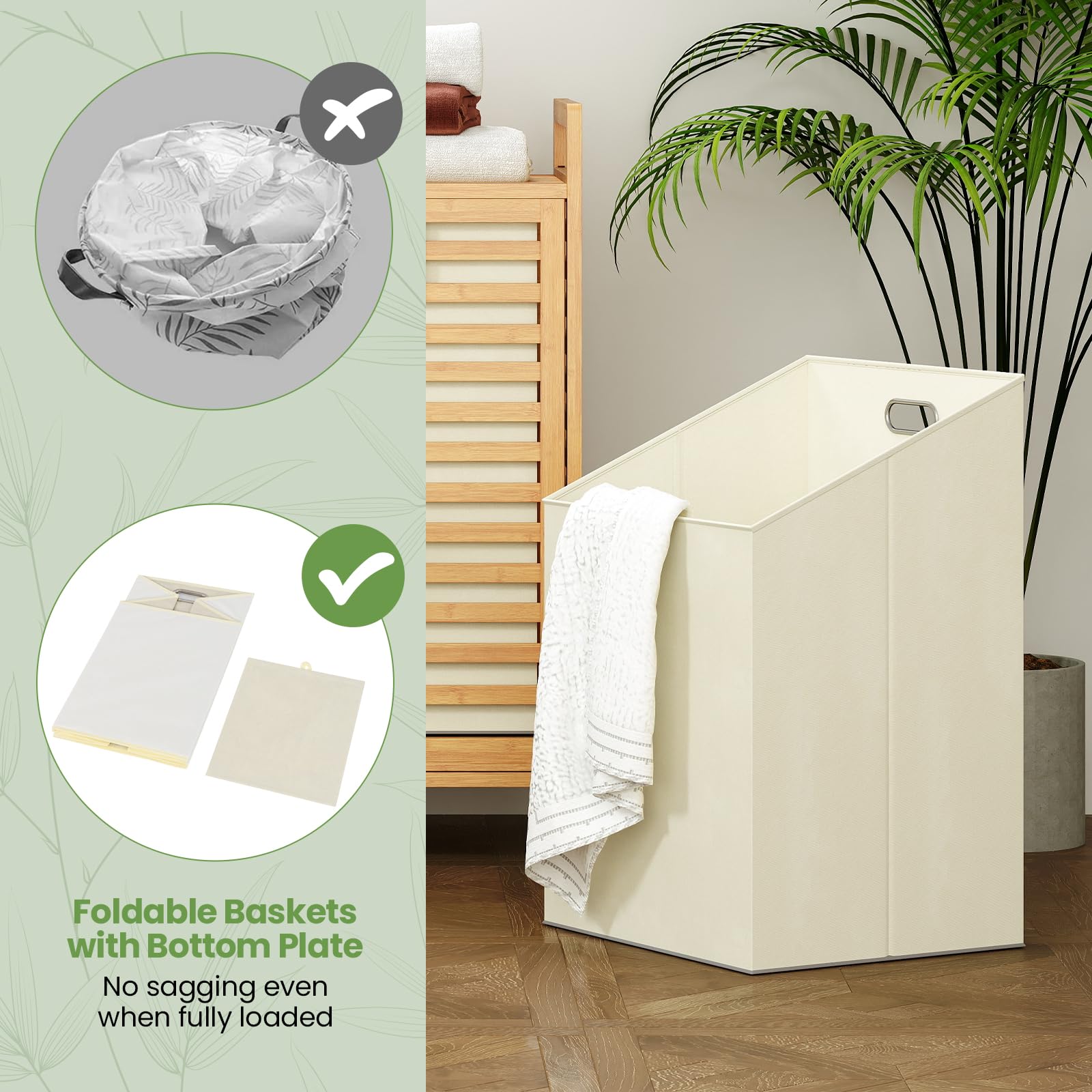 With its double tilt-out laundry cabinets, you can access your laundry with a simple pull, and easily separate light-colored laundry from darker ones. Plus, the handy top shelf stores your detergents and softeners right where you need them. The fabric baskets inside the hamper are foldable with easy-to-grab handles and sturdy bottom plates, so that you can easily carry your clothes to and from the washing machine. Its stylish bamboo frame combines natural texture with a slatted design, providing both function and appeal. Get our double tilt-out laundry hamper to better manage your laundry with less effort!