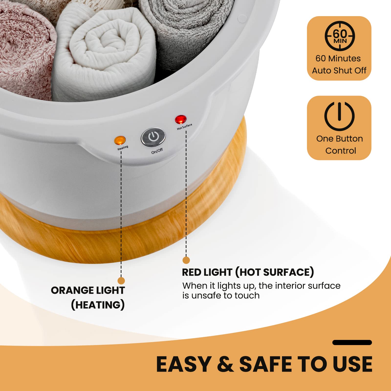 • AUTO SHUT OFF & EASY TO USE -- The tower warmer bucket will shut off automatically after 60 minutes of heating. With a One-button control and 2 indicator lights, this towel warmer is very easy to operate. When the interior surface reaches 131 Fahrenheit, the hot surface indicator will light up to remind you that the towel warmer is unsafe to touch.