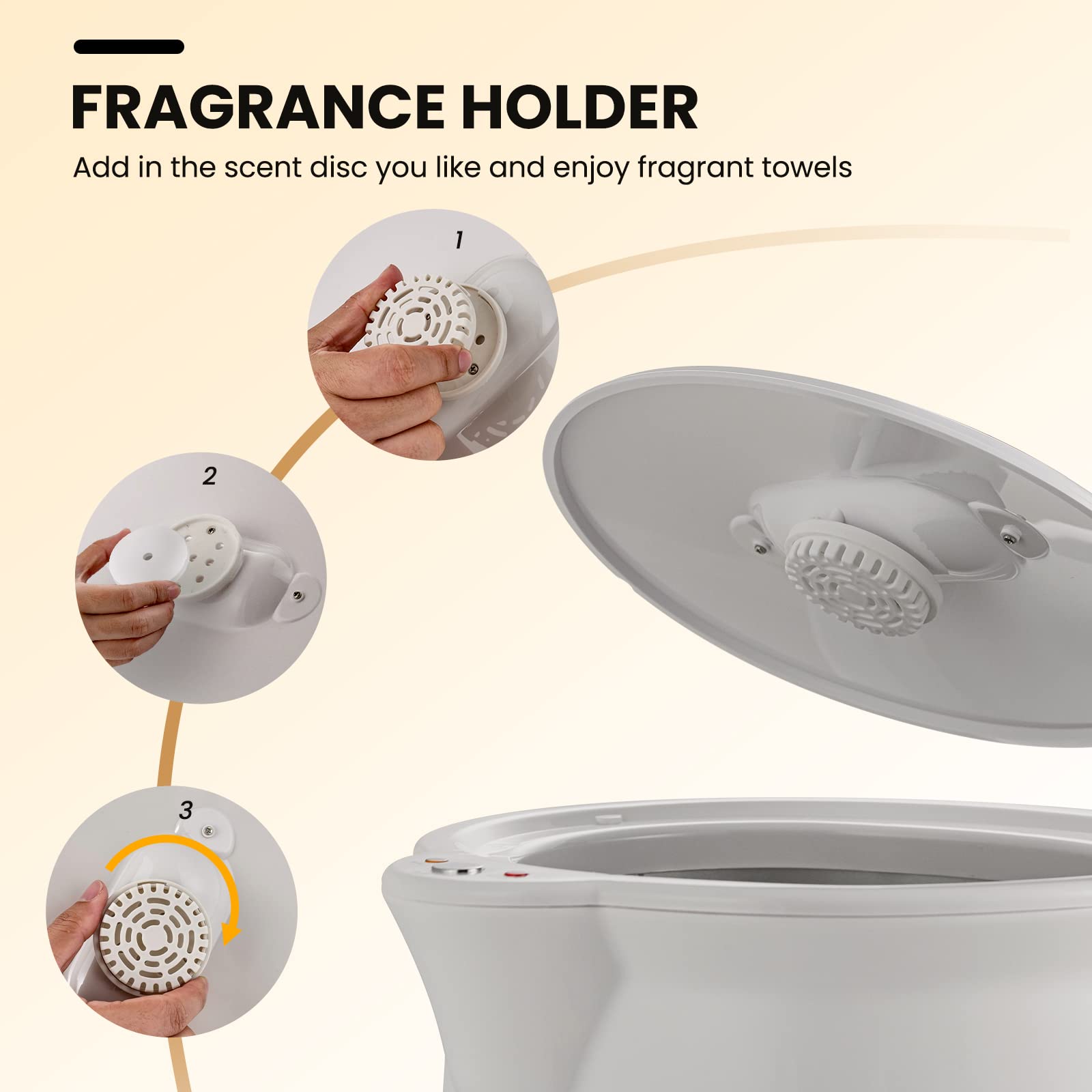 The 20L bucket-style towel warmer can accommodate up to two 40" x 70" oversized cotton bath towels or any other laundry, like bathrobes, stockings, pajamas, etc. It can heat up rapidly and warm up towels evenly. Besides, it will automatically shut off after 60 minutes of heating to ensure safety and save energy. What's more, you can also put a fragrance tablet (not included) into the fragrance holder under the lid to have a fresh and fragrant towel.