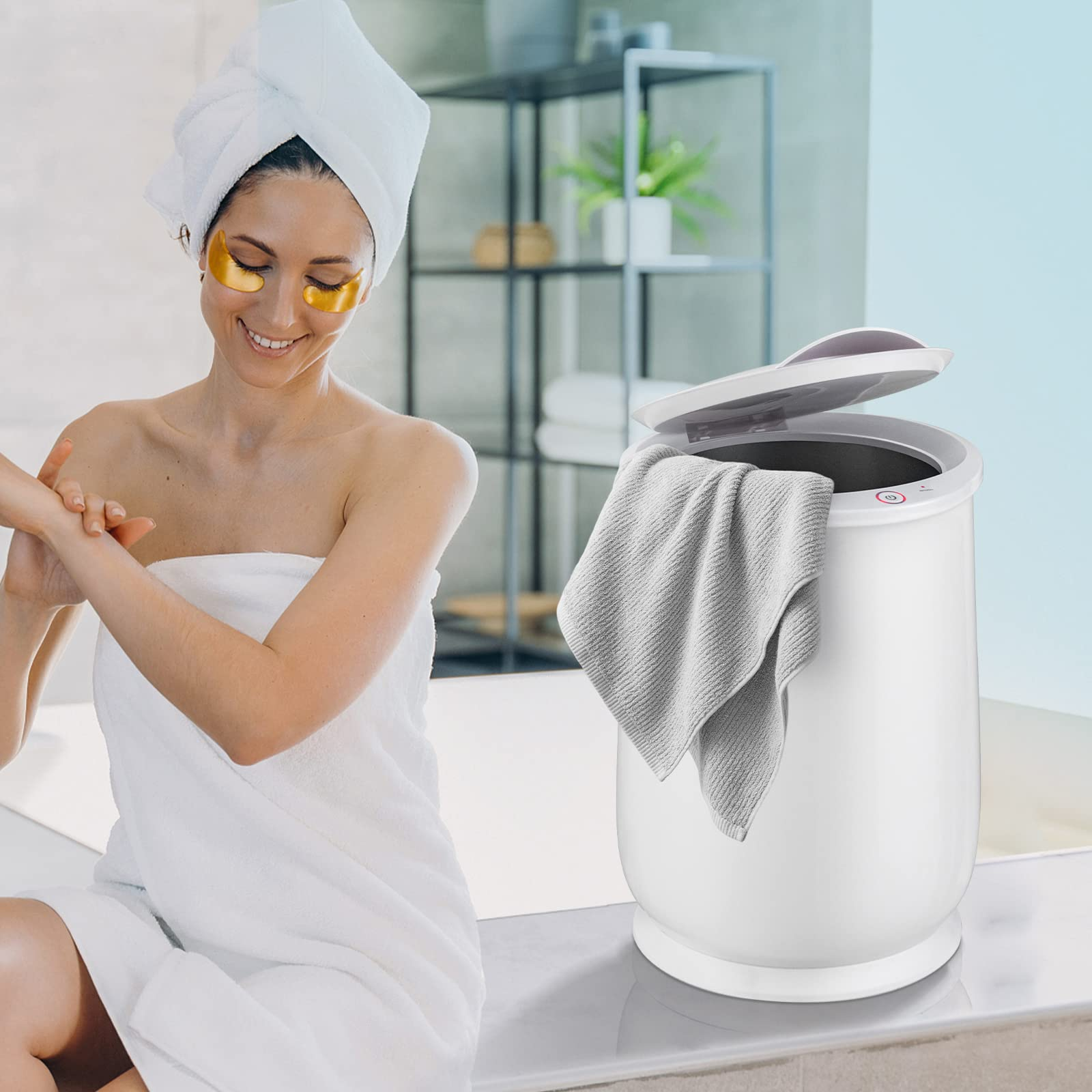 - 【21L Extra Large Capacity】: This 21L large capacity bucket style towel warmer is designed to care for the whole family. It can accommodate 2 large bath towels (45" x 70"), a bathrobe or a personal blanket. Moreover, the spa towel warmer can also work for baby clothes, underwear, pajamas, socks, etc.